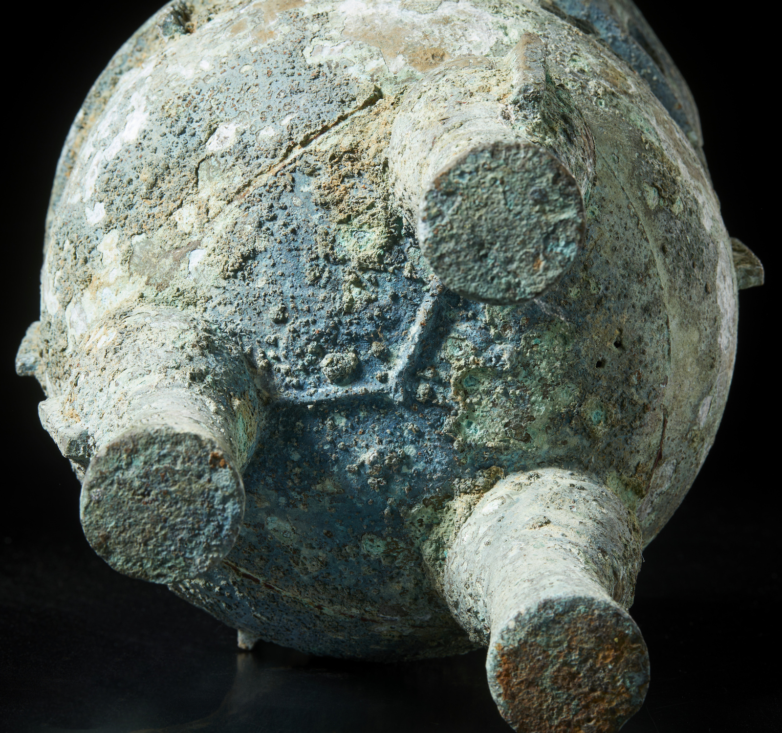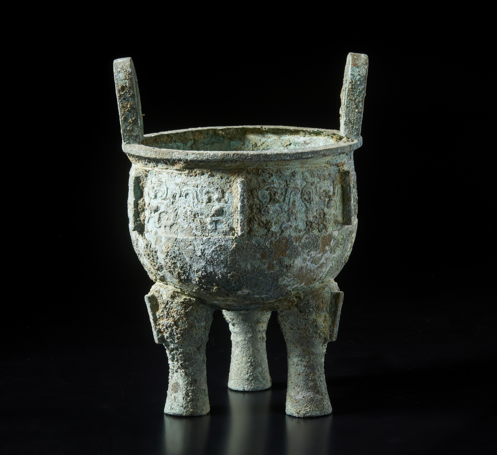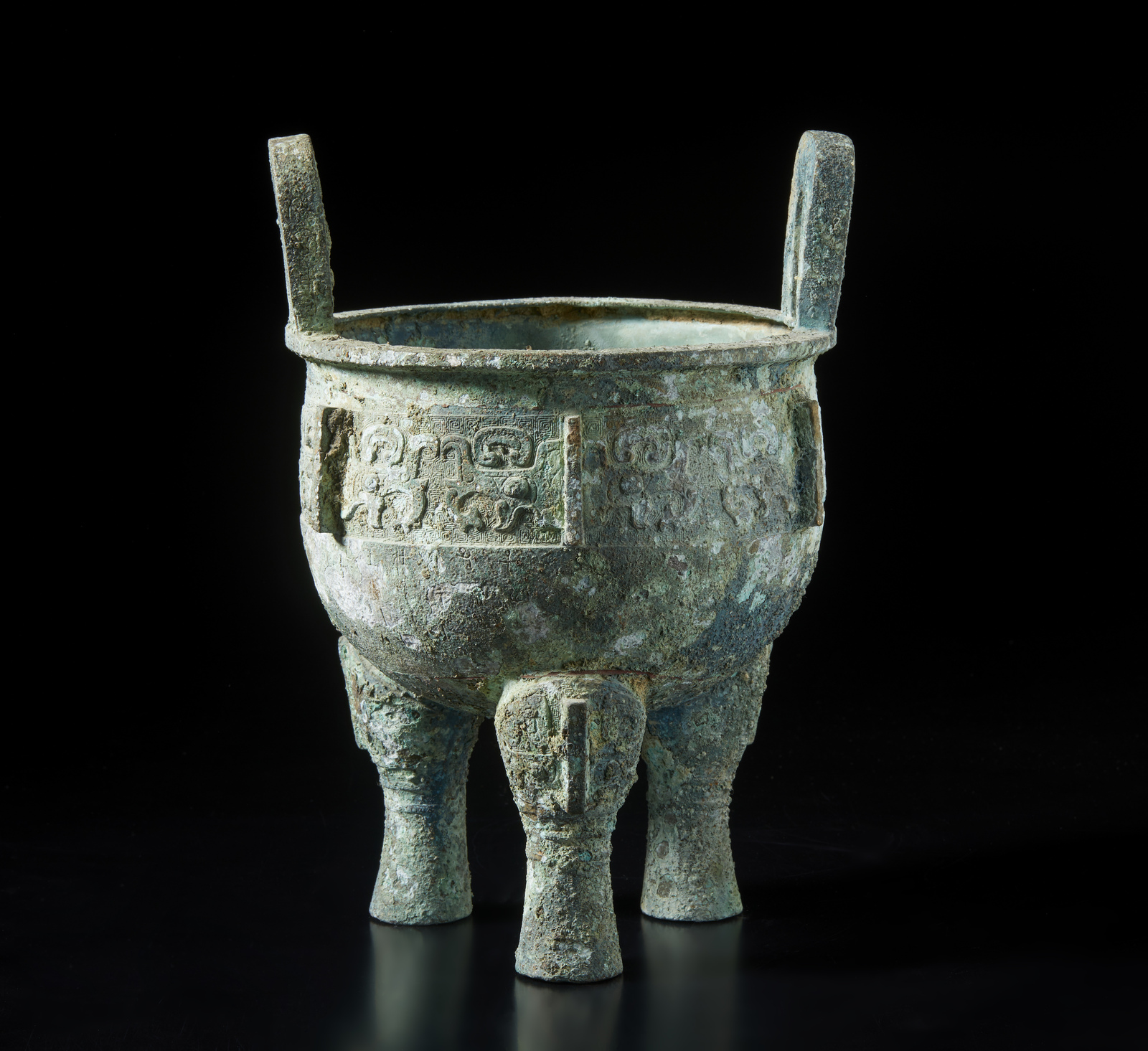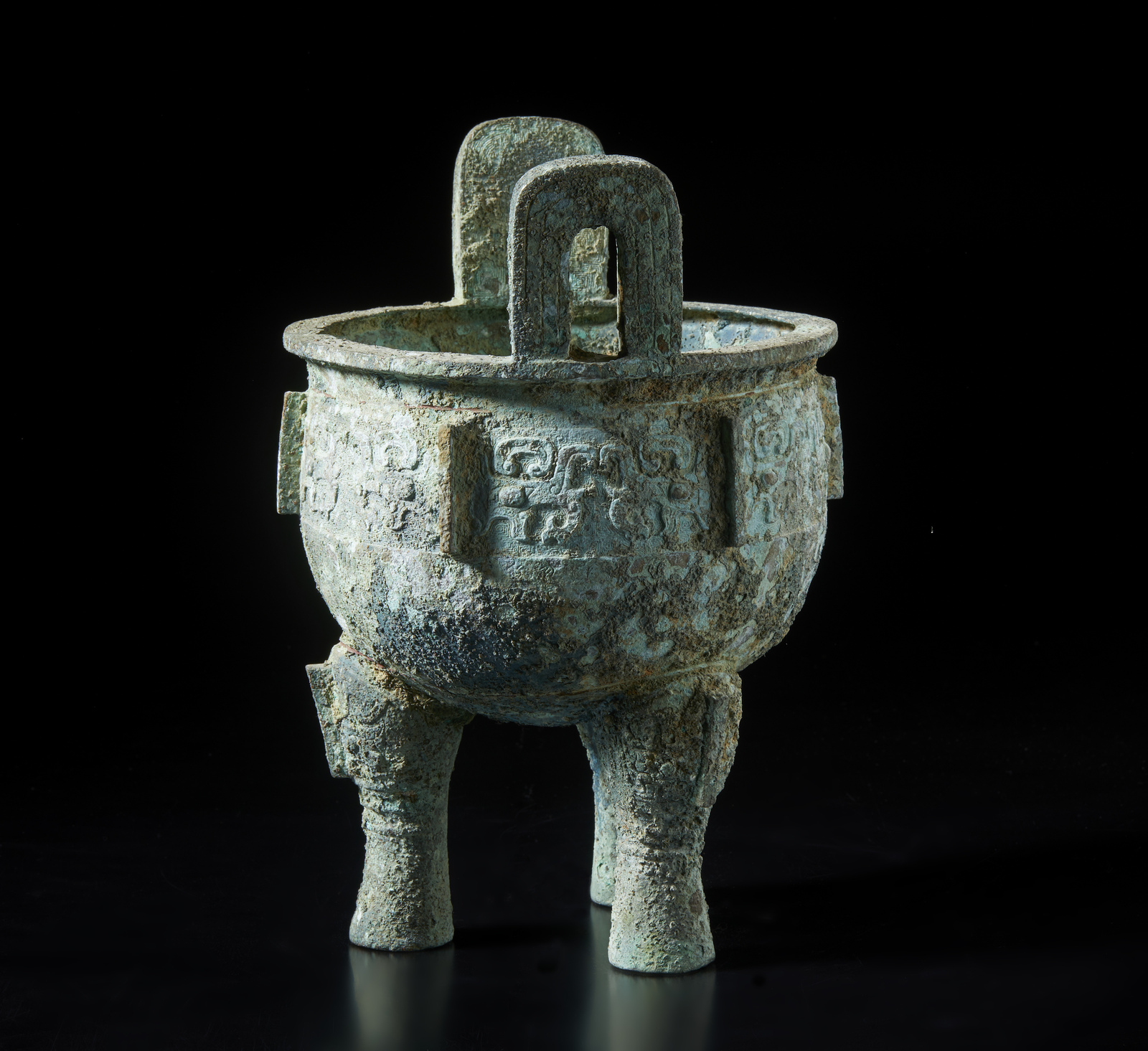 Cina, XX secolo . . Cm 24,50 x 33,50. Contenitore rituale per cibo, poggiante su tre piedi, con corpo globulare e doppia ansa verticale; decorato con fascia di tao-tie arcaiche sotto l'orlo superiore.
