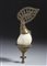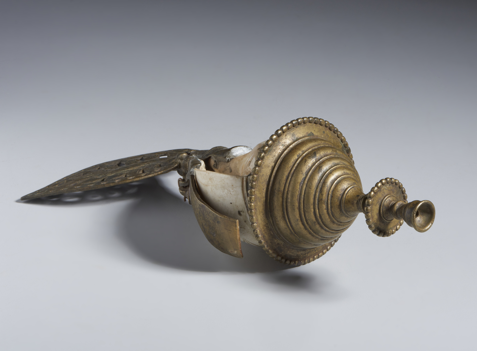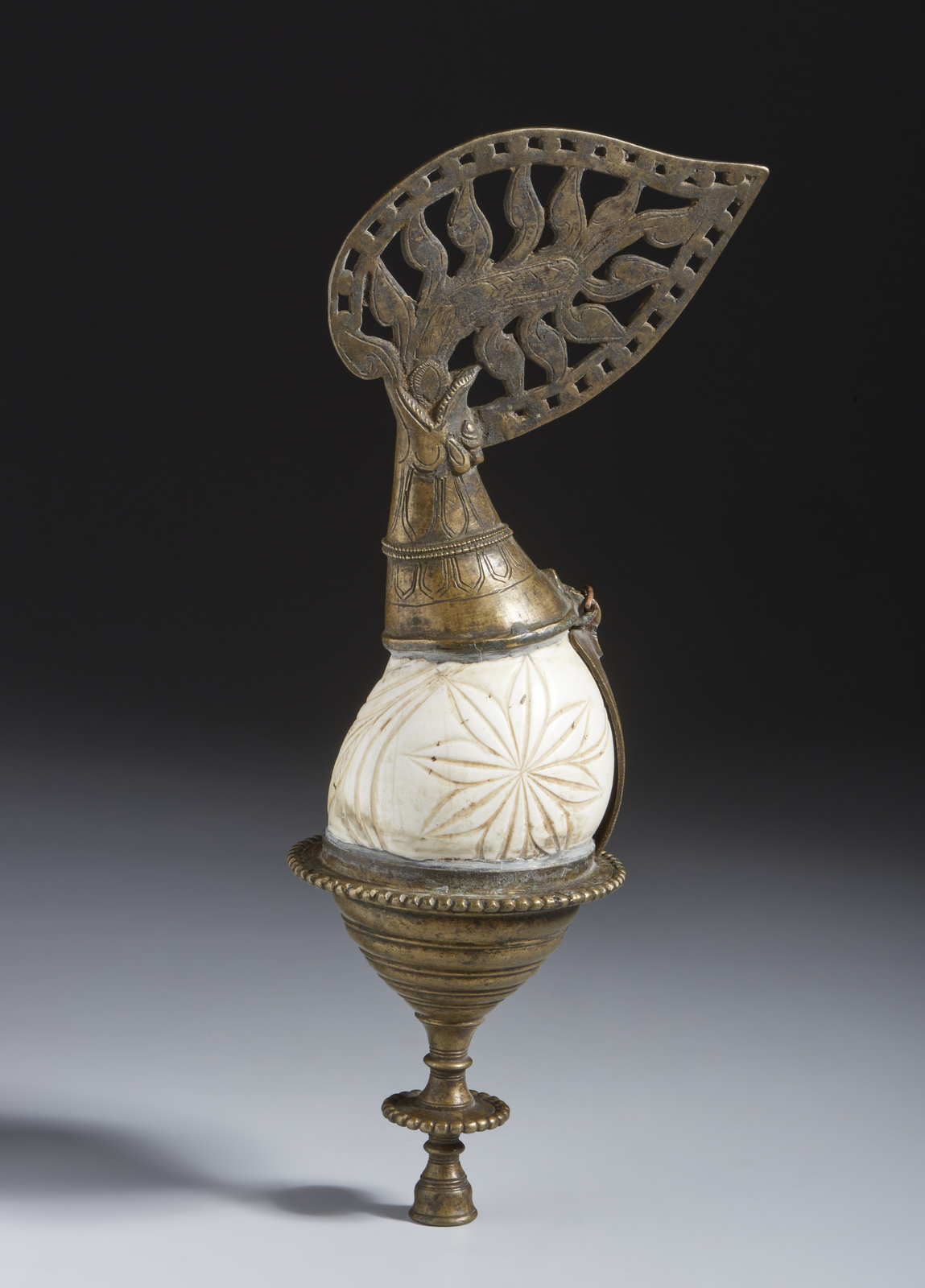 India, XX secolo . . Cm 15,00 x 36,00. La conchiglia incisa con fiore, la montatura in fusione d'ottone terminante con motivo a fiamma.