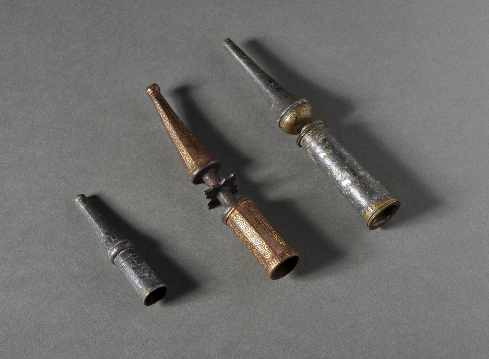 India, XIX-XX secolo . . Cm 10,50 x 0,50. Include: 5 placche in fusione metallica e tre bocchini, di cui uno con decorazione koftagari.