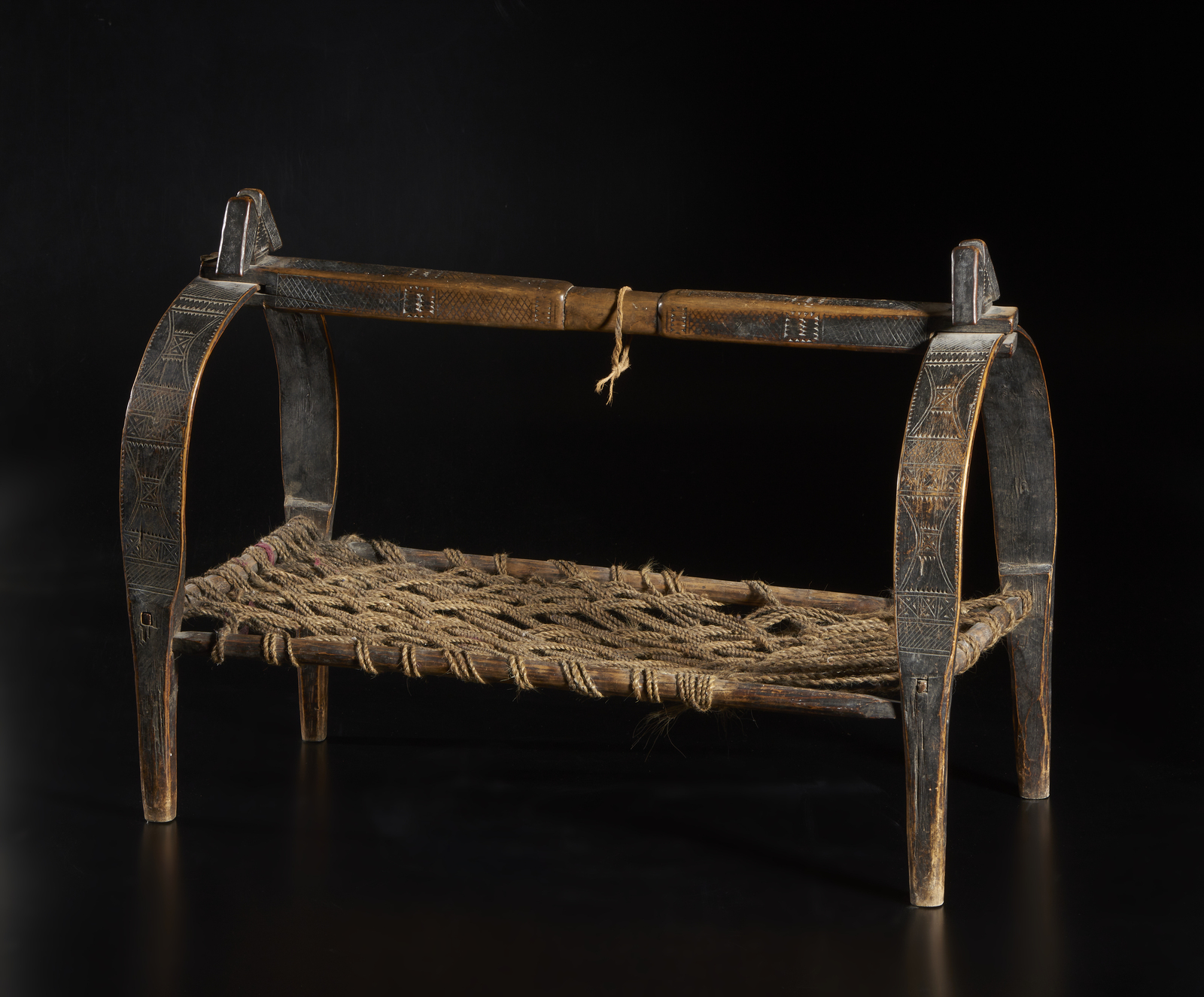 India tribale, XIX secolo . . Cm 66,00 x 51,00. Sostenuta da struttura ad arco e corredata di letto in corda intrecciata. La montatura in legno incisa con decori geometrici ripetuti.