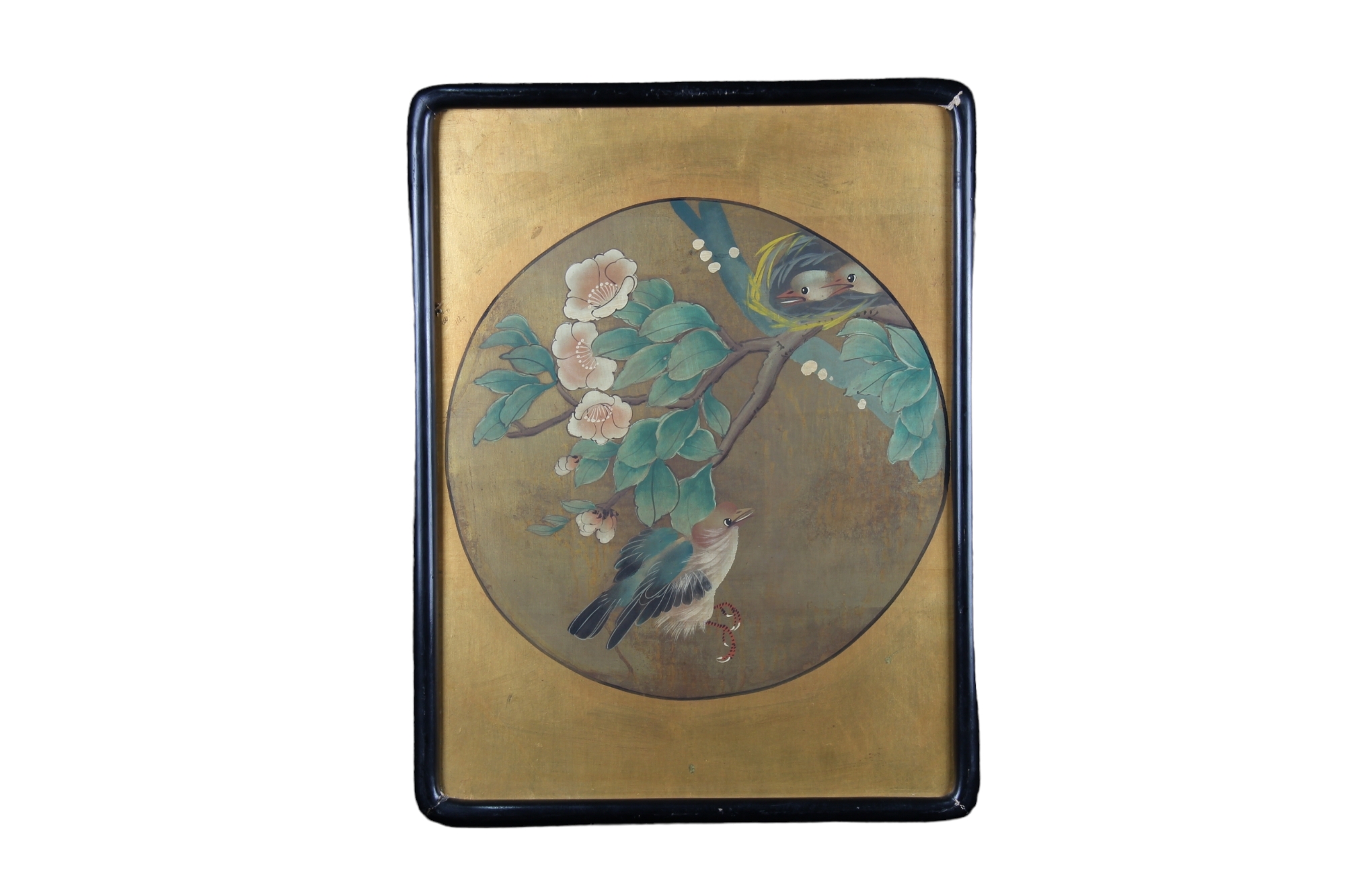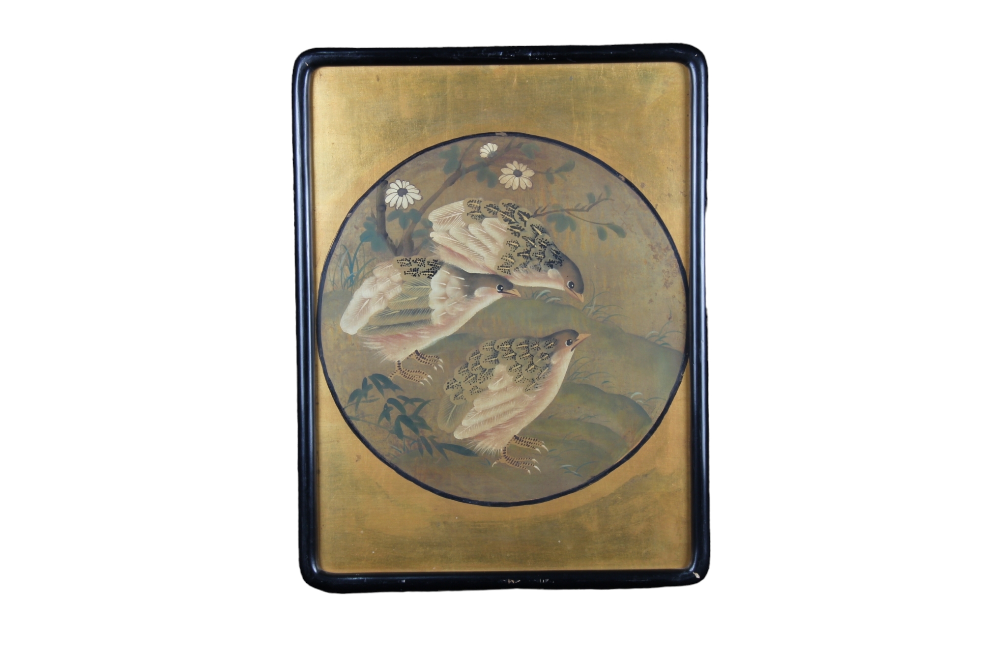 COPPIA DI PANNELLI DIPINTI SU COMPENSATO FONDO ORO raffigurante fauna e flora nello stile orientale dentro cornici in legno ebanizzato Inghilterra XX secolo h cm 53 x 40,5