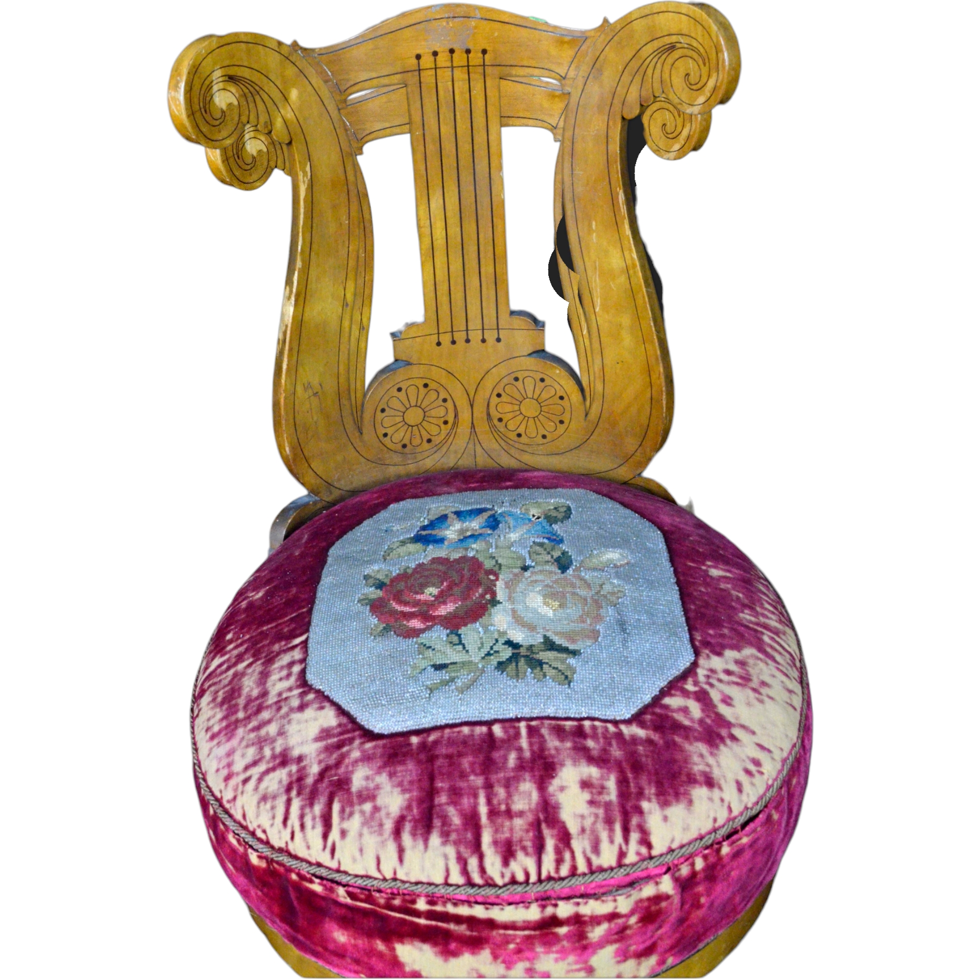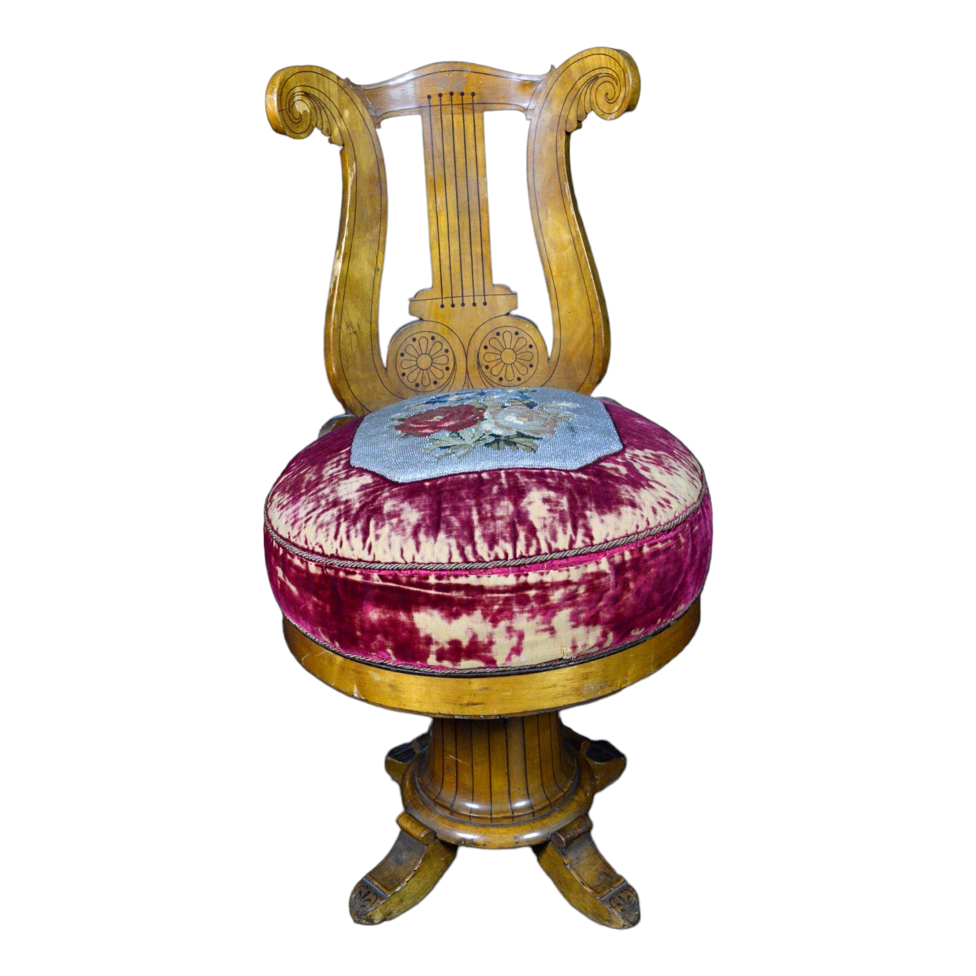 SEDIA DA MUSICA GIREVOLE con spalliera a forma di lira intarsiata con legno d'amaranto, seduta in velluto e riquadro ricamato a piccolo punto con soggetto floreale Carlo X Italia XIX secolo h cm 87,5 x 50 x 45