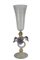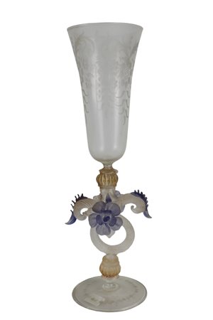 CALICE IN VETRO realizzato dalla vecchia manifattura italiana di Murano, presenta una base circolare e svasata un fusto modanato a volute intrecciate e lanceolate con fiori in pasta applicati ed un bevante sagomato a cono, la decorazione è affidato ad un fine lavoro di incisione con motivi vegetali, presenta certificato di autenticità h cm 29