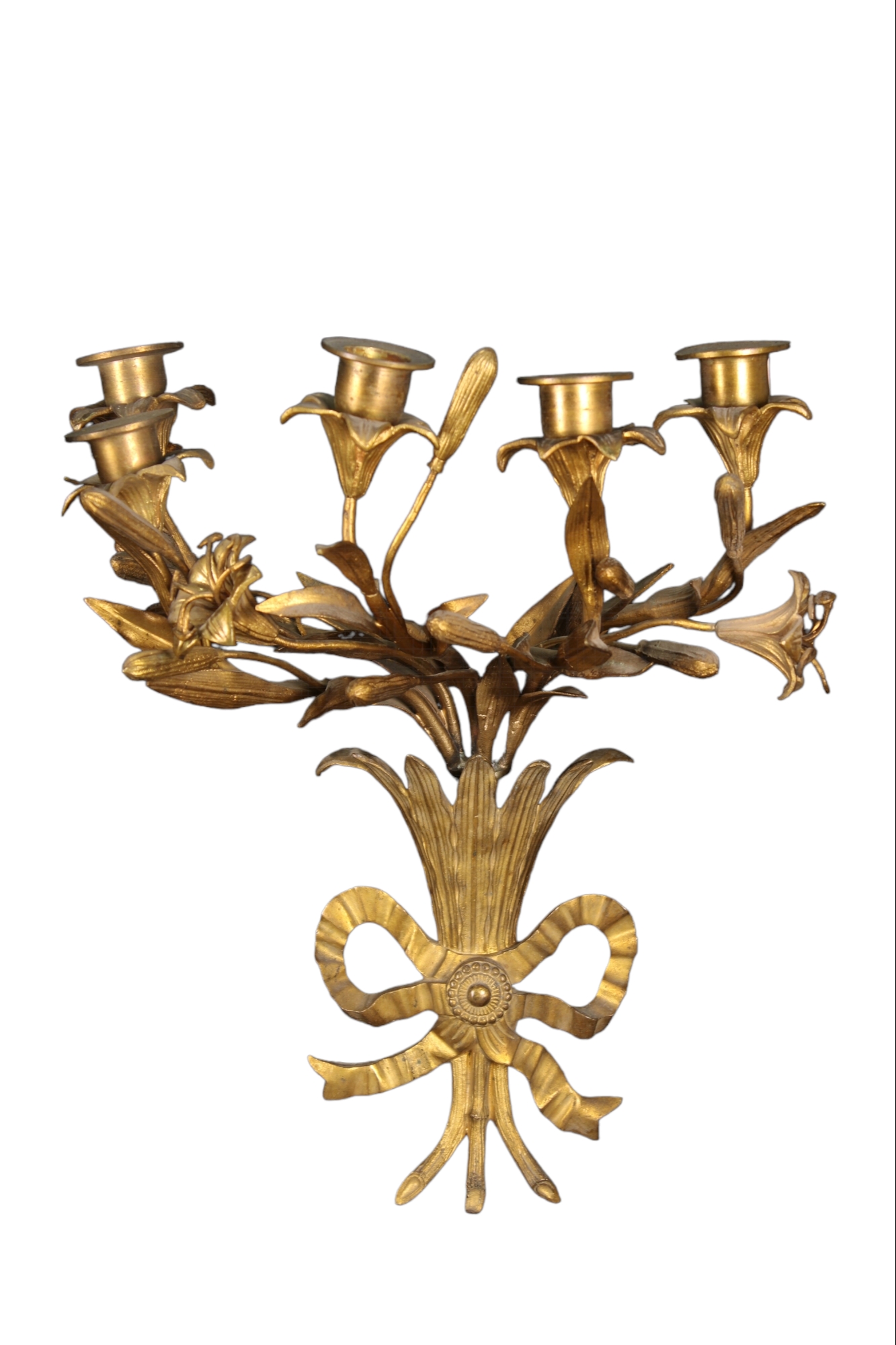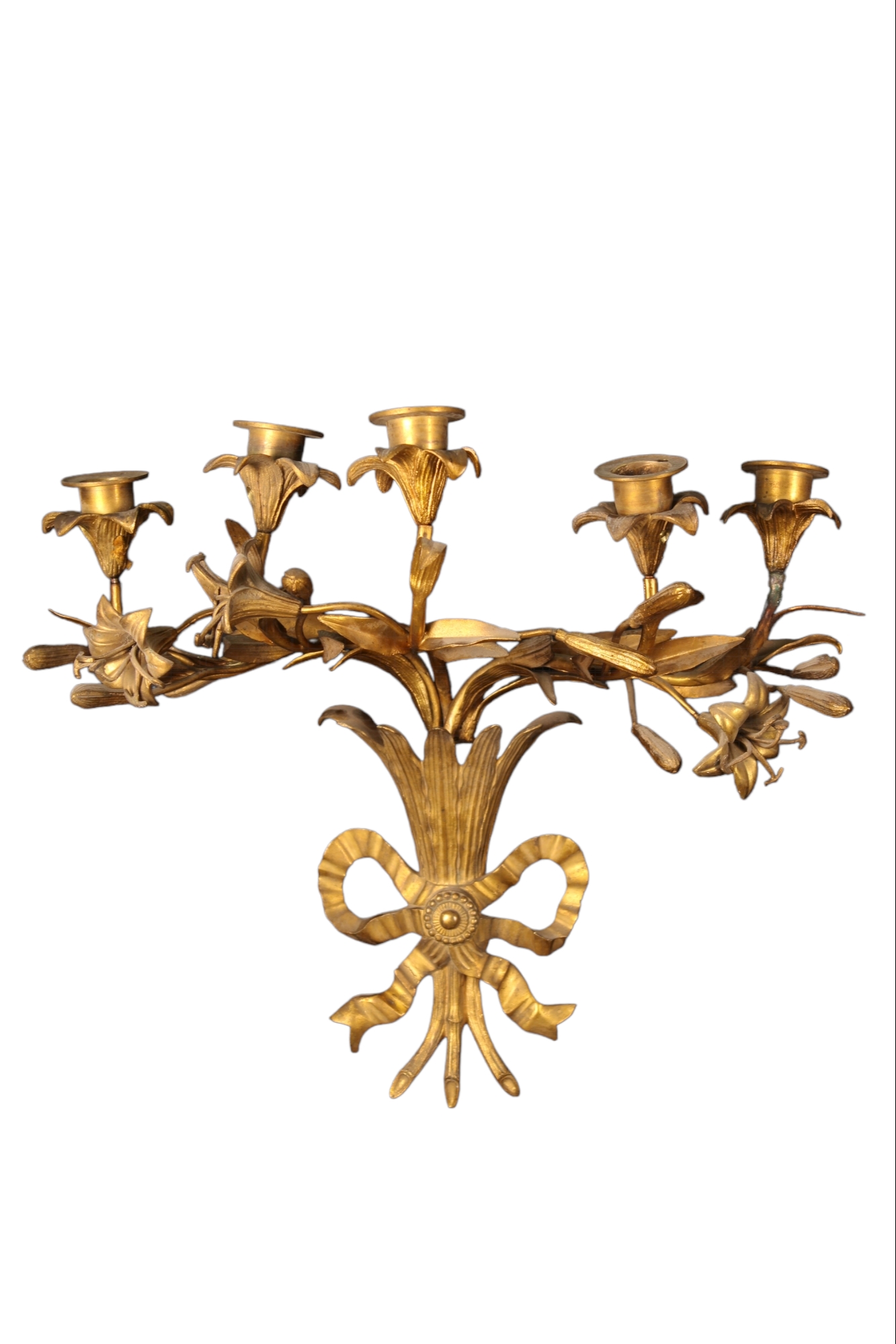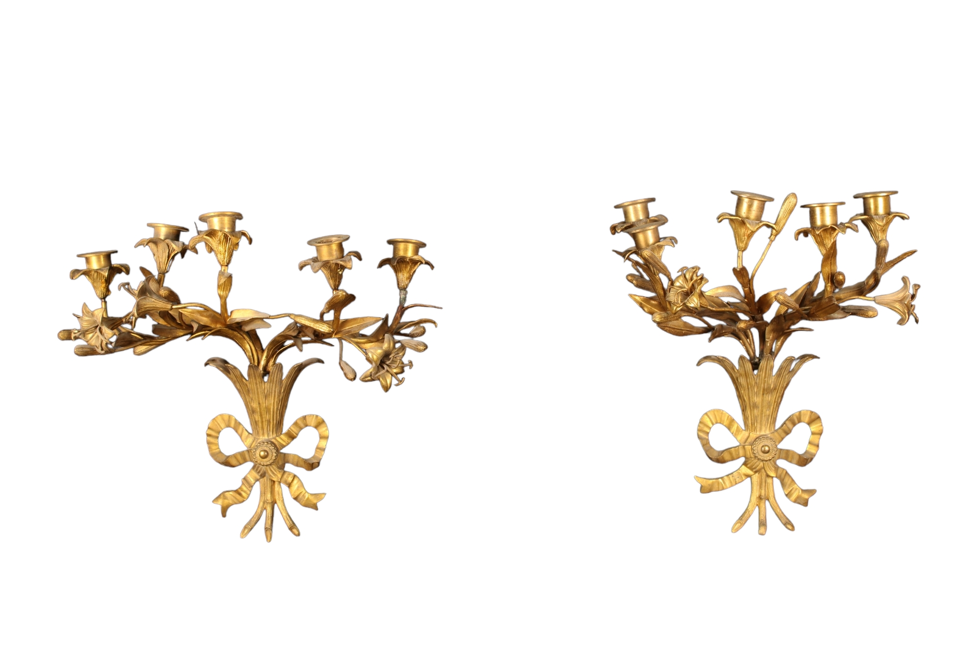 COPPIA DI APPLIQUES A 5 FIAMME in bronzo finemente cesellato e dorato Francia XIX secolo h cm 37 x 32 x 20