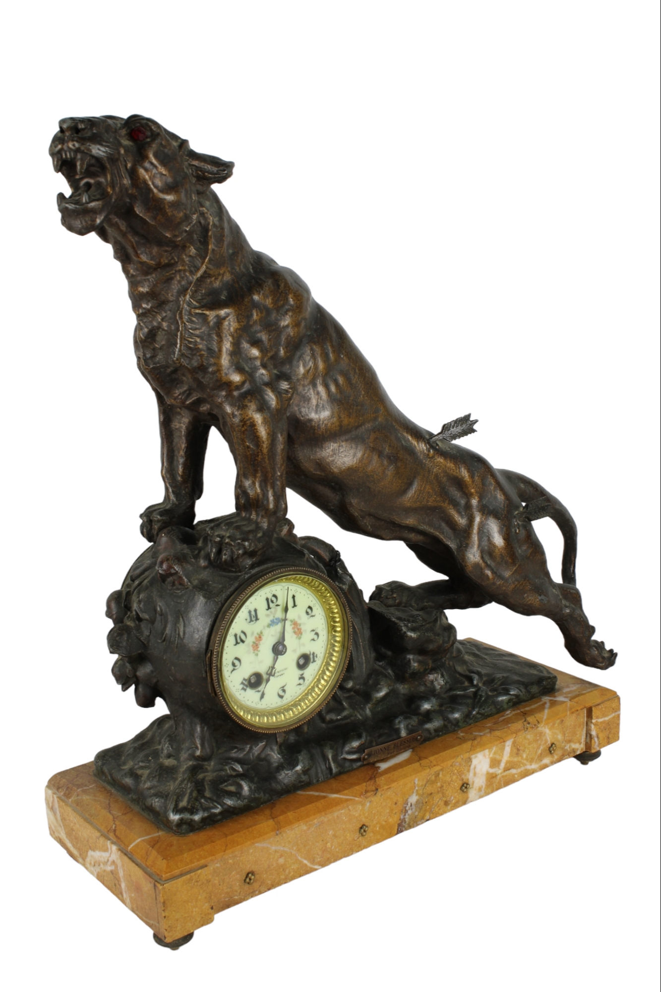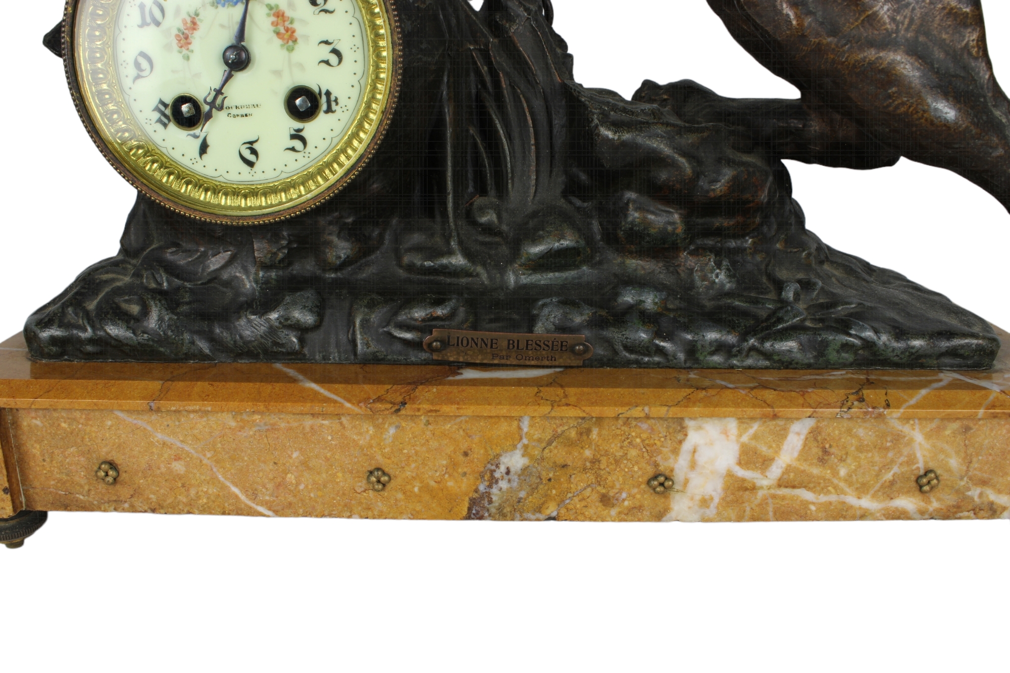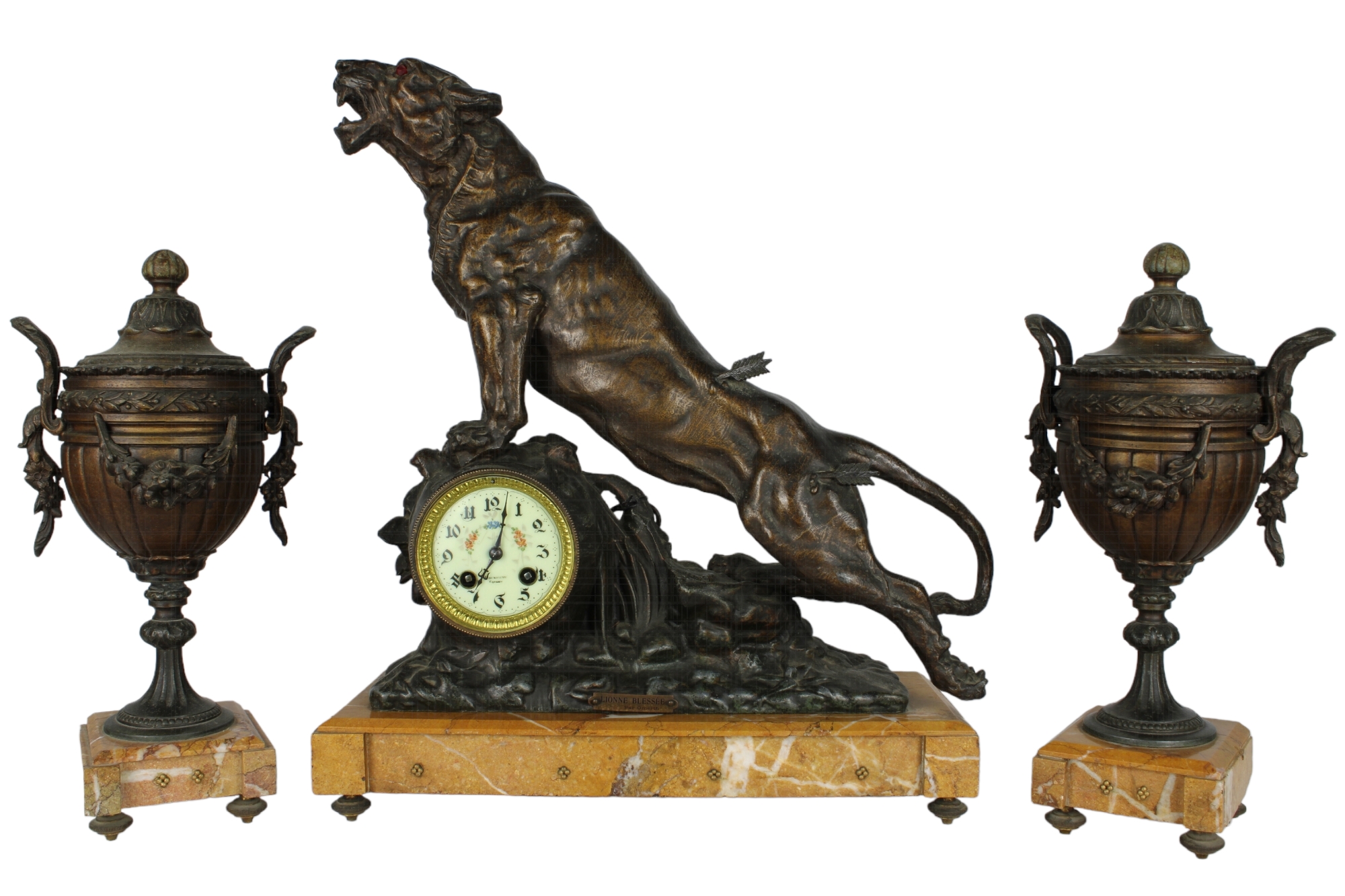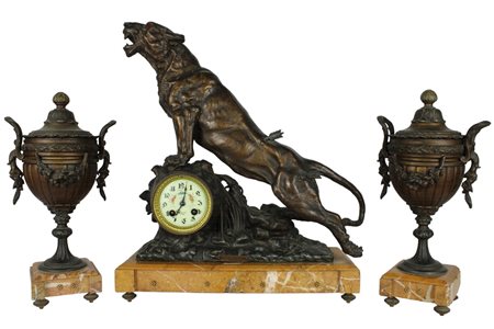 TRITTICO COMPOSTO DA: OROLOGIO E COPPIA DI VASI in bronzo raffigurante leone con base in marmo giallo Francia XIX secolo h cm 50 x 41 x 16 / h cm 36 x 16