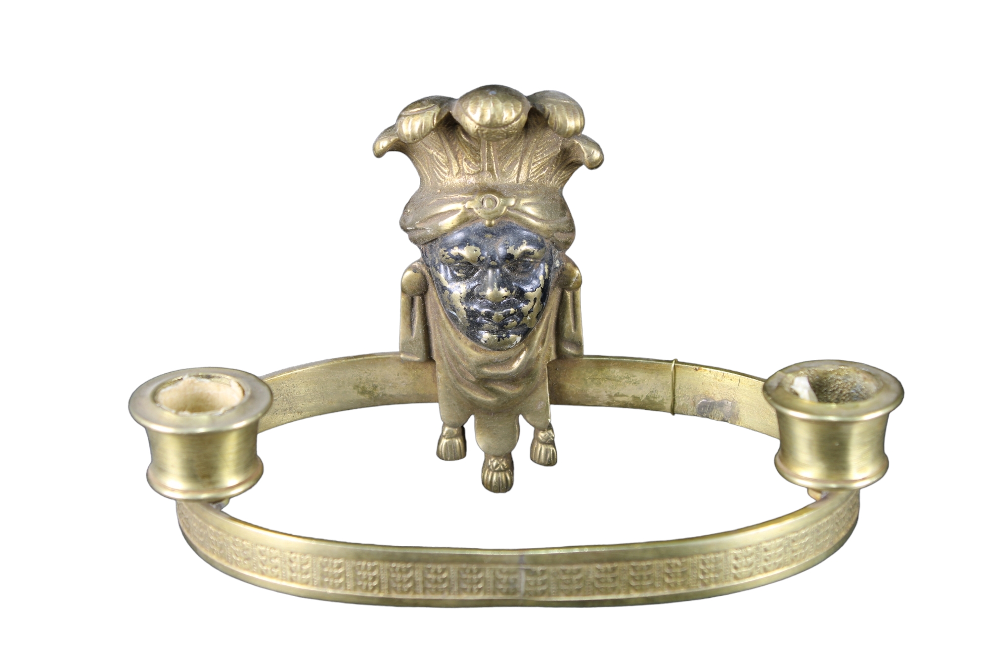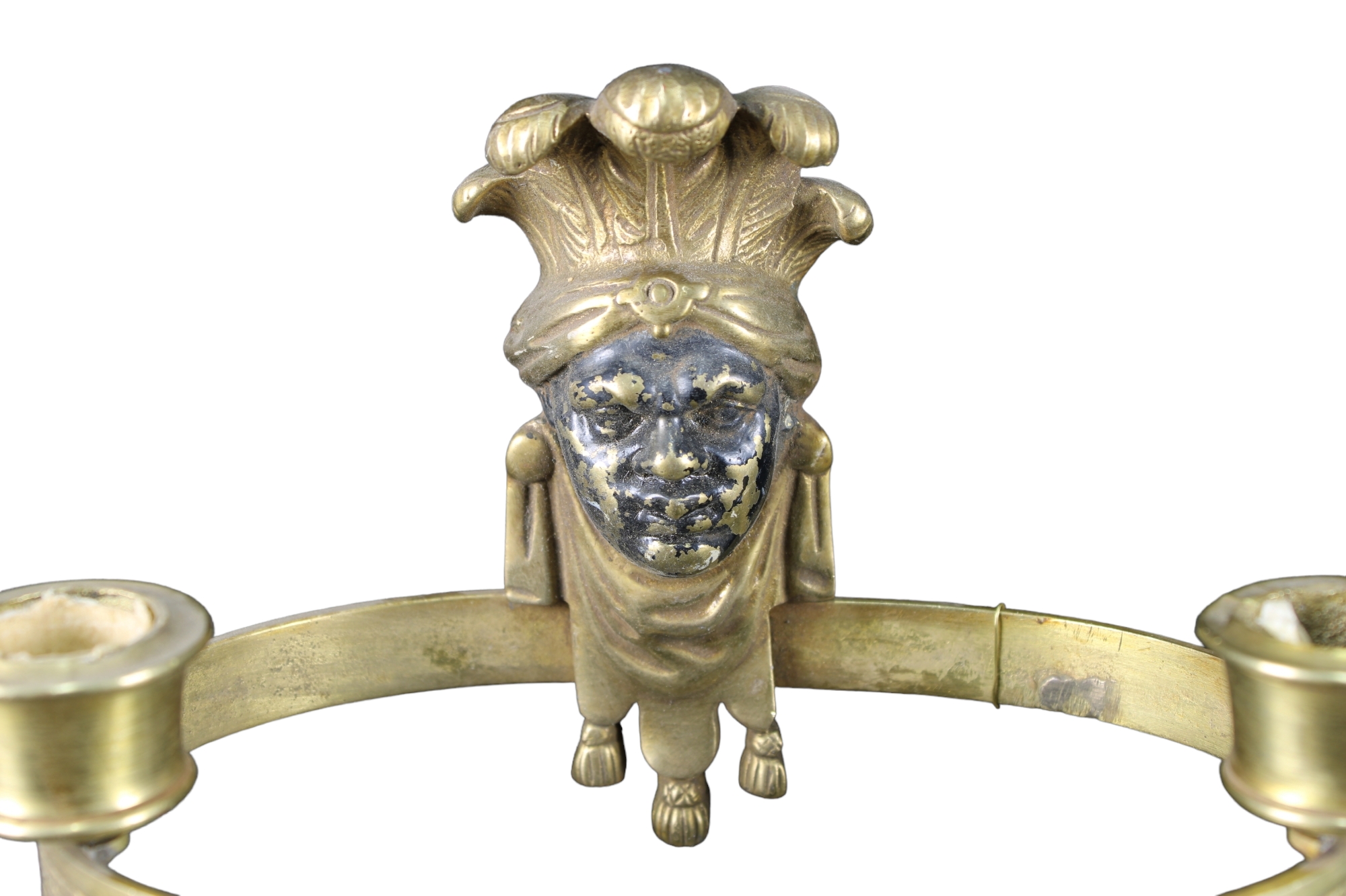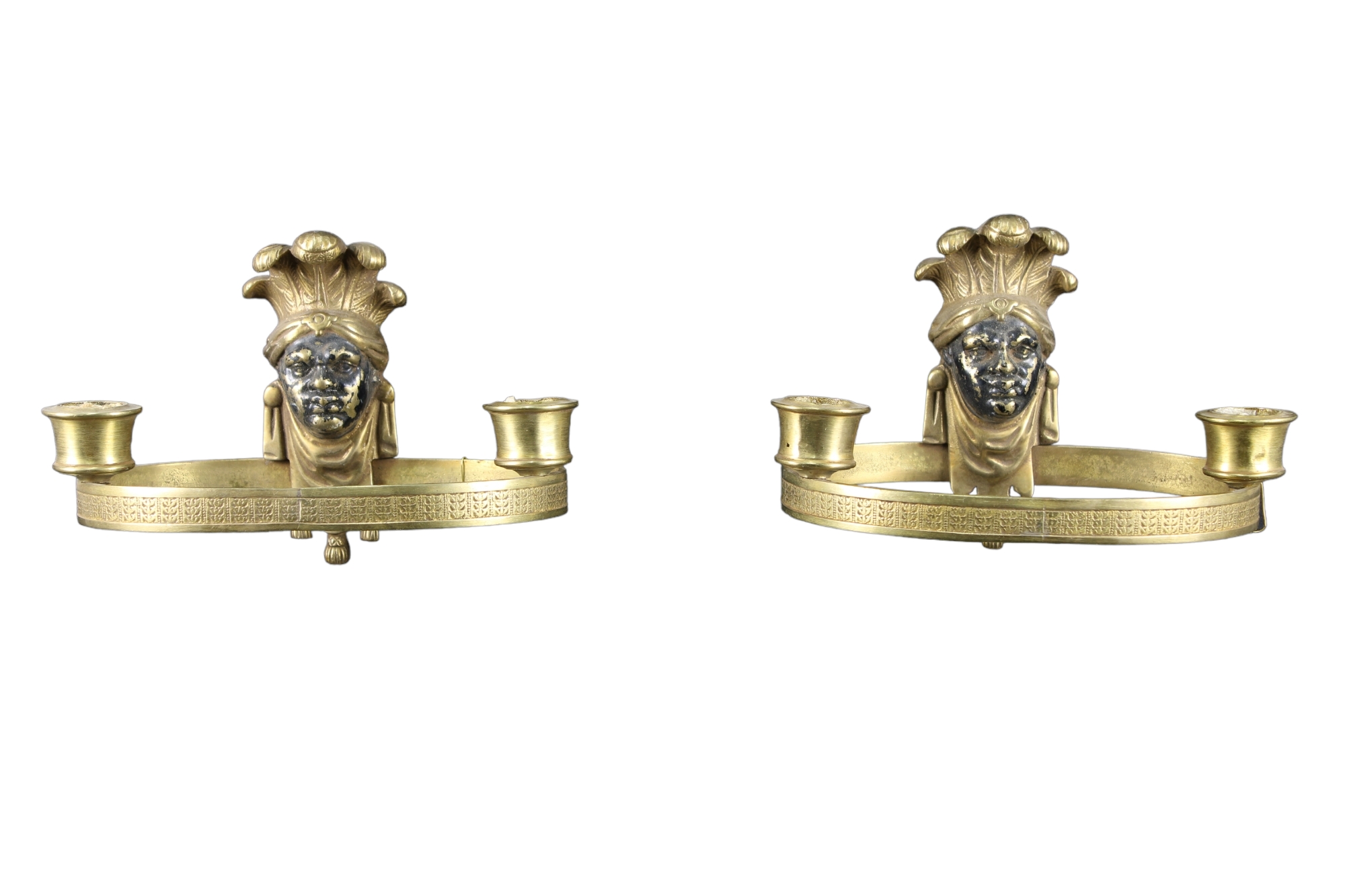 COPPIA DI ELEGANTI APPLIQUES in bronzo dorato e patinato a 2 fiamme composto da fascia sostenuta da volto di moro manifattura italiana XIX - XX secolo h cm 14 x 20 x 12,5