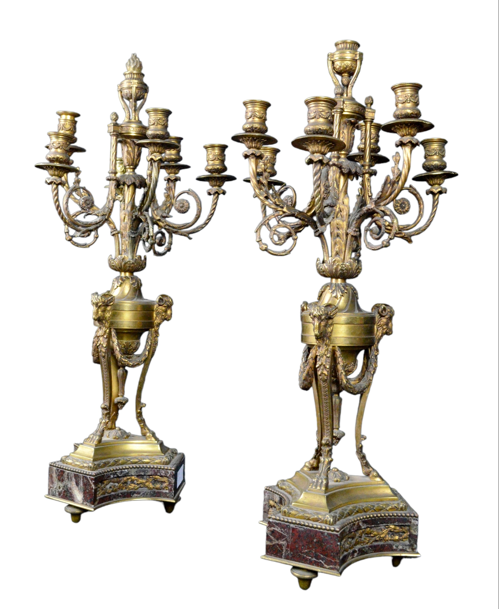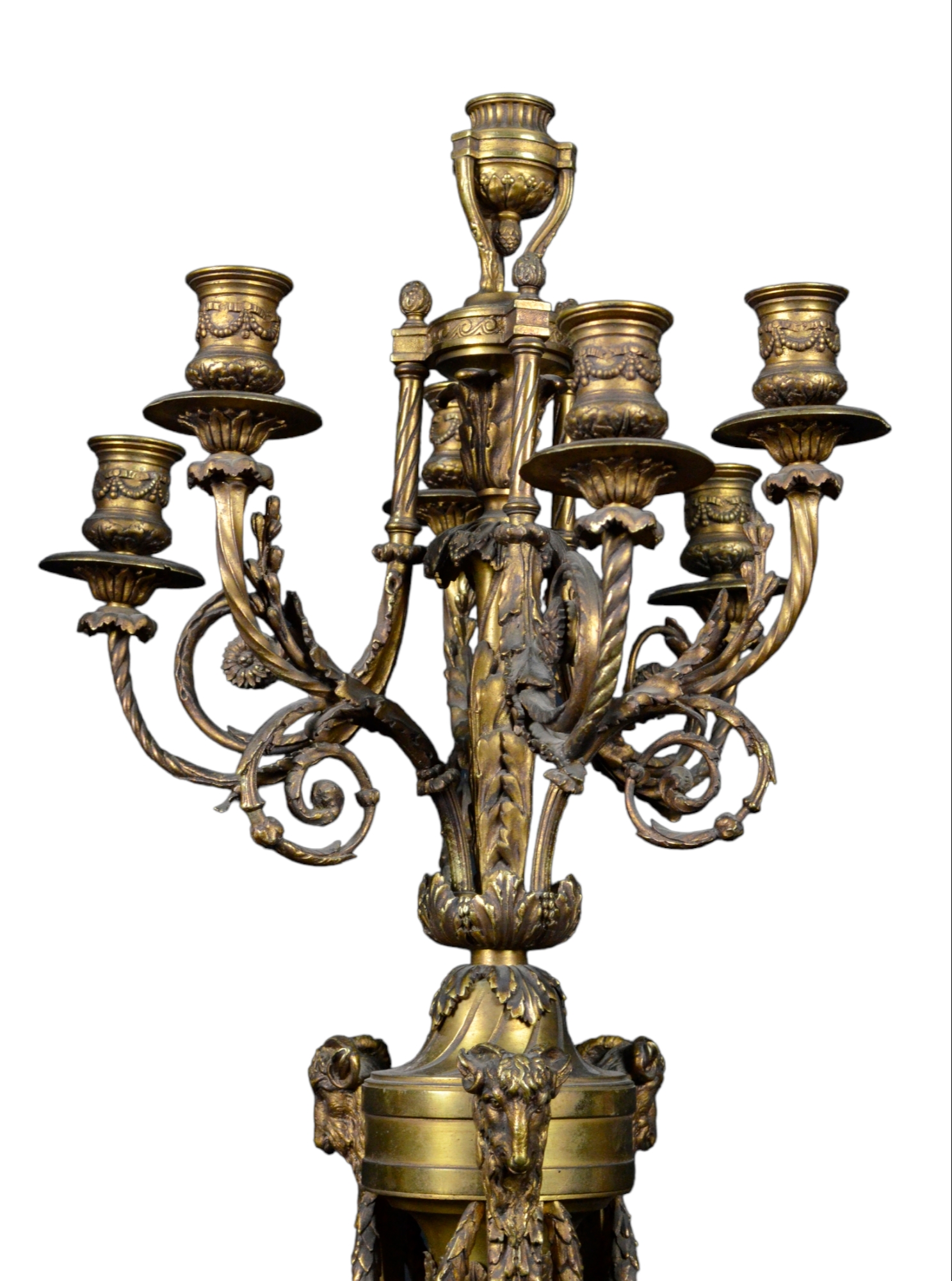 COPPIA DI CANDELIERI in bronzo dorato e finemente cesellato, a 7 fiamme, base in marmo breccia francese Francia XIX secolo h cm 78 x 32