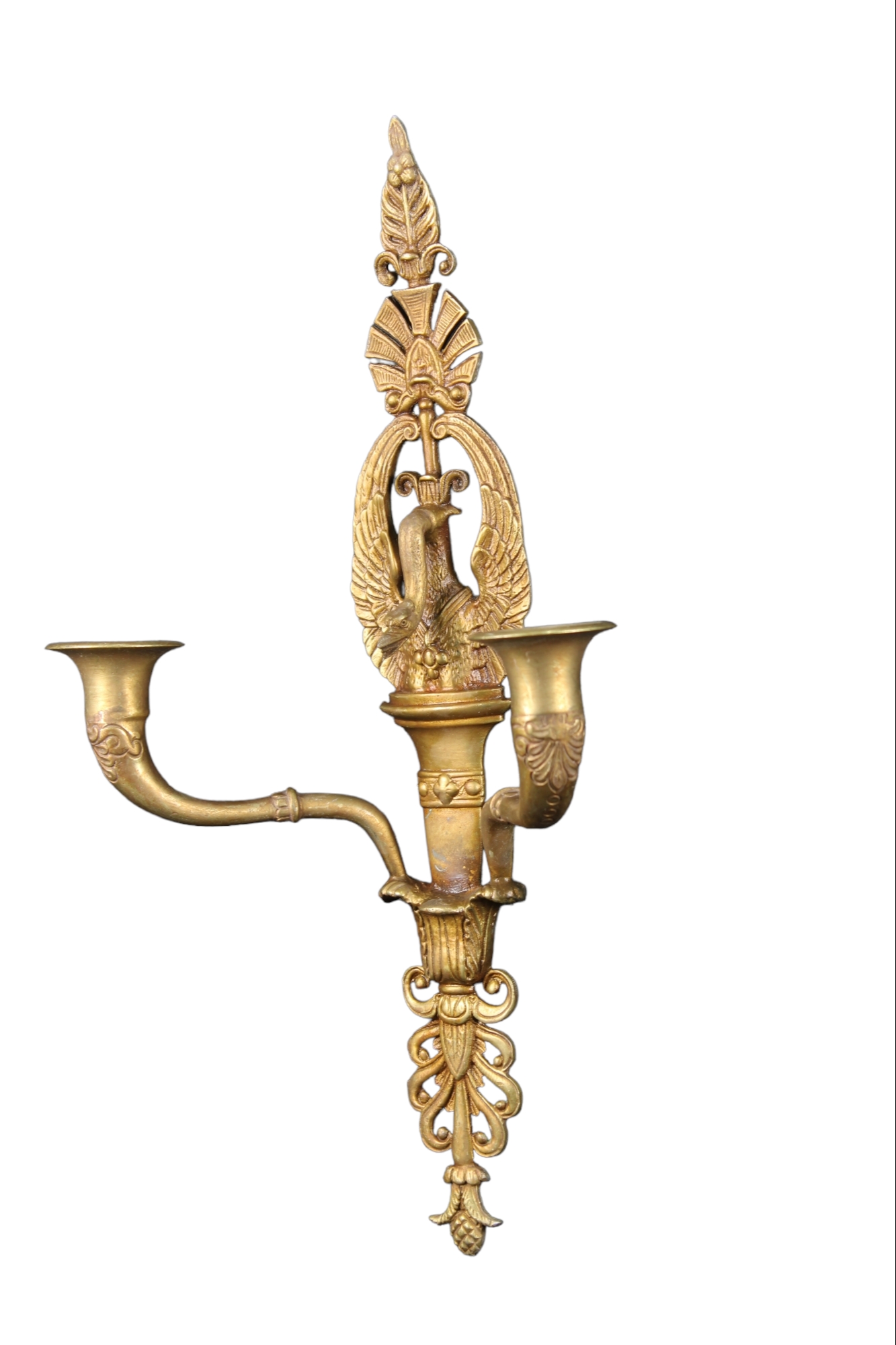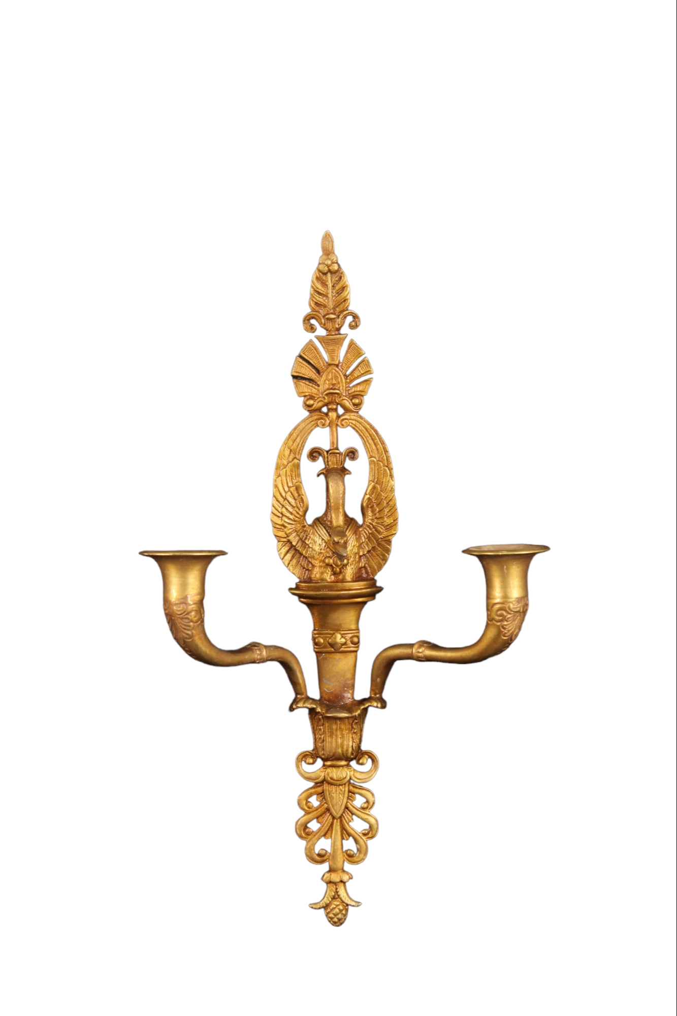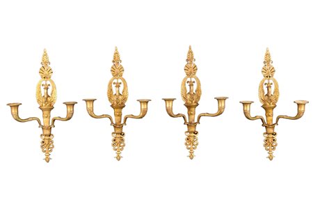 4 APPLIQUES in bronzo finemente cesellato e dorato a 2 fiamme raffigurante cigno manifattura italiana XIX - XX secolo h cm 41,5 x 23,5 x 13,5