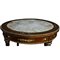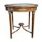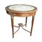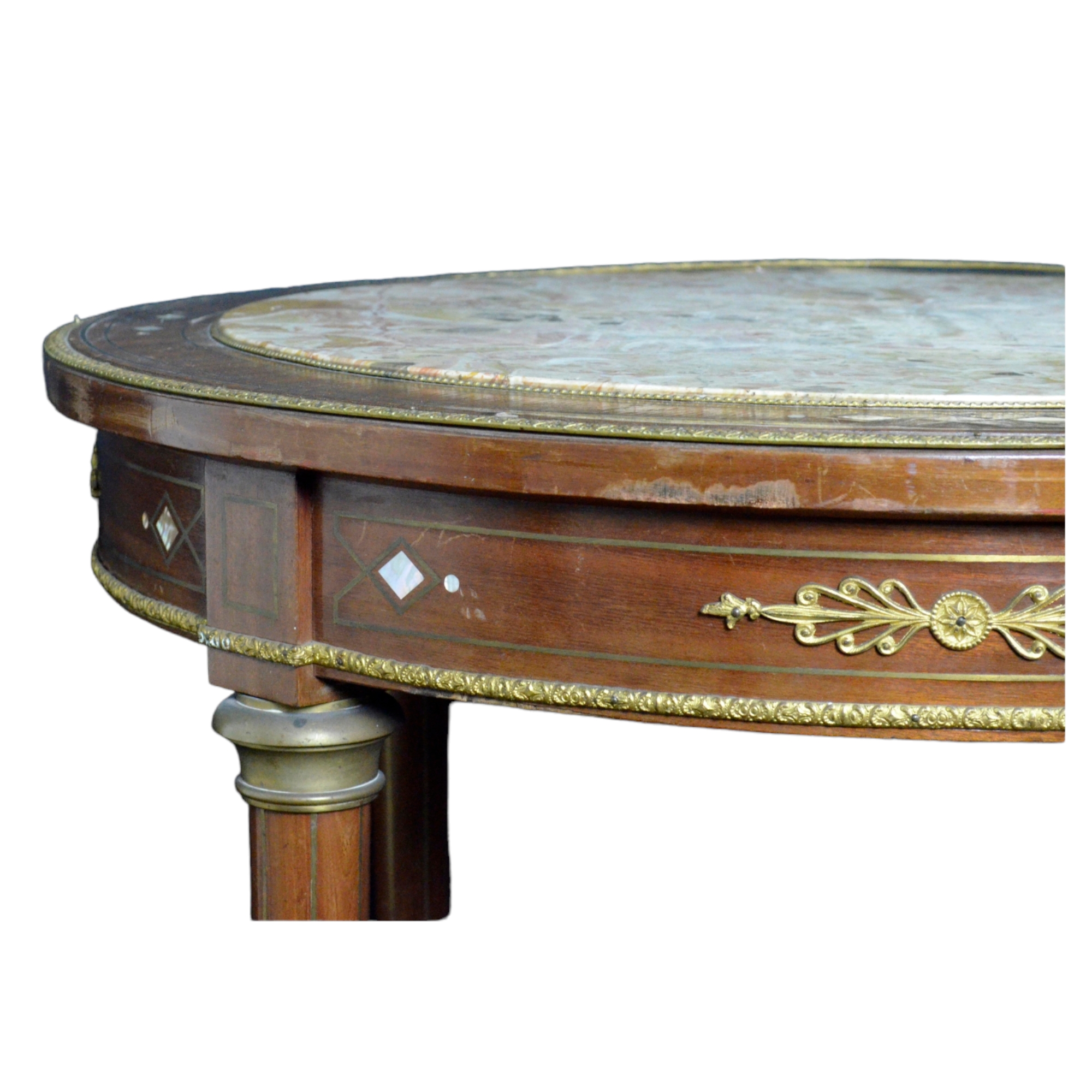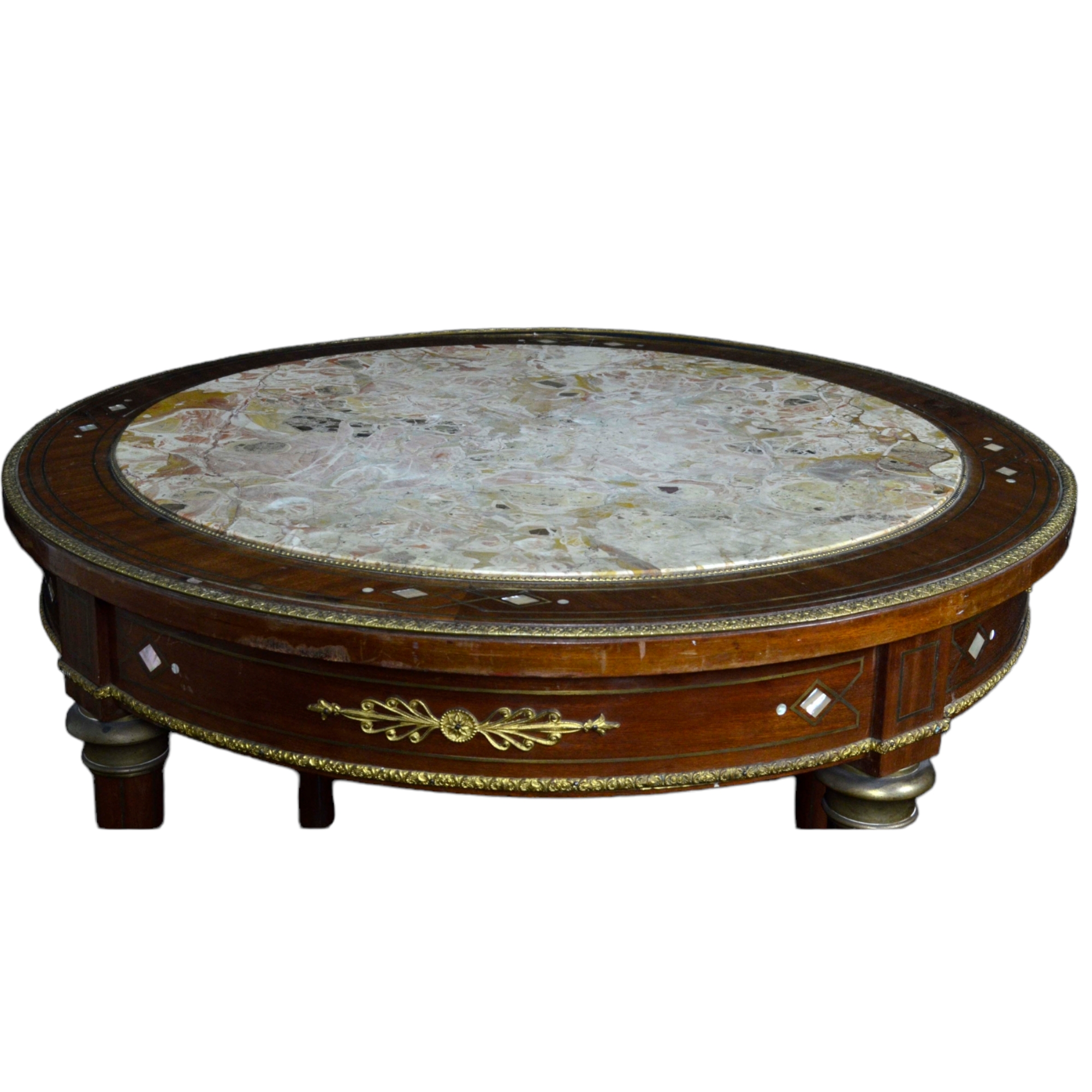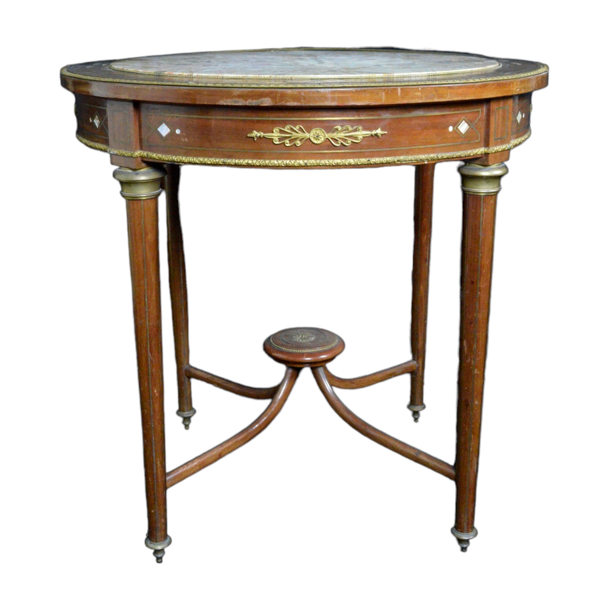 TAVOLINO DA SALOTTO in mogano, piano in marmo , bordo filettato in metallo, sottopiano decorato da fregi in bronzo e segmenti di madreperla, gambe scanalate raccordate , assi curve con rosone Francia XIX secolo h cm 79 x Ø 82