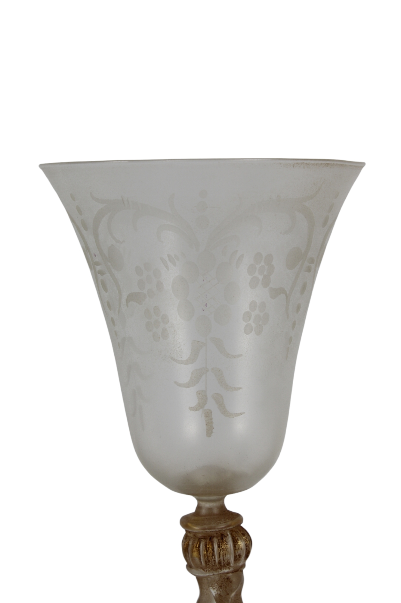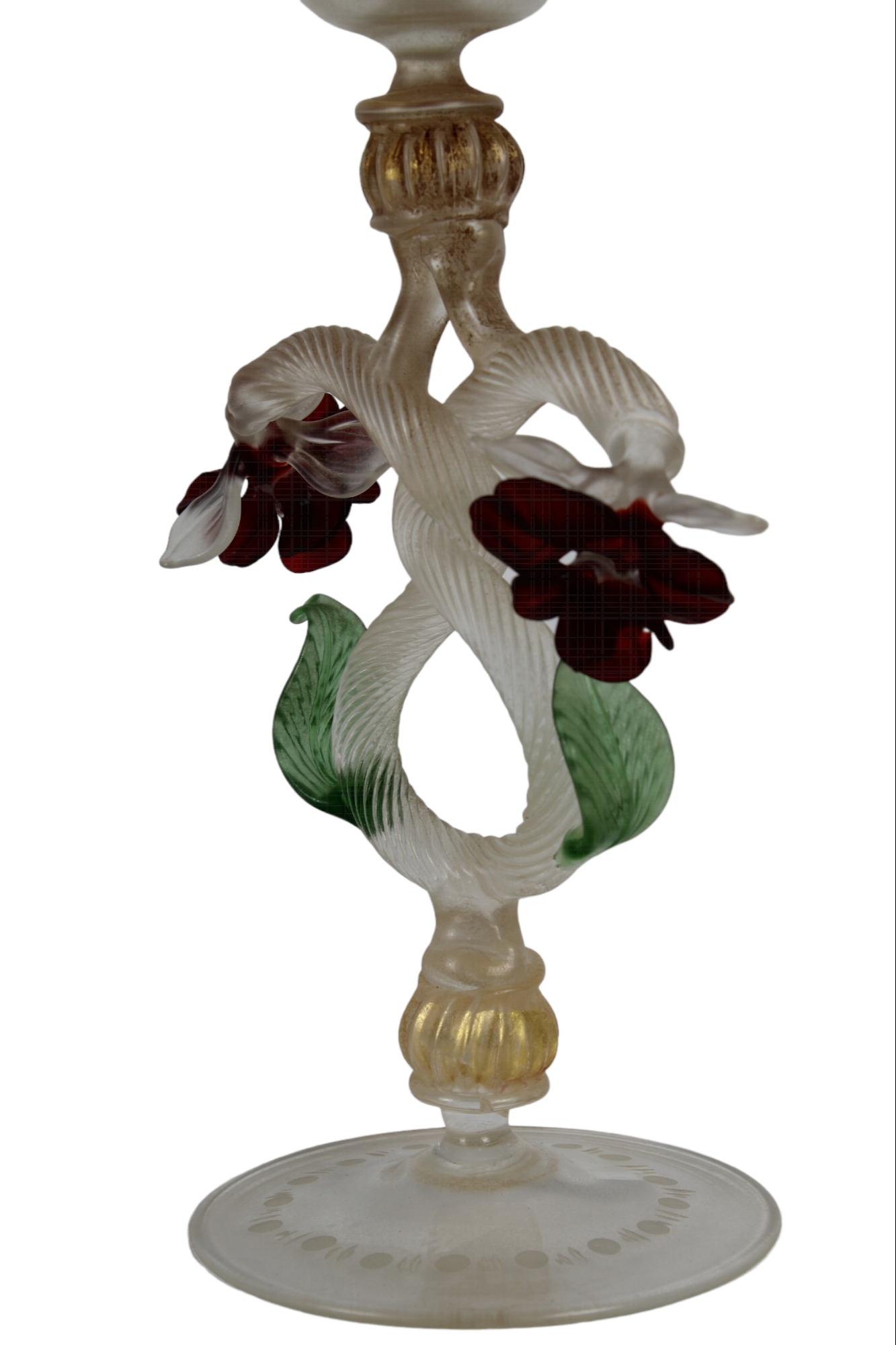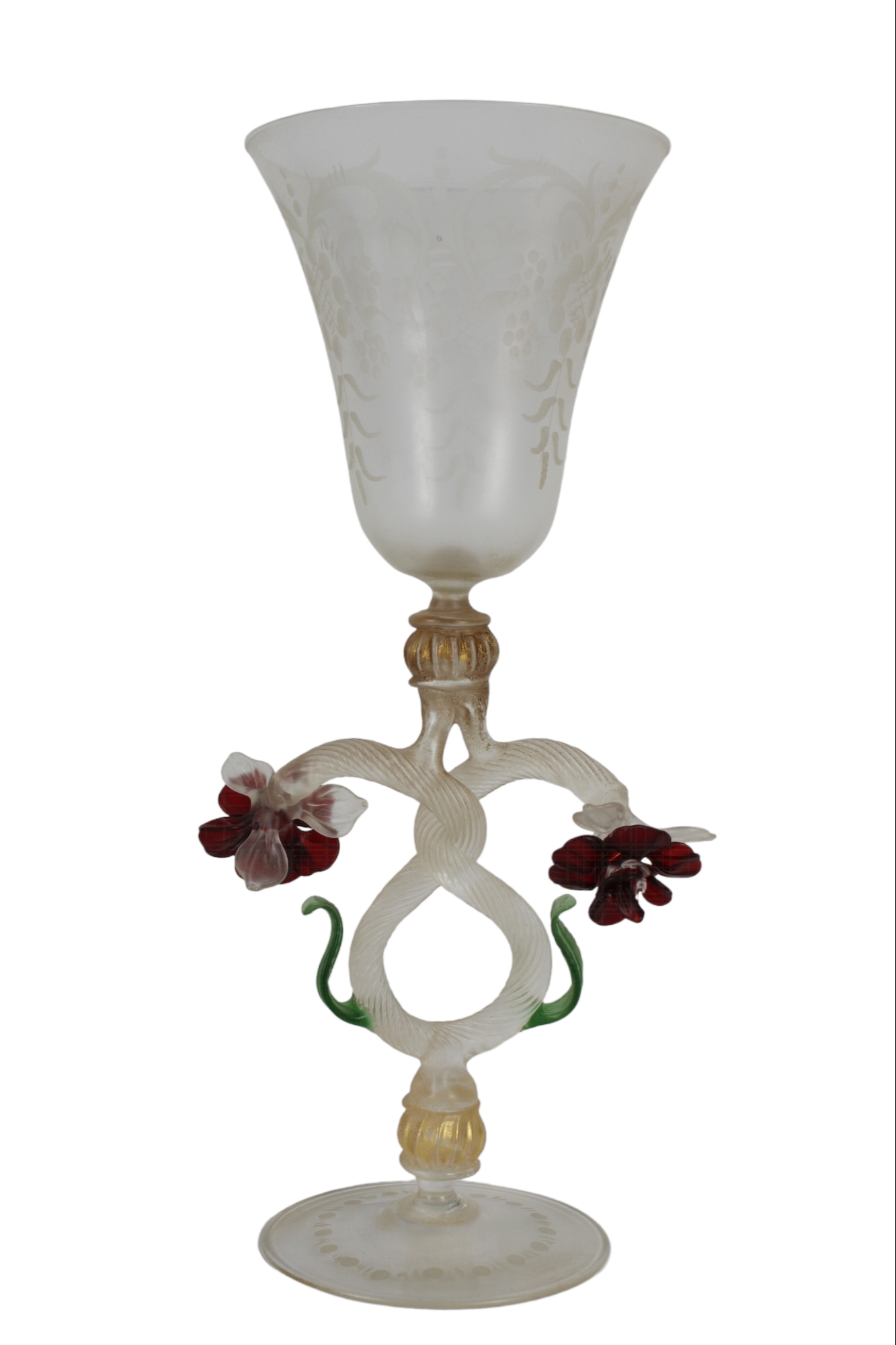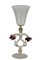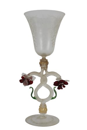 CALICE IN VETRO realizzato dalla vecchia manifattura italiana di Murano, presenta una sagoma a pianta circolare con base svasata, fusto modanato abalaustro e bevante conico, la decorazione è affidata ai fiori applicati in pasta rossa ed al fine lavoro di incisione, presenta certificato di autenticità h cm 26