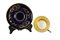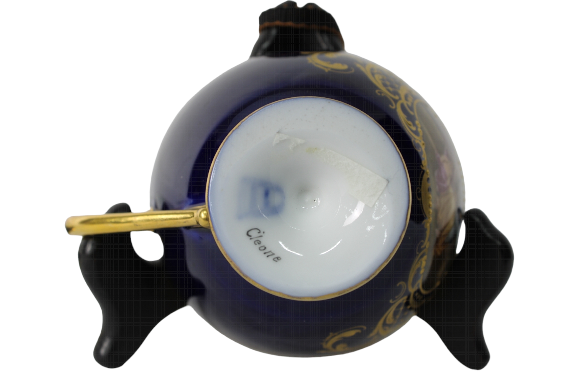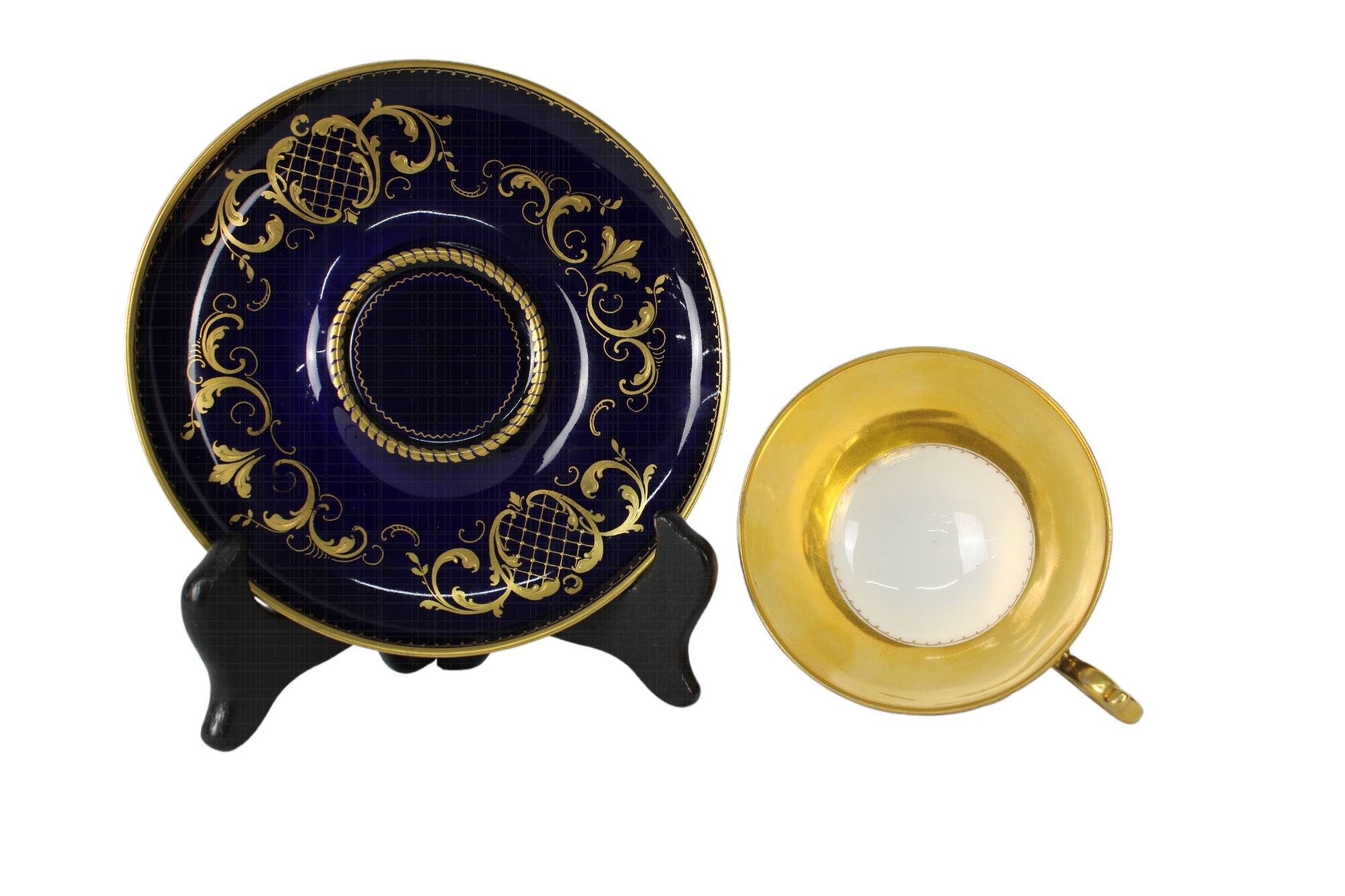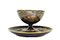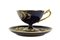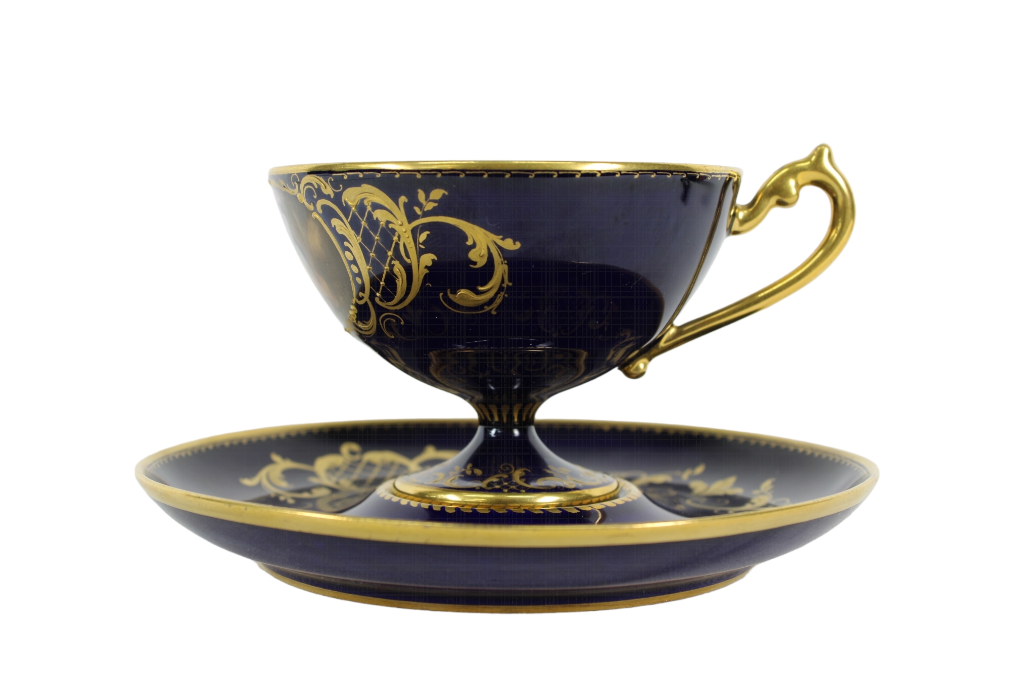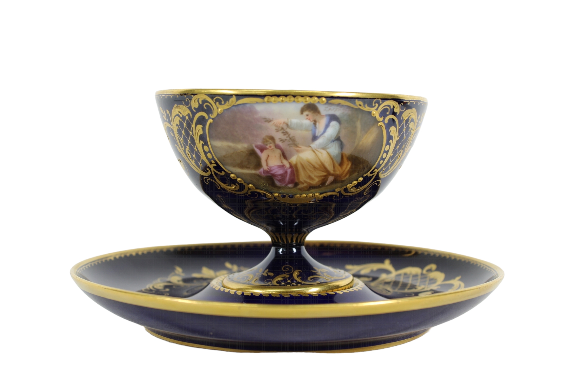 TAZZA CON PIATTINO IN PORCELLANA realizzata dalla manifattura austriaca di Vienna, presenta una sagoma circolare e bombata con manico modanato a voluta la decorazione è affidata ad uno specchiominiato con smalti policromi a gran fuoco e raffigurante una scena di ispirazione Neoclassica firmata Schuler. Il fondo di colore blu cobalto è ornato da motivi vegetali in oro a rilievo. Presenta certificato di autenticità II meta del XIX secolo