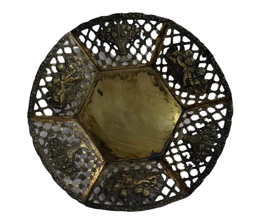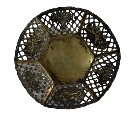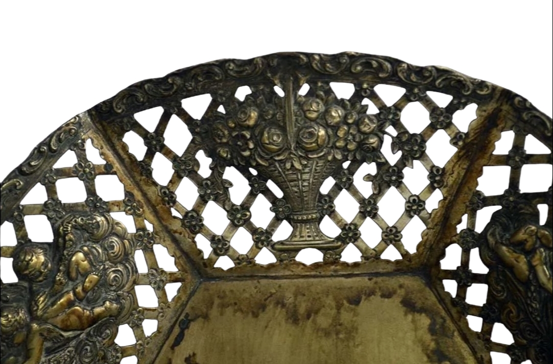 CESTINO in argento di forma esagonale,bordo decorato da griglia cesto fiorito e gioco di putti . 415 gr, usure del tempo