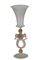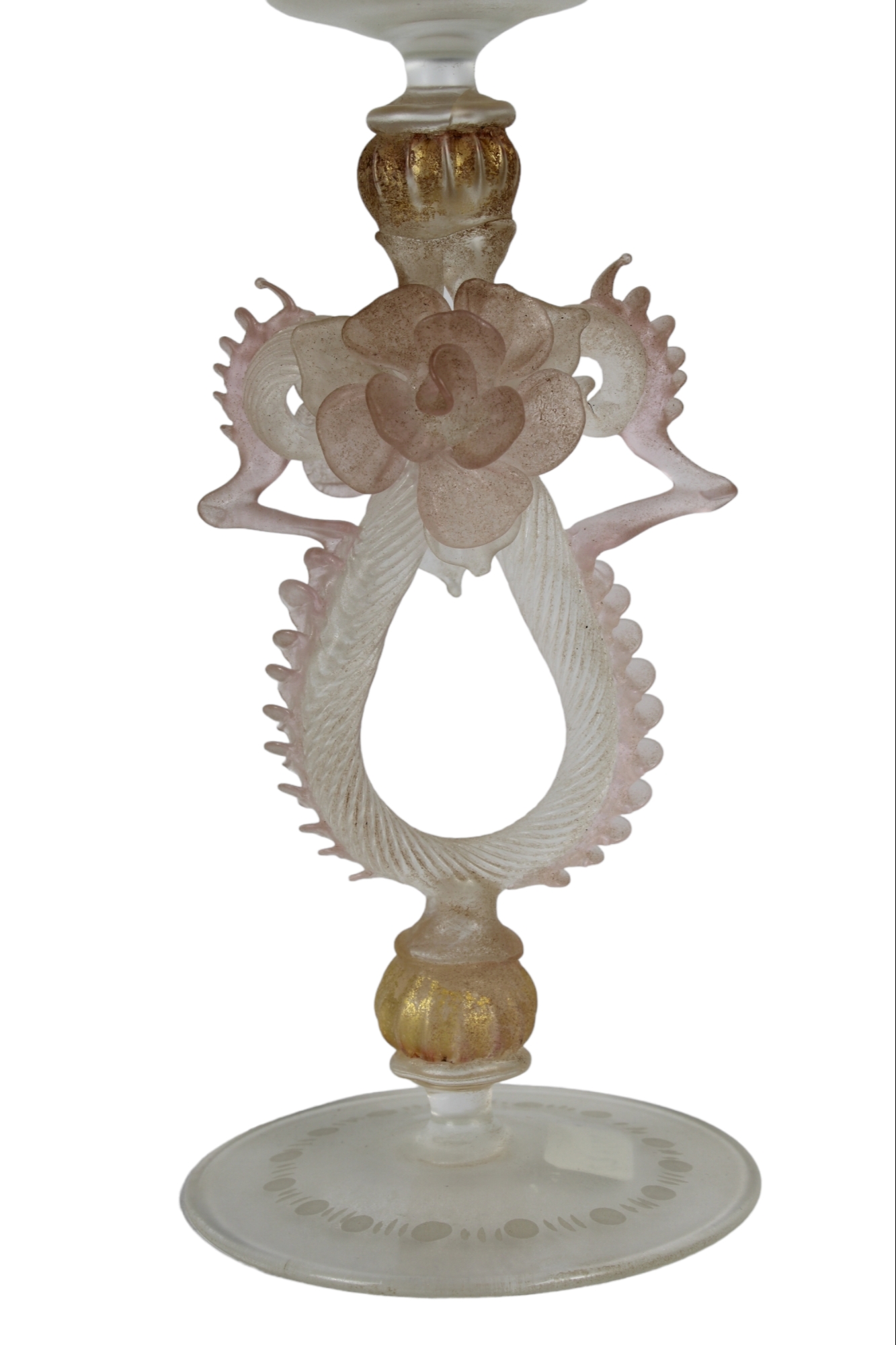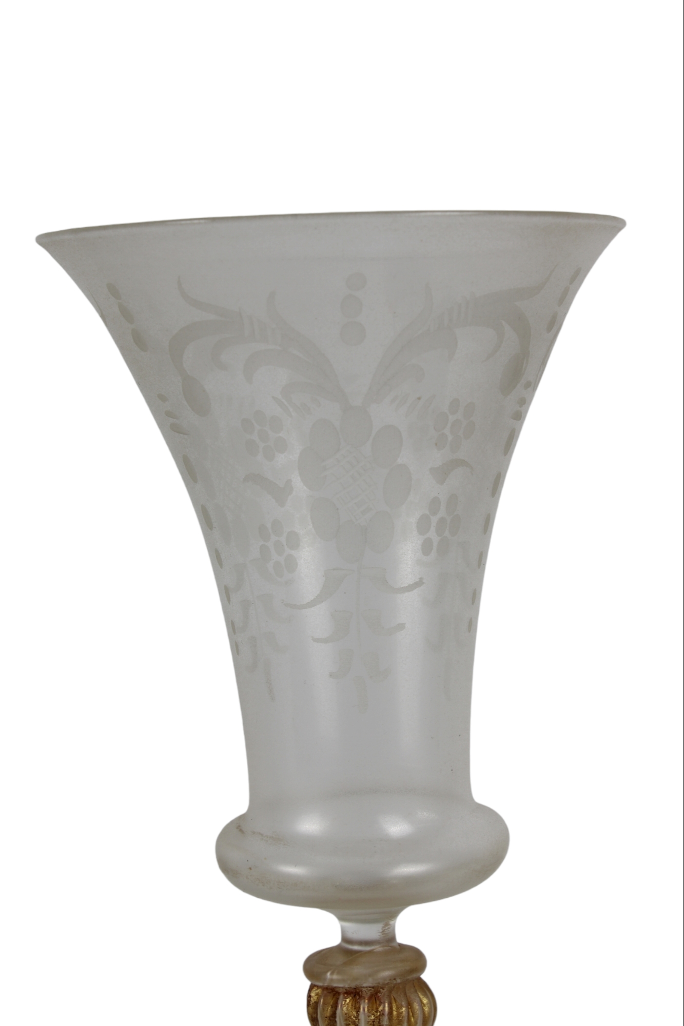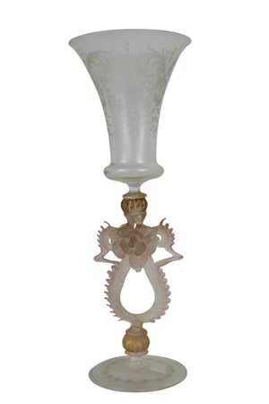 CALICE IN VETRO realizzato dalla vecchia manifattura di Murano, presenta una sagoma a pianta circolare con base svasata fusto modanato a balustro e bevante conico, la decorazione è affidata ai fiori applicati in pasta rosa ed al fine lavoro di incisione. Presenta certificato di autenticità h cm 28