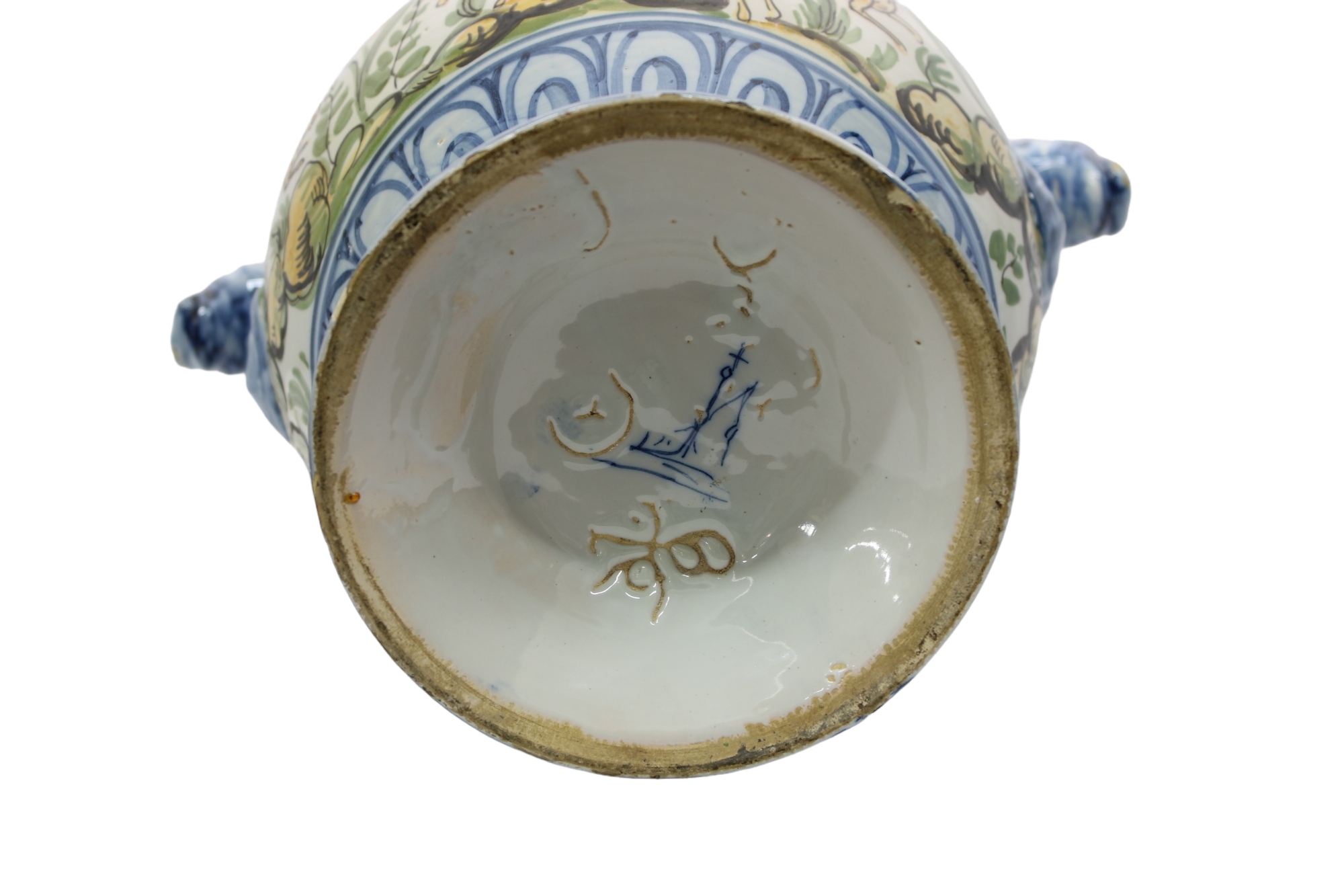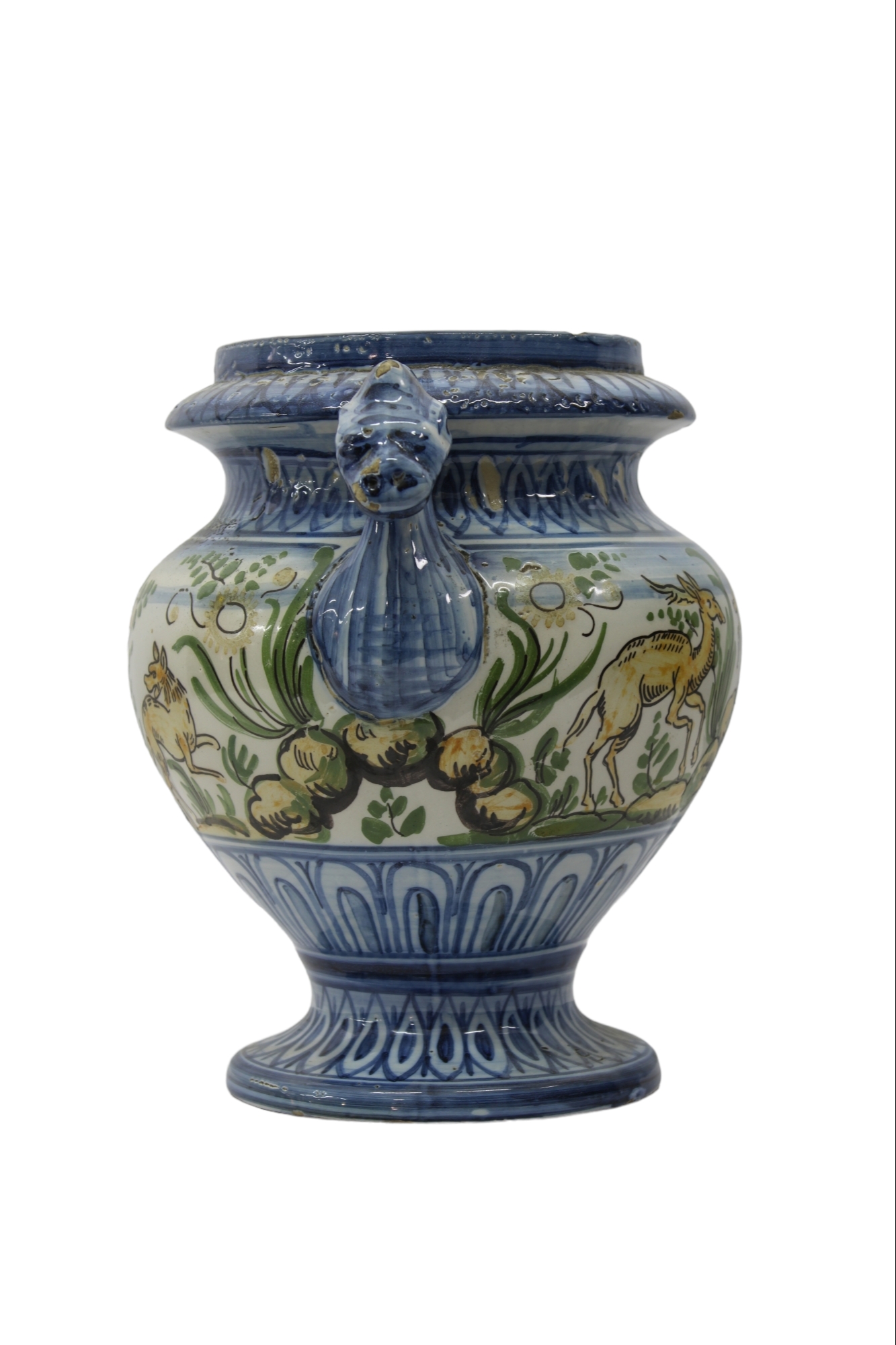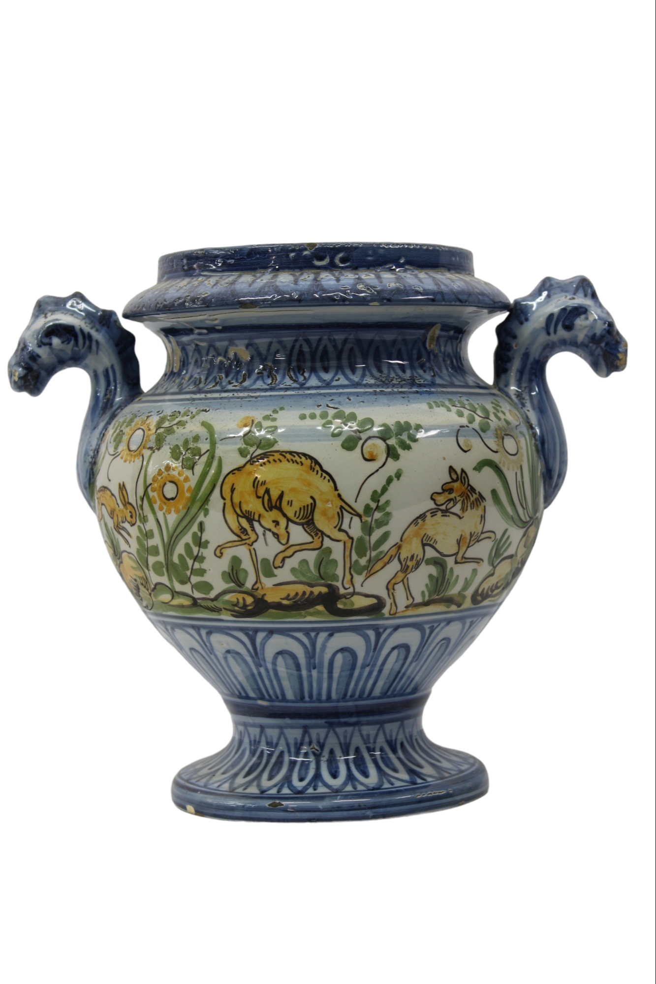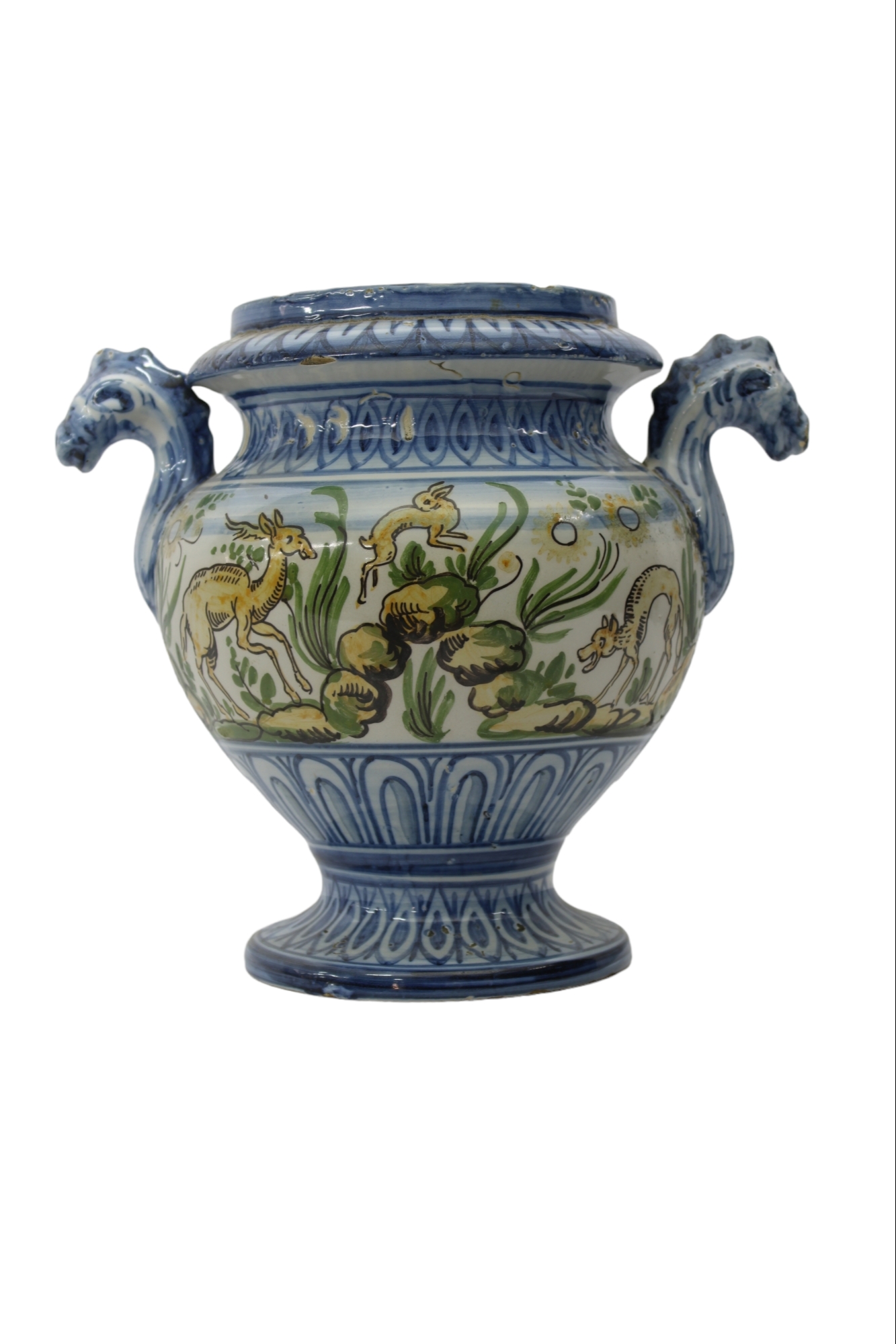 VASO DA FARMACIA in maiolica policroma raffigurante animali fantastici con manici, reca sul fondo marchio con lanterna Genova XIX secolo