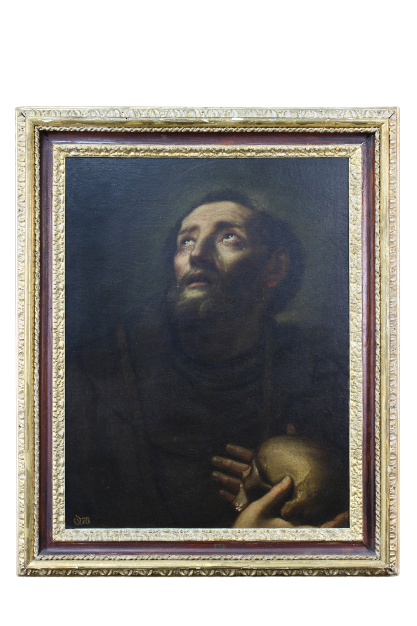 IMPORTANTE DIPINTO OLIO SU TELA Raffigurante San Francesco, dentro cornice Salvator Rosa in legno laccato e dorato, reca monogramma in basso a s/x Q78 scuola Italiana XVII secolo h cm 62 x 48 / cornice h cm 80 x 65