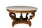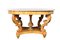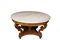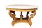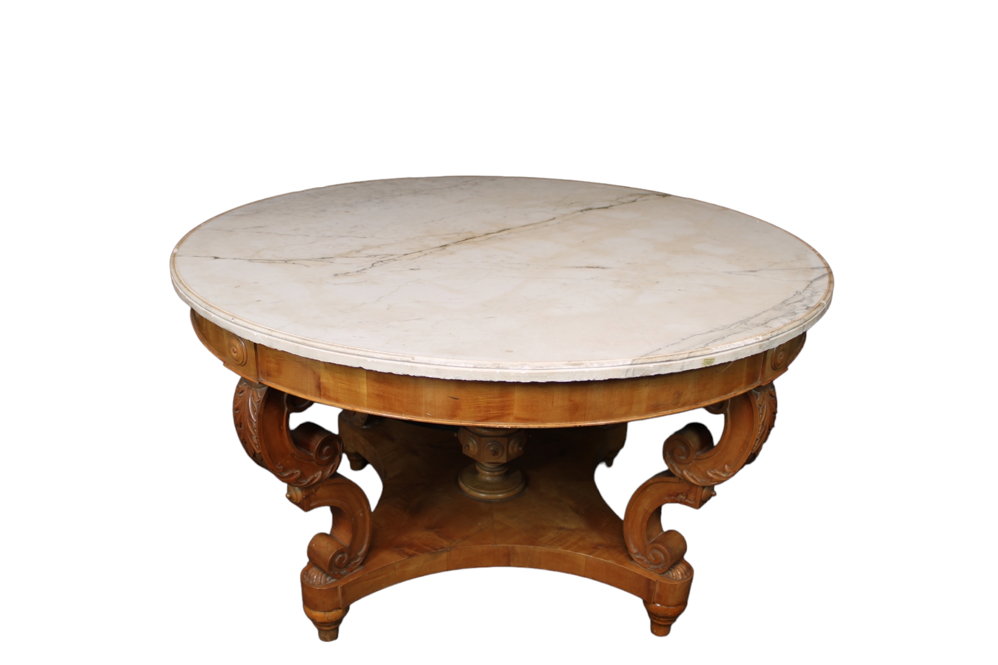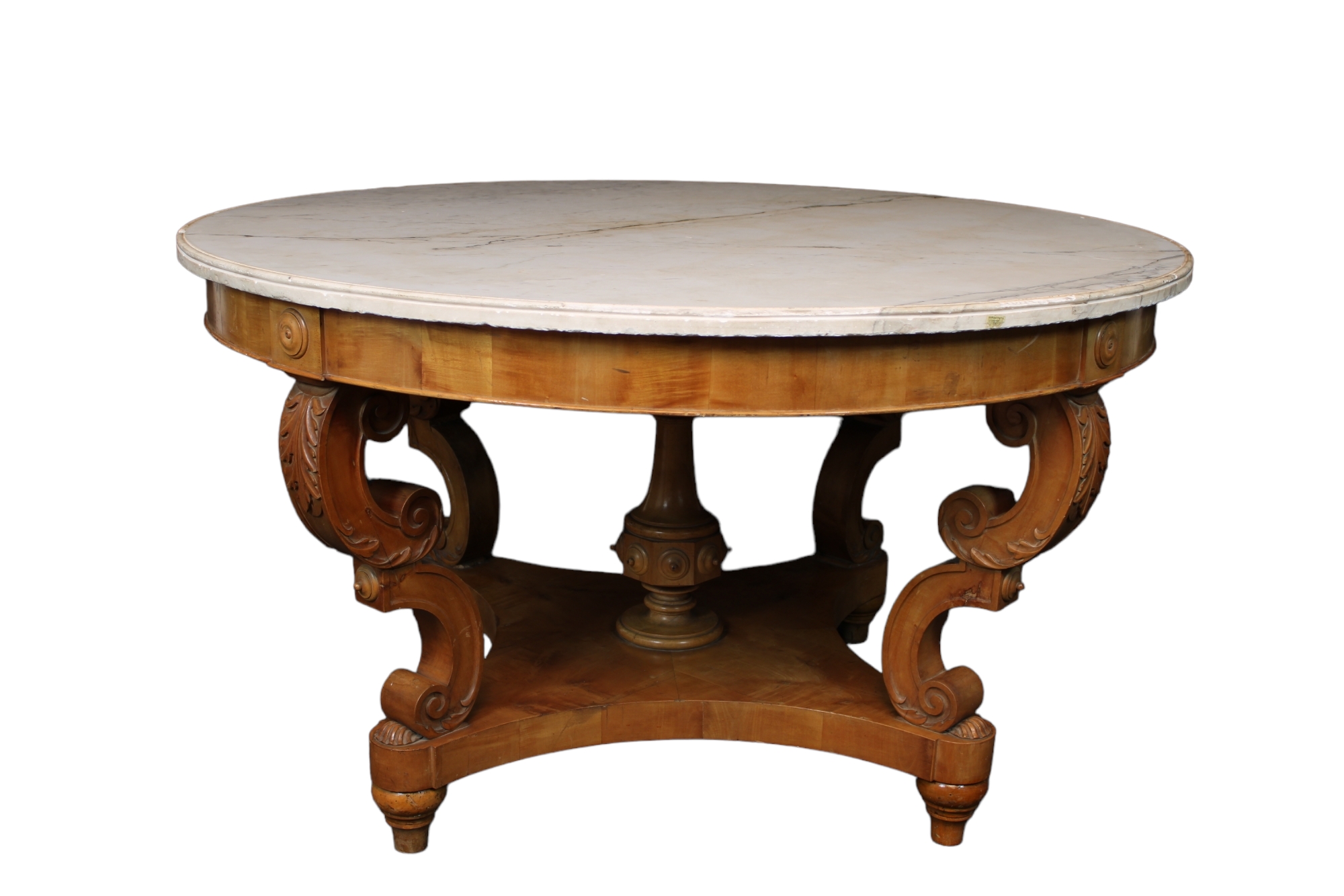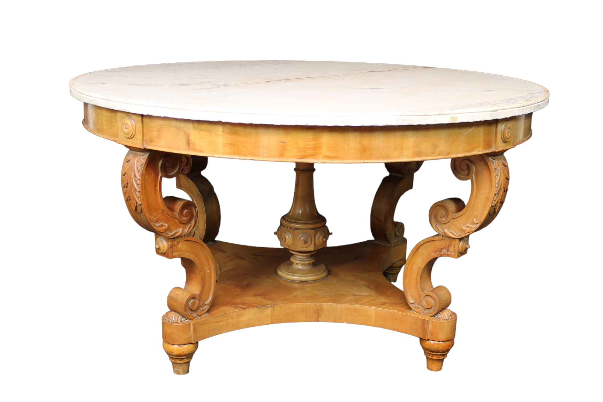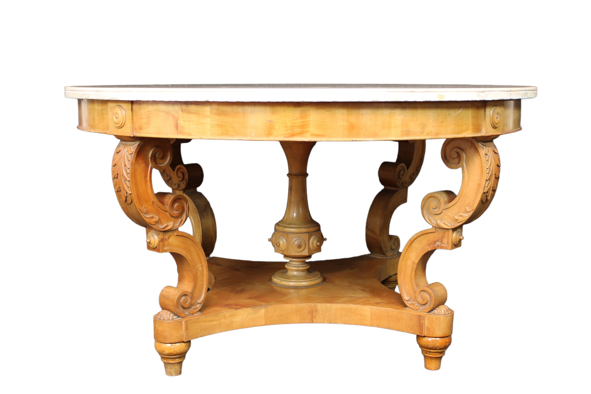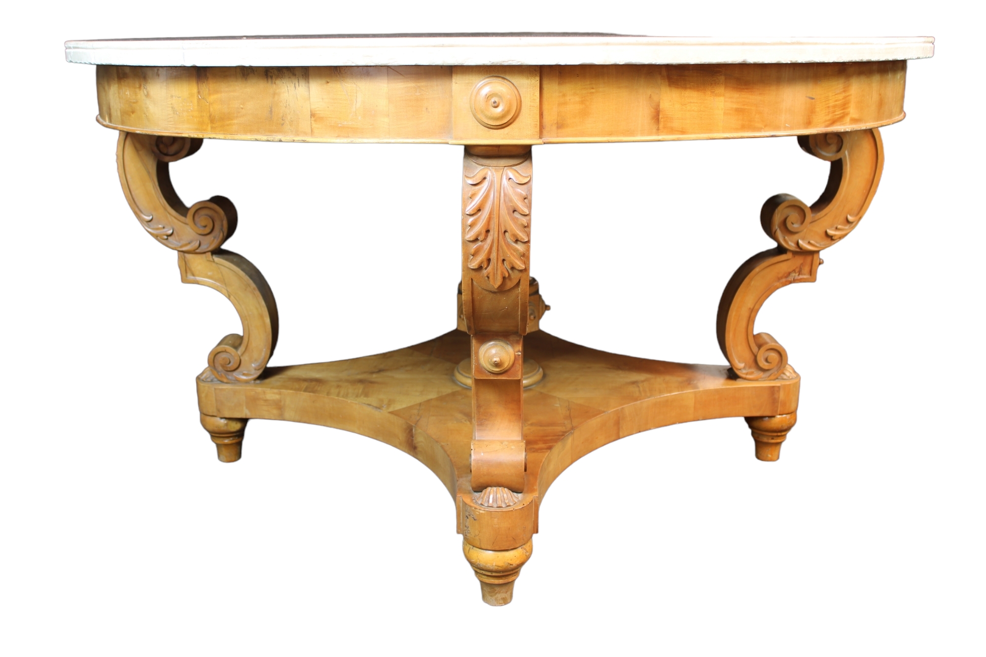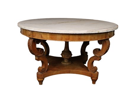 IMPORTANTE TAVOLO DA CENTRO in legno di acero finemente scolpito a motivi fogliacei e conchiglie, piano in marmo bianco Genova 1810 circa h cm 79 x Ø 141