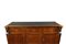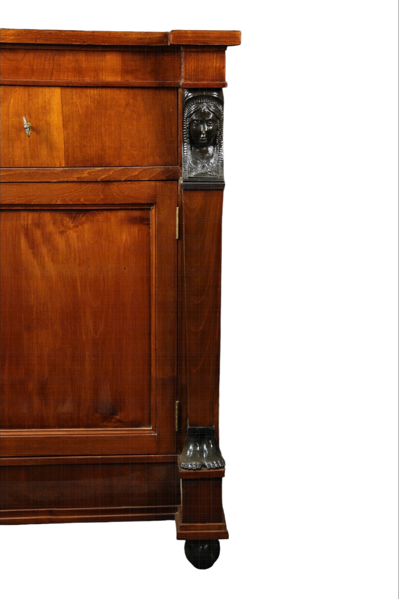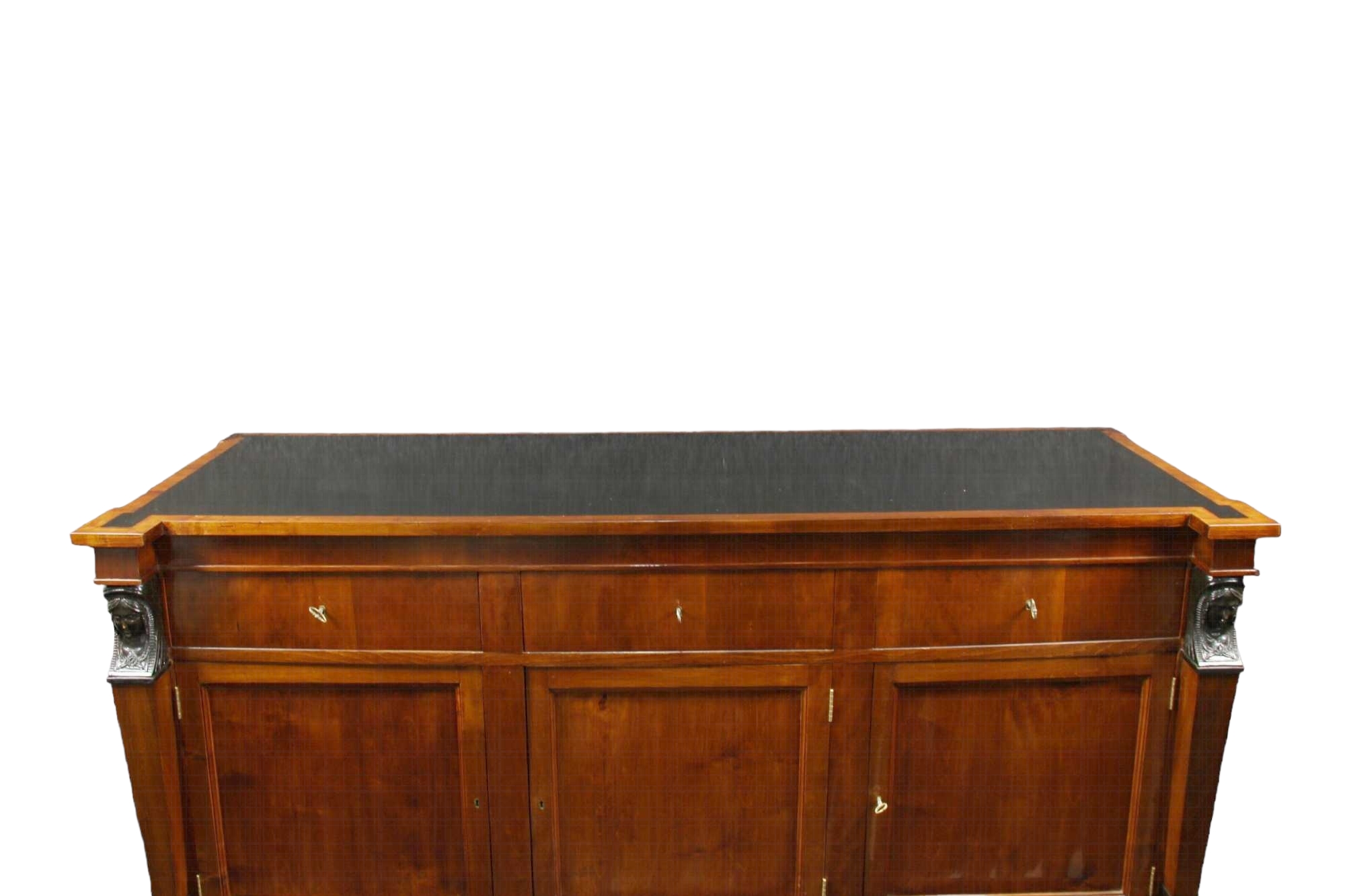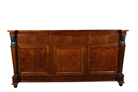 GRANDE CREDENZA a 3 sportelli e 3 tiretti in piuma di mogano , lesene laterali arricchite da figure femminili in legno ebanizzato, piano in ebano bordato in mogano Italia XIX secolo h cm 101 x 200 x 77
