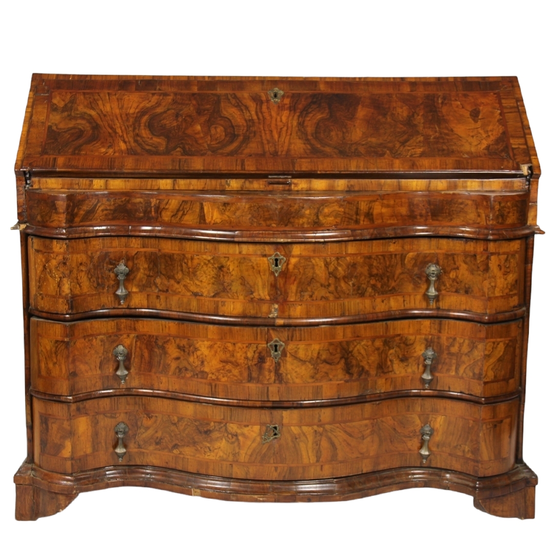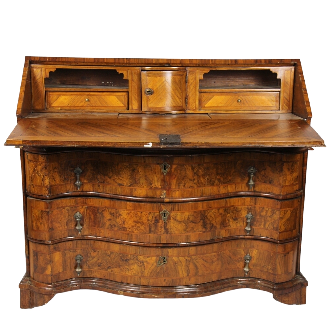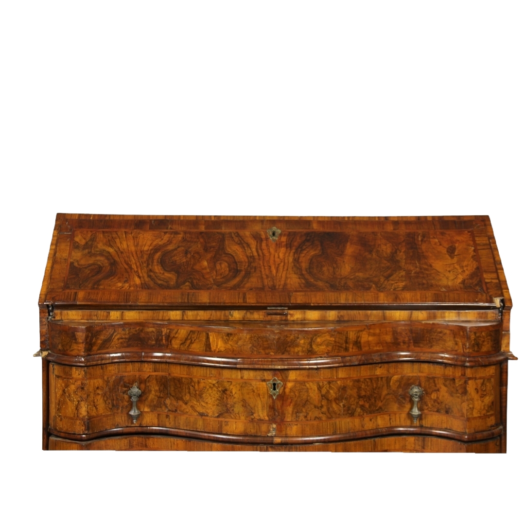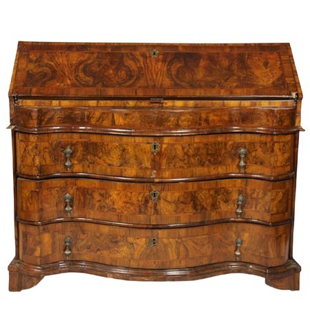 PREGIATA RIBALTA in radica di noce, con calatoia che cela scarabattolo con vani e tiretti, il fronte mosso presenta 3 tiretti con andamento a doppio movimento Venezia XVIII sedolo h cm 107 x 121 x 60