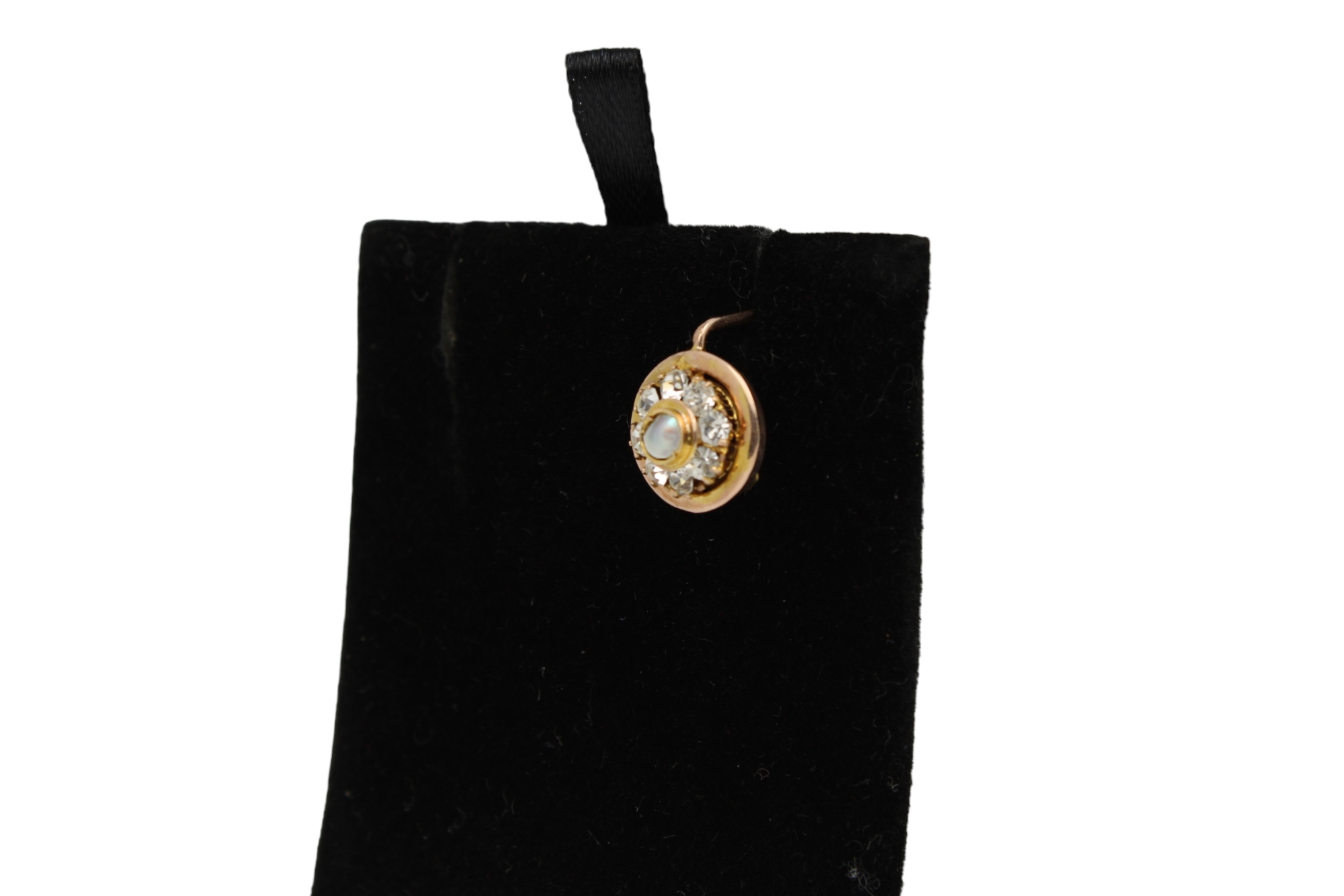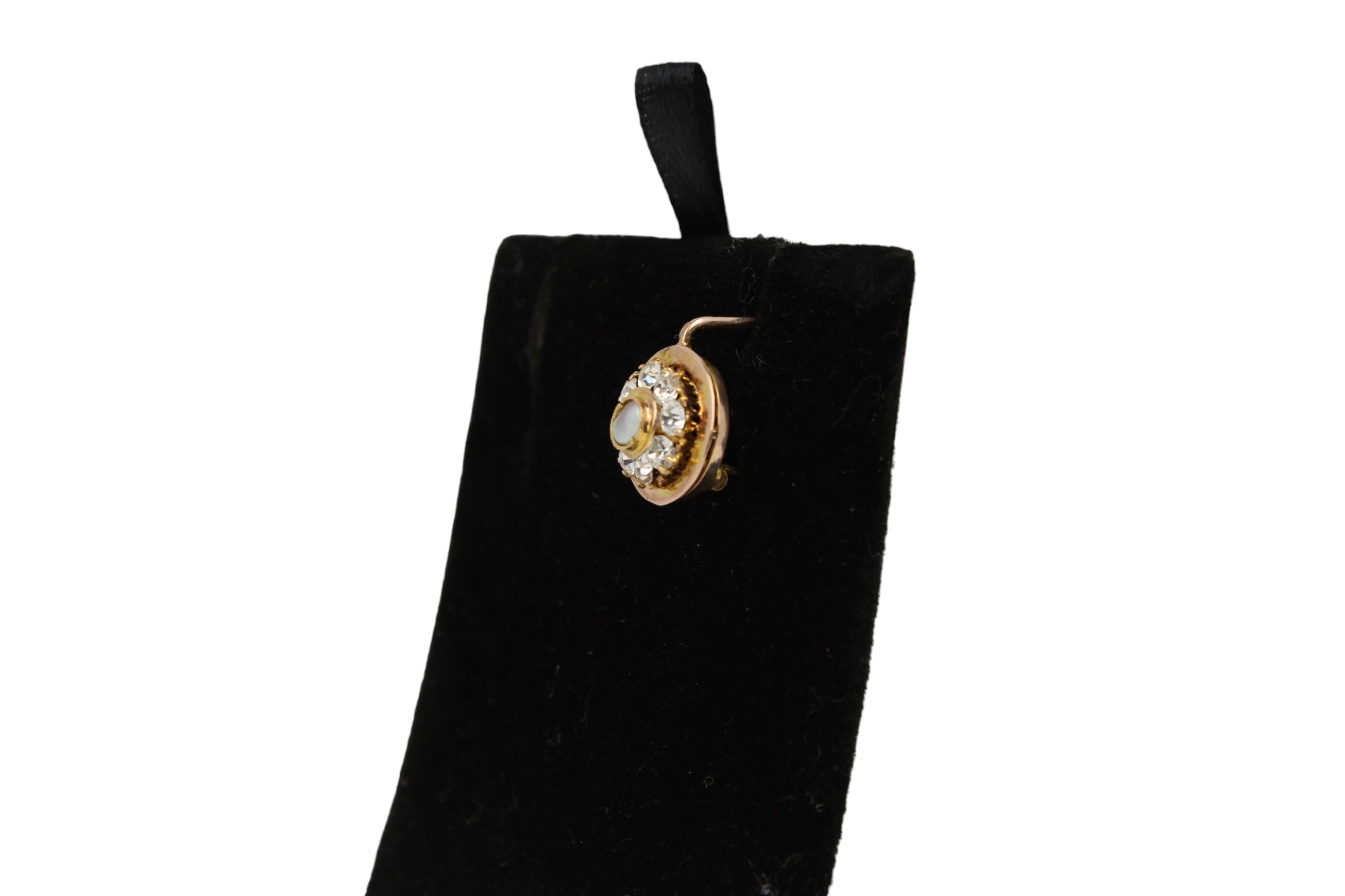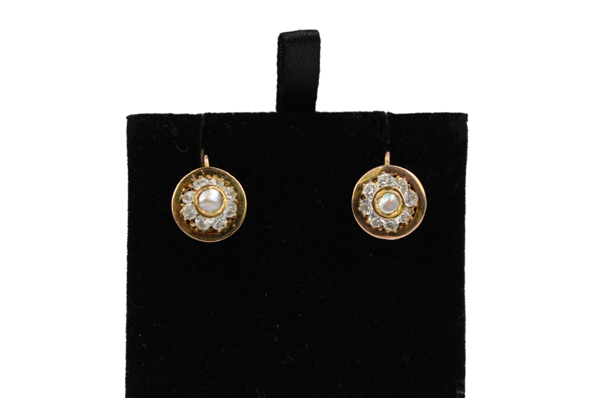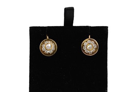 ORECCHINI A BOCCOLA con fiore di zaffiri bianchi e centro in madreperla, oro basso titolo
