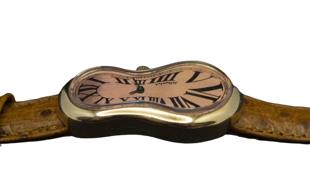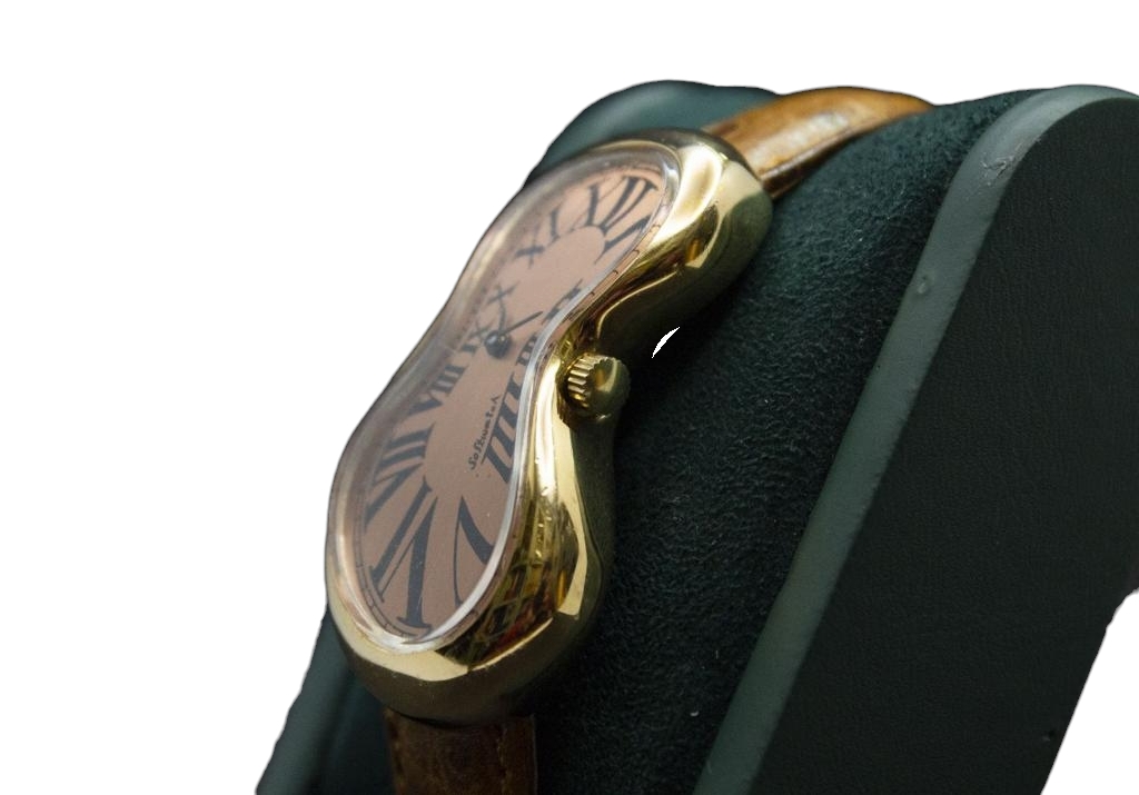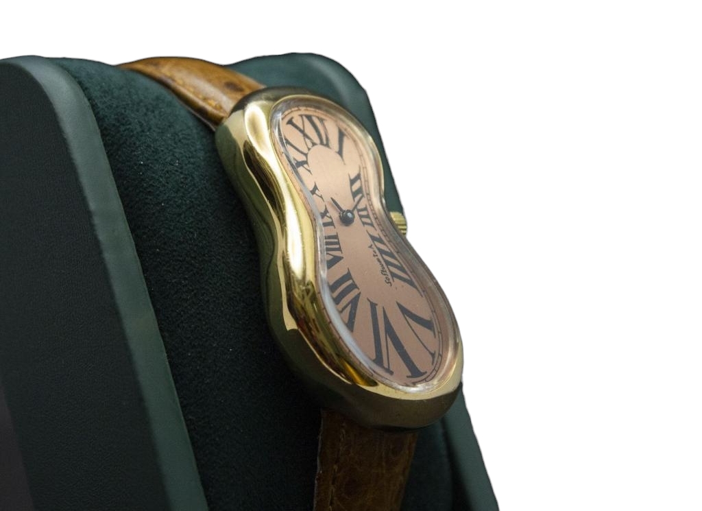 SOFTWATCH EXAEQUO SALVADOR DALI con dial salmone e cinturino originale dell'epoca. Questi orologi venivano venduti direttamente nel Museo Dalì a Figueres, luogo magico ed estroso tanto quanto le forme di queste casse. La peculiarità di questo esemplare oltre al dial, è la scritta "Softwatch" a ore 4. Pezzo molto bello e particolare.