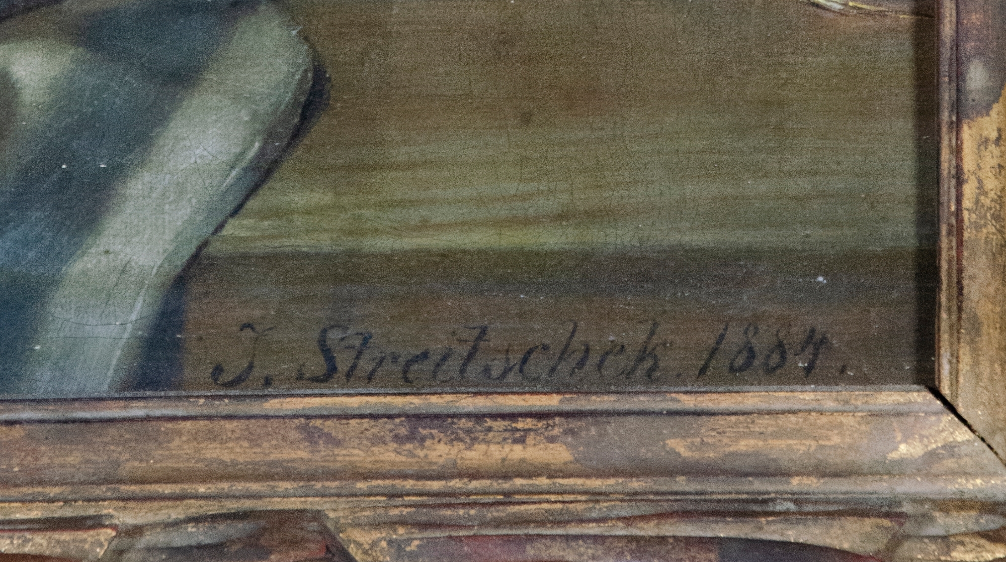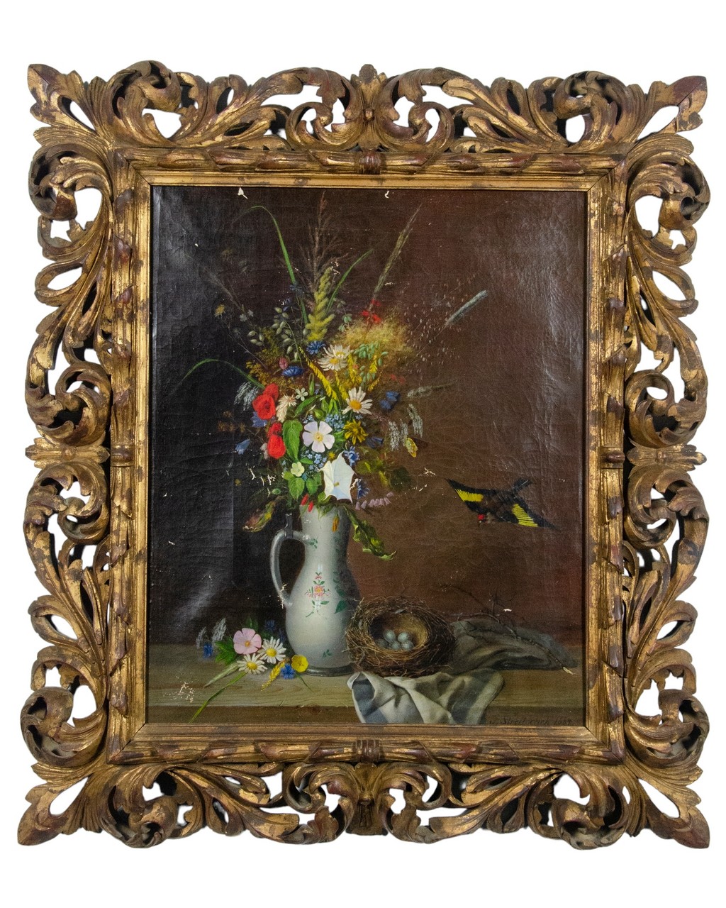 IMPORTANTE OLIO SU TELA Raffigurante natura morta con vaso , nido e cardellino , firmata e datata in basso a destra J. STRETSCHEK 1887, cornice riccamente intagliata a motivi fogliacei accartocciati Fine XVIII secolo h cm 59 x 72 / cornice h cm 100 x 87