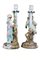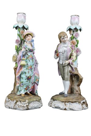 COPPIA DI CANDELIERI MONOCERA in porcellana policroma raffigurante personaggi manifattura francese XIX secolo h cm 34 x 13