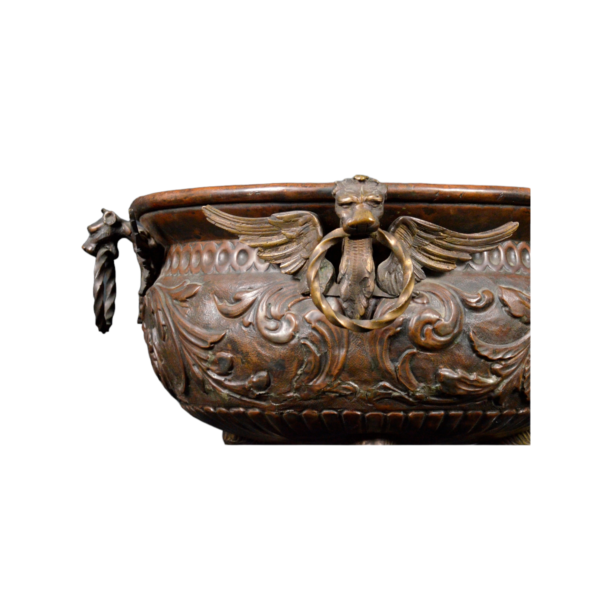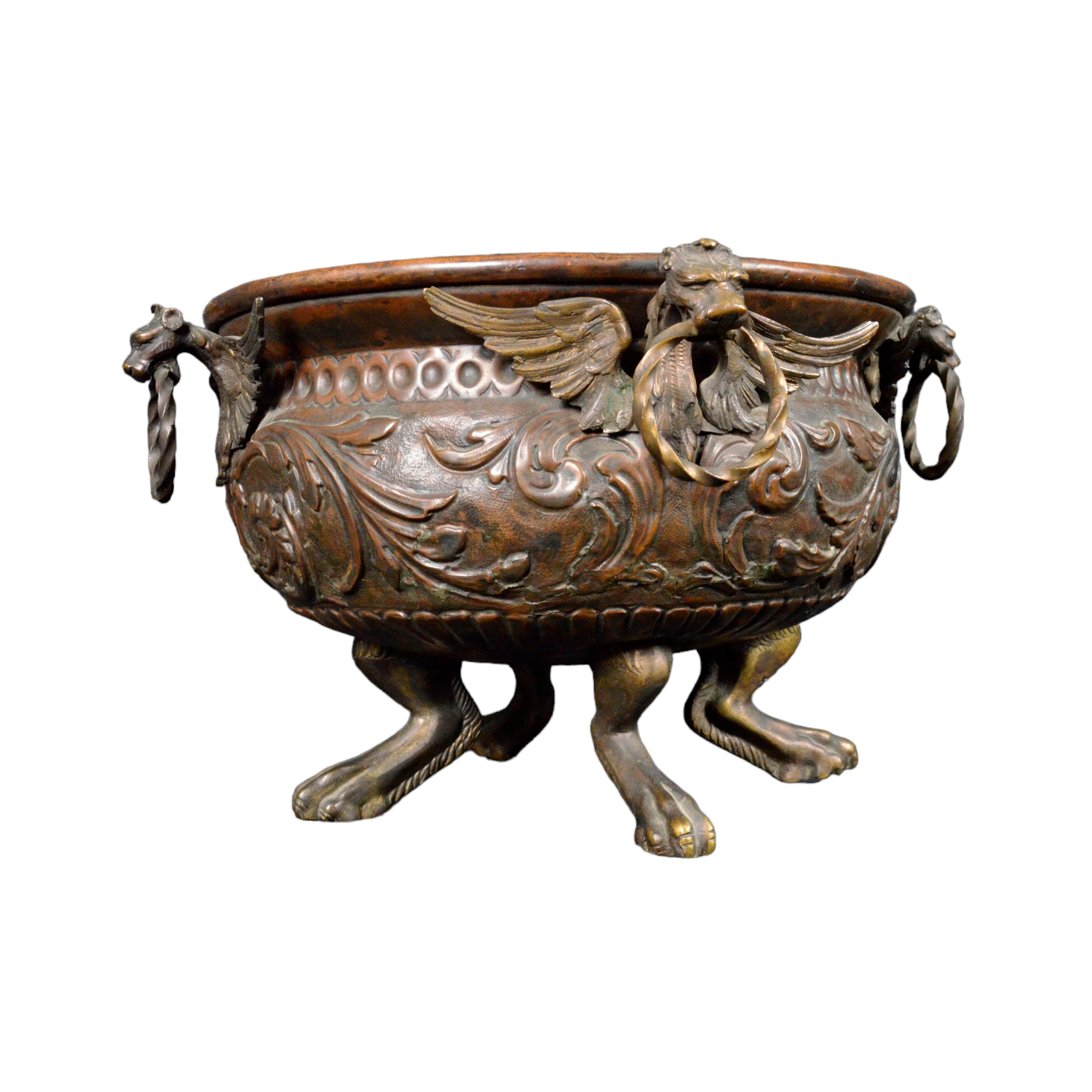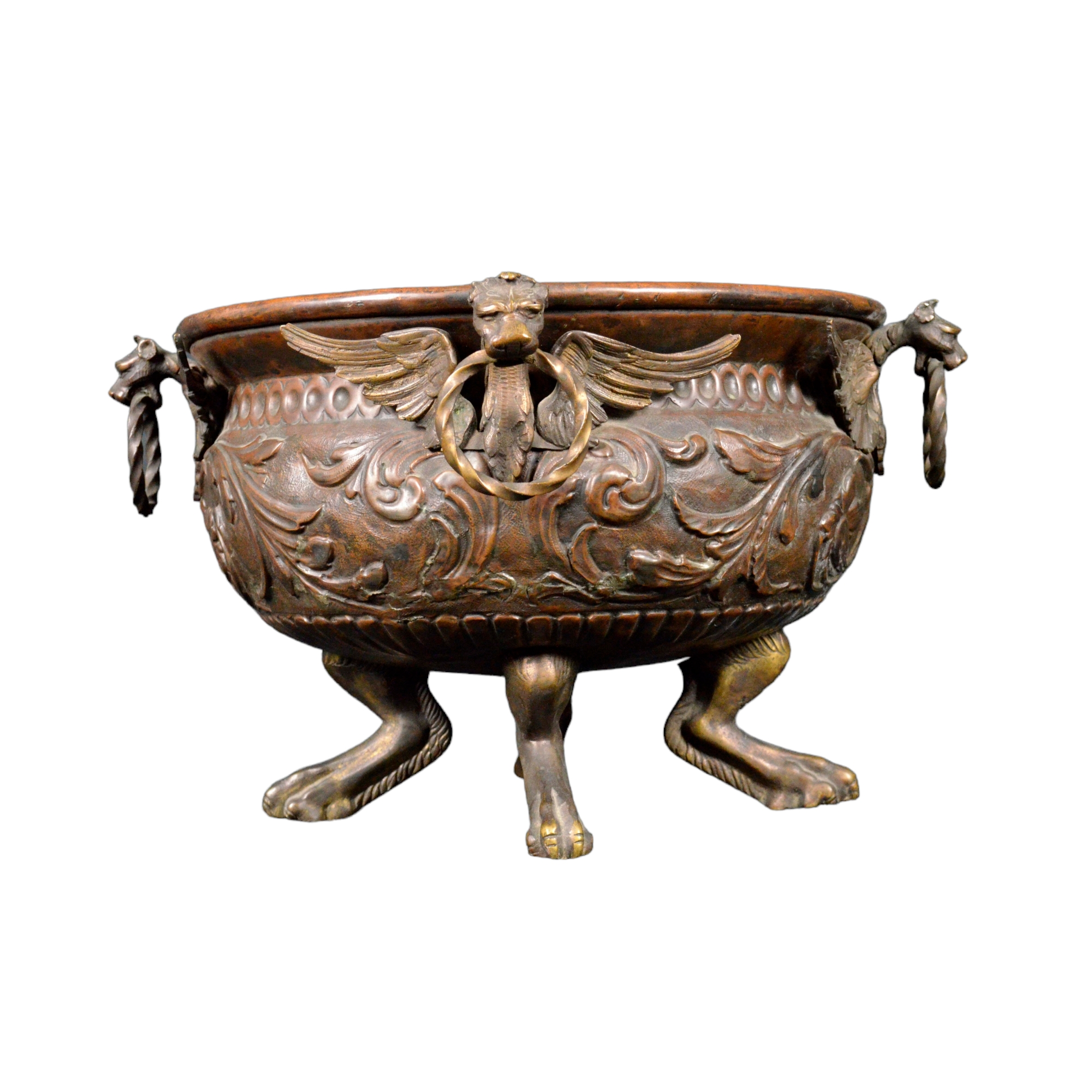 CACHEPOT in rame finemente sbalzato piedi ed applicazioni in ottone brunito Italia XVIII secolo h cm 25 x Ø 41,5