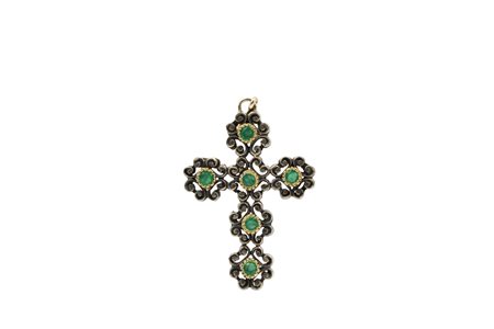 CROCETTA in oro basso titolo e coppella traforata e tempestata da piccoli diamanti e smeraldi manifattura Italia Meridionale anni 60/70 circa
