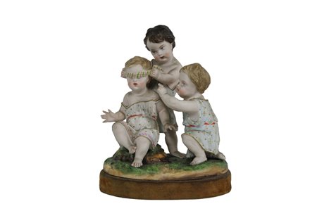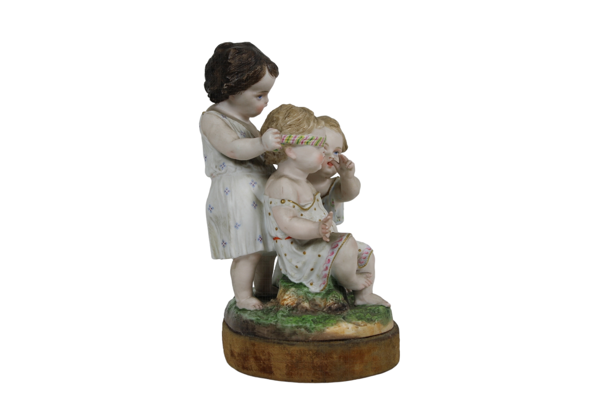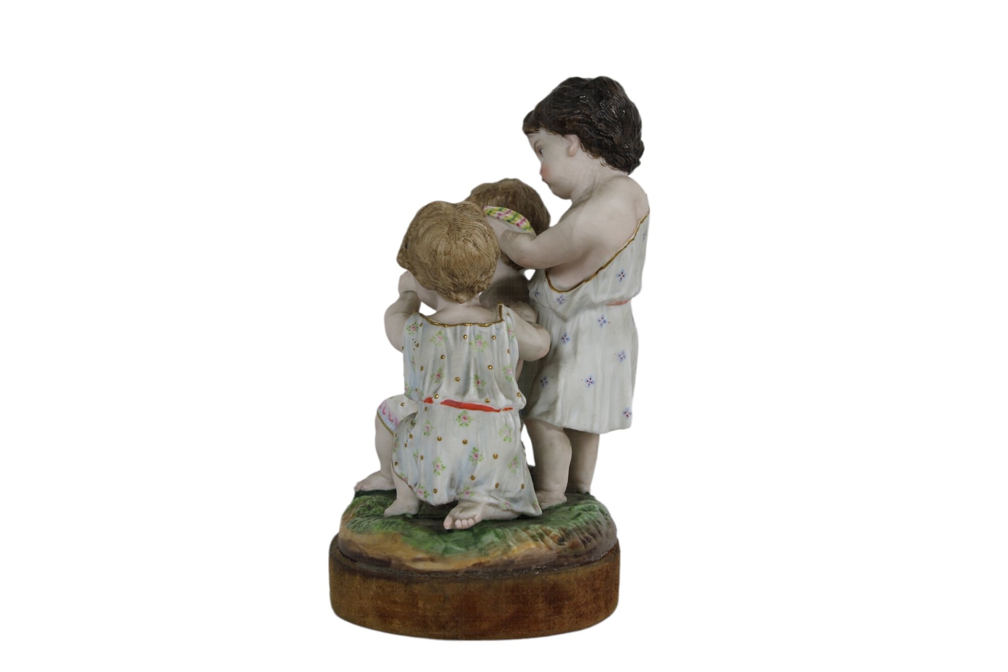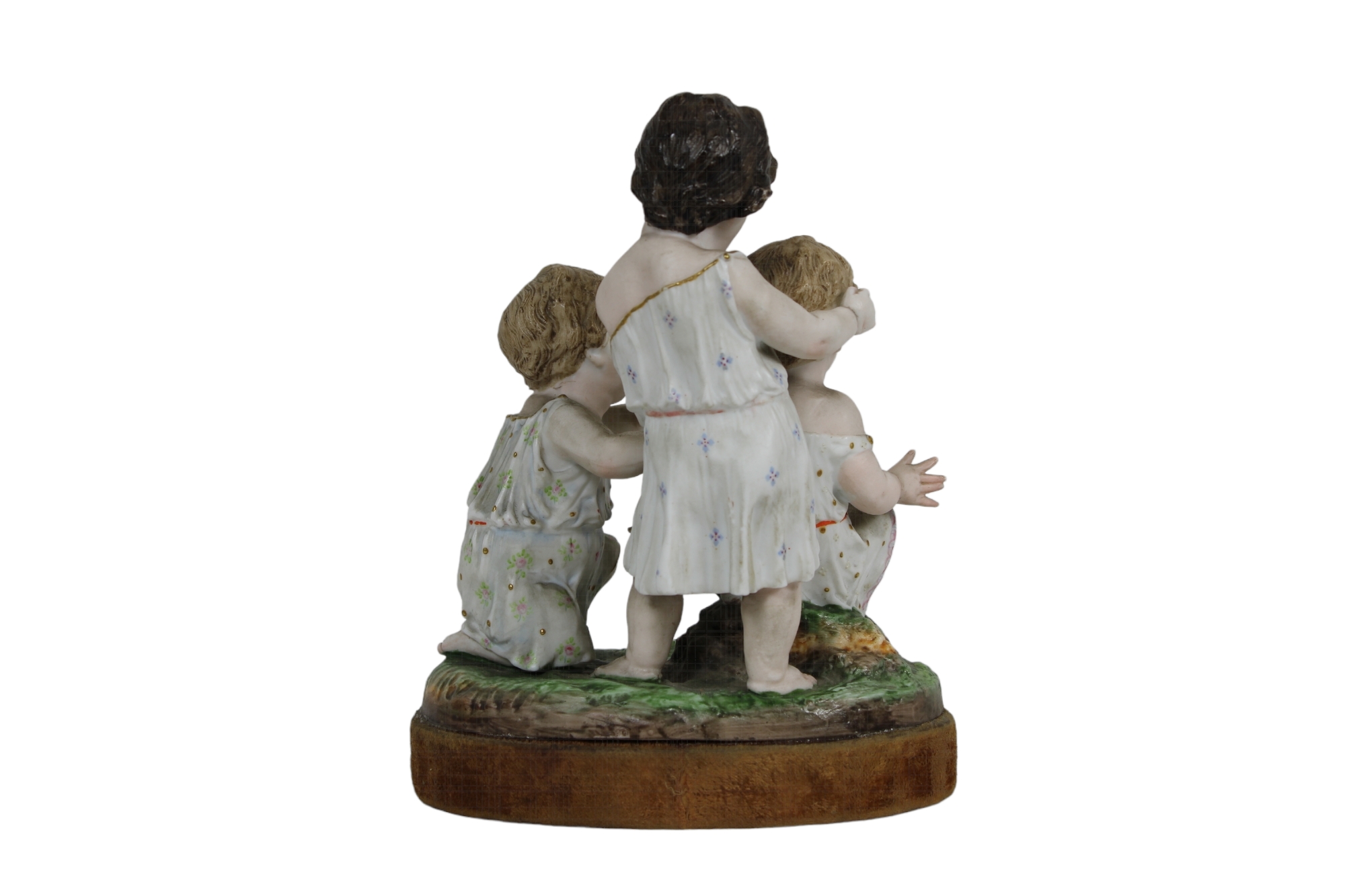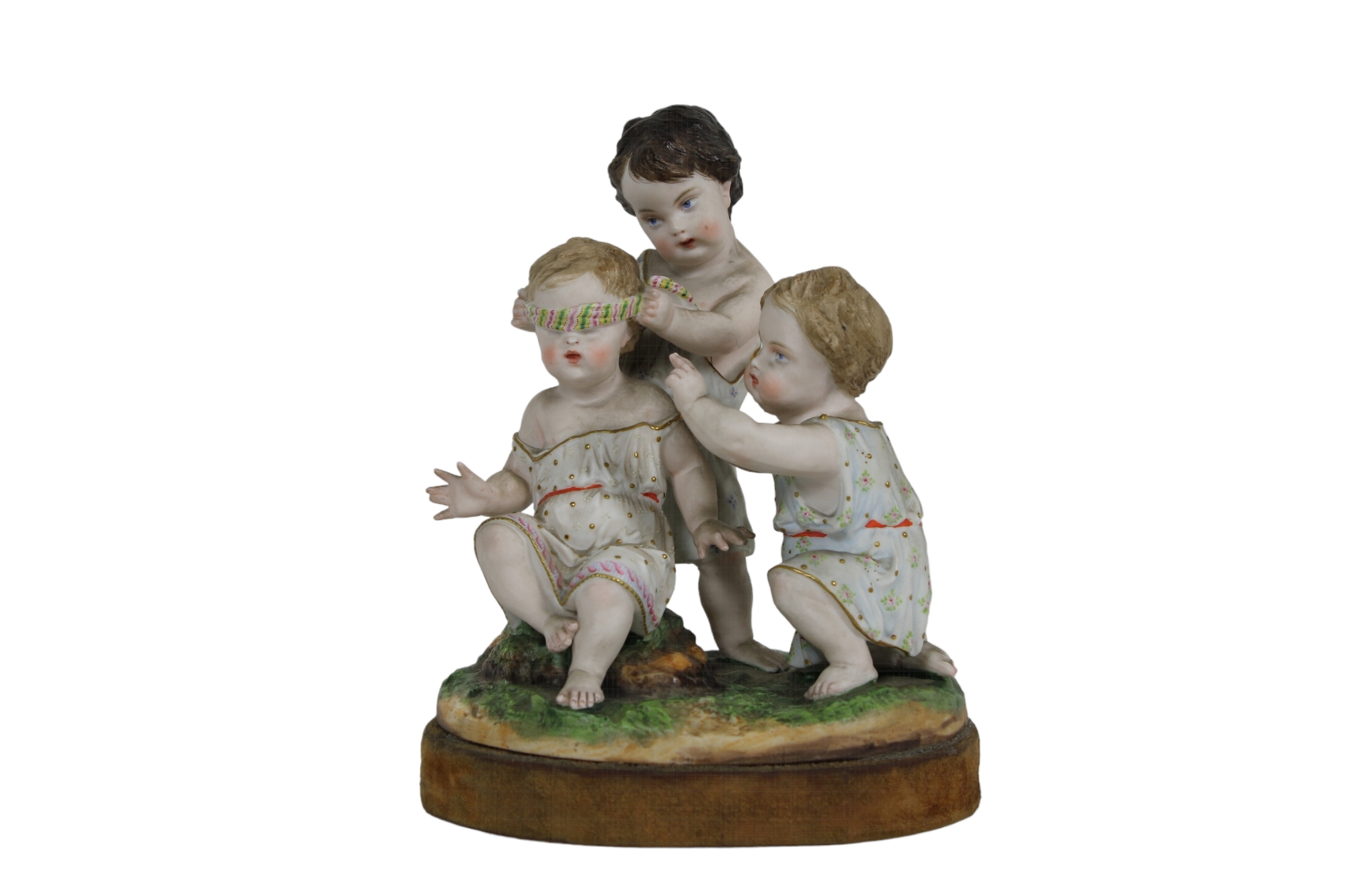 GRUPPO SCULTOREO in biscuit dipinto raffigurante bambini che giocano Francia fine XIX secolo h cm 19,5 x 15 x 11