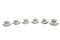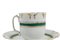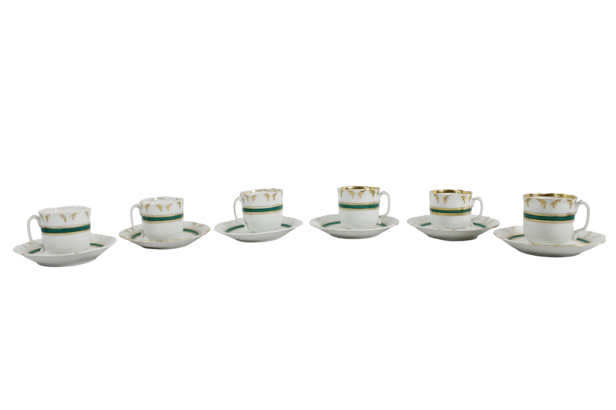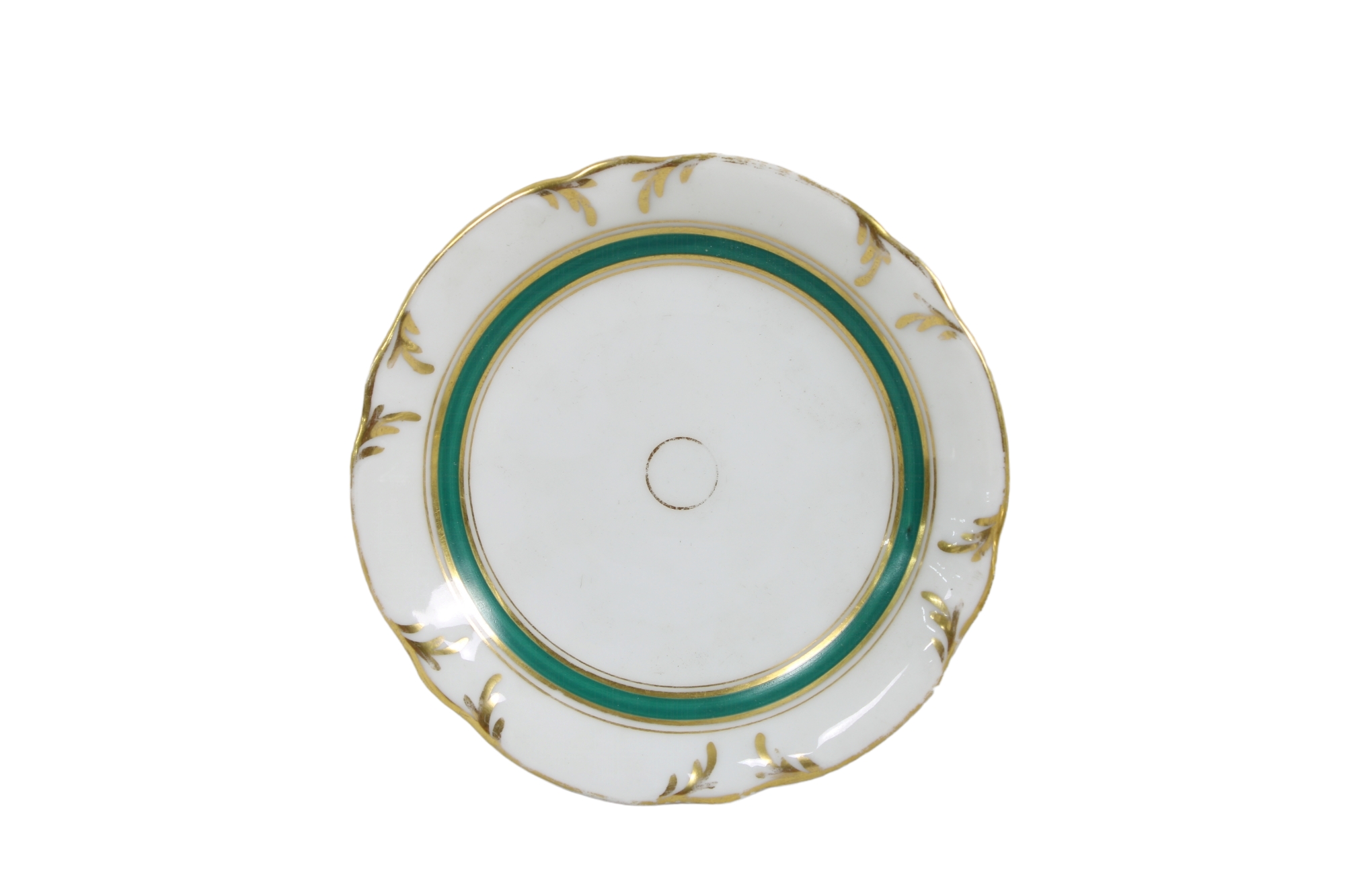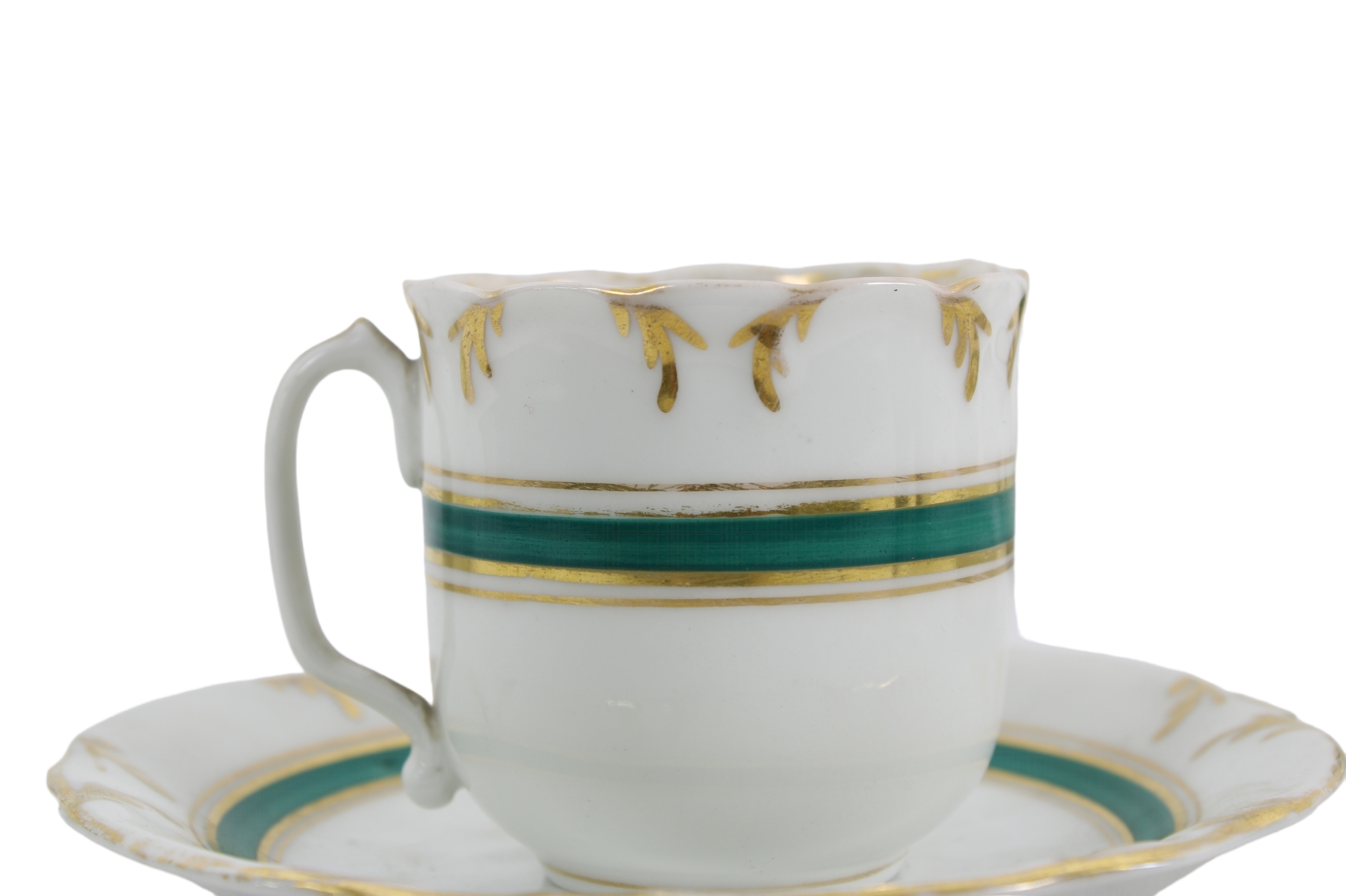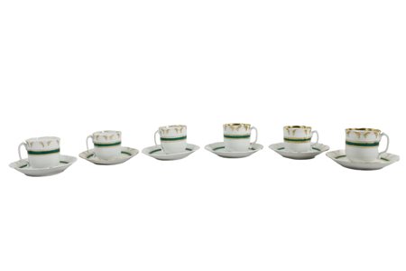 6 TAZZINE CON PIATTINO in porcellana bianca e perfilati nel tono del verde con lumeggiature in oro Inghilterra XIX - XX secolo