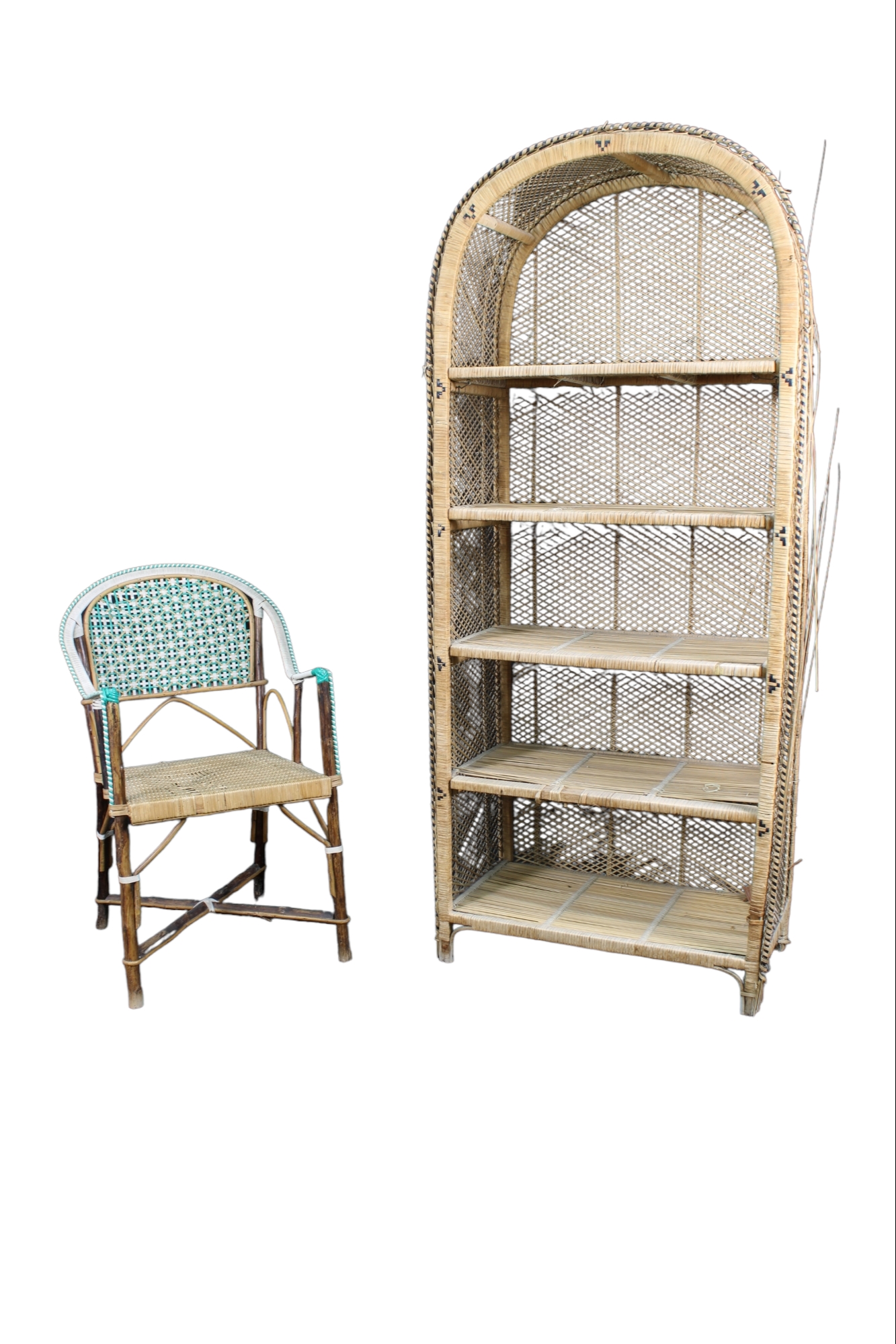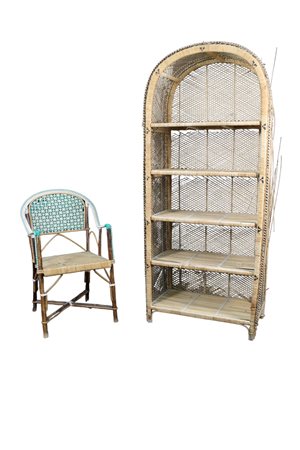 ETAGERE CON POLTRONA in vimini vintage italiano XX secolo h cm 186 x 81 x 42 / h cm 93 x 57 x 44