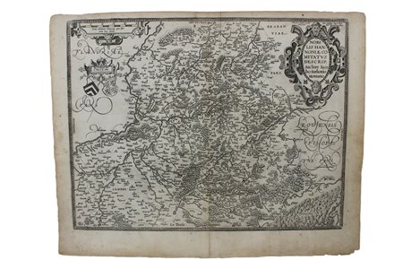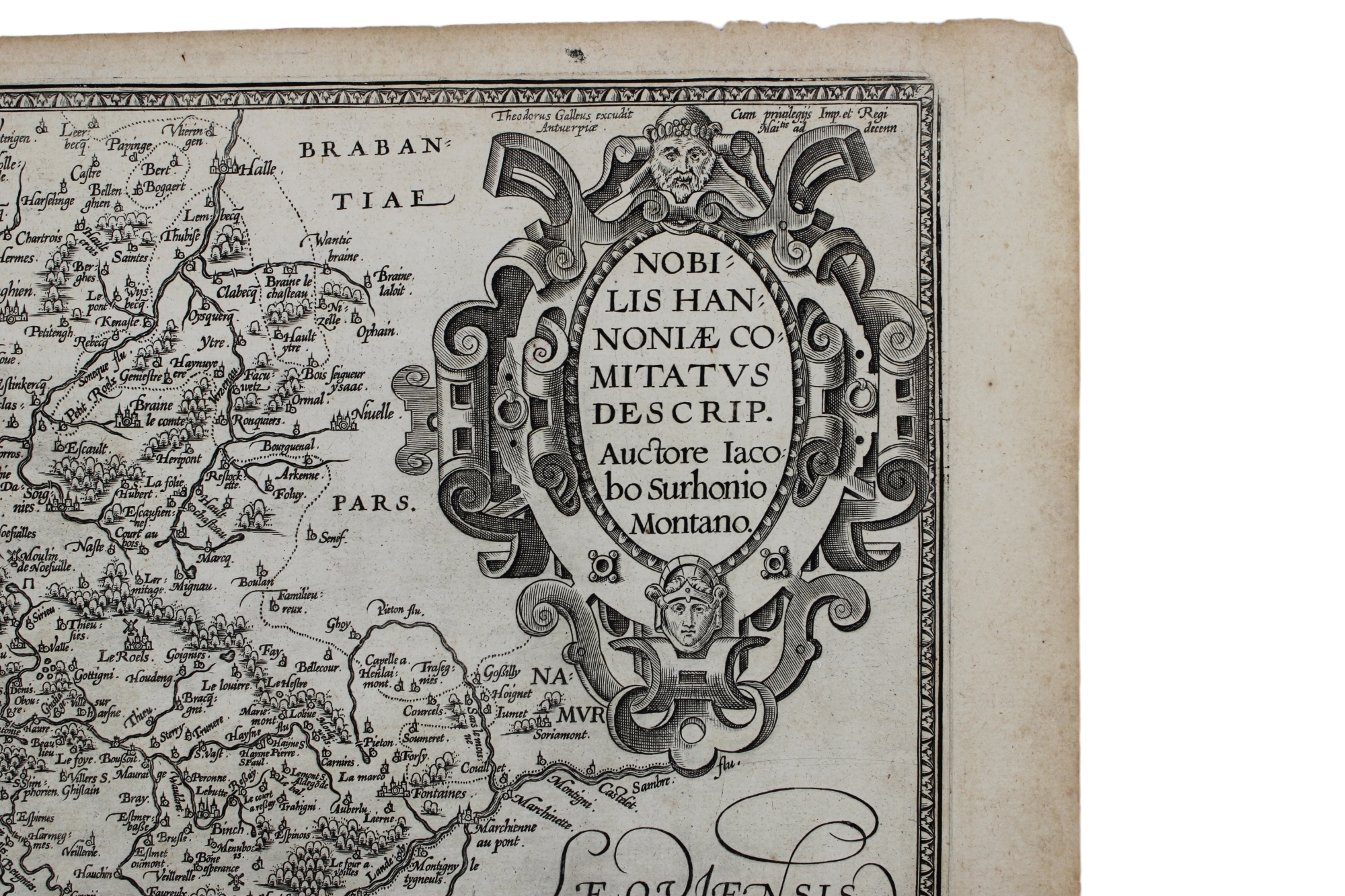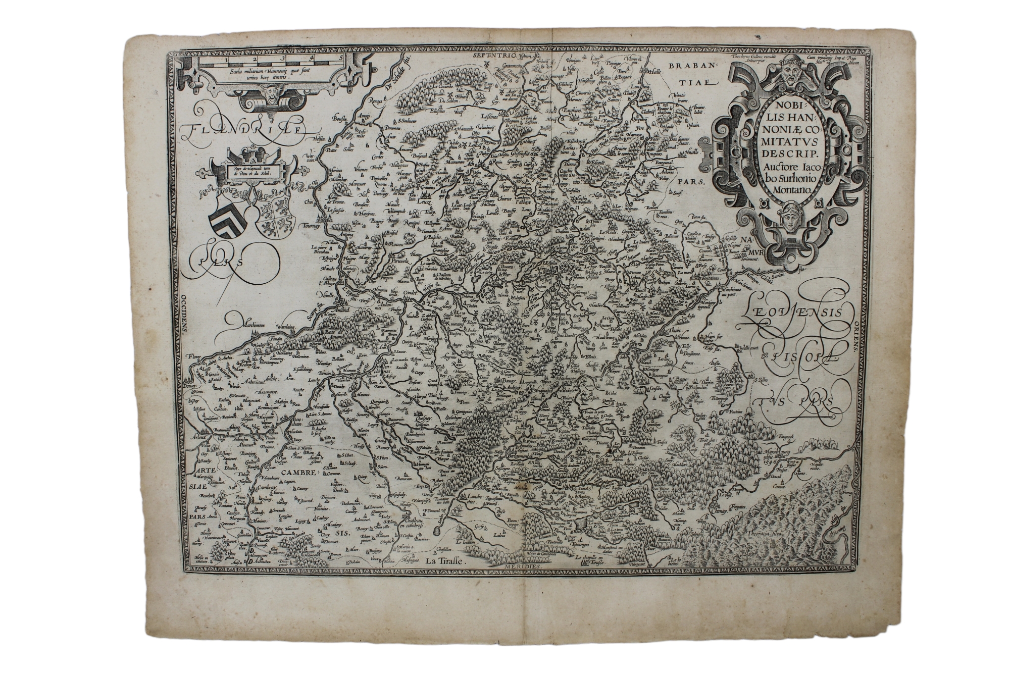 CARTINA GEOGRAFICA SURMONIO Jacopo Montano ORTELIUS Abraham (1527-1598)(Belgio) Nobilis Hannoniae Comitatus descriptio… ( Anversa 1571). Titolo entro cartiglio in alto a destra. Incisione rame