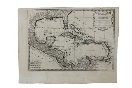 CARTINA GEOGRAFICA D’ANVILLE Jean BaptisteBourgum (1697-1782) (America centr.Isole Caraibiche) Carta de l’Isles de l’Ameriqu et deplusieres Pays de Terre ferme située au devant de cesisles…sur un grand nombre de cartes particulieres et sur instrucions de navigateurs par le sr.D’Anville ,mars 1791. Incisione rame. Per la precisione delle descrizioni riportate in questa carta basata sulle recenti scoperte dell’epoca, le carte geografiche eseguite da Jean B. D’Anville sono considerate le migliori dell’epoca. Tutti i carteggi e la sua collezione dopo la morte passarono al Museo del Louvre , e poi alla Biblioteca Nazionale di Francia.
