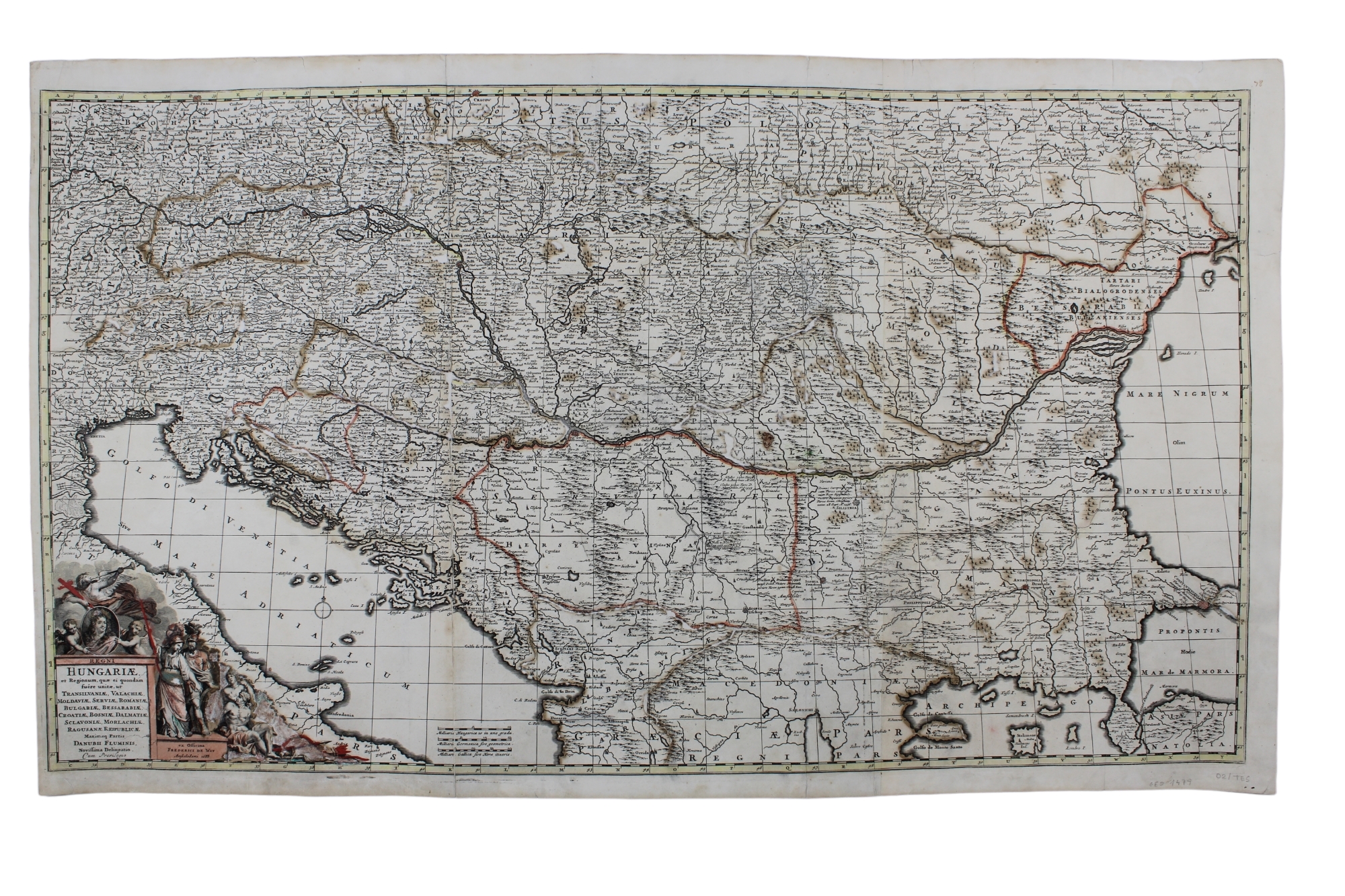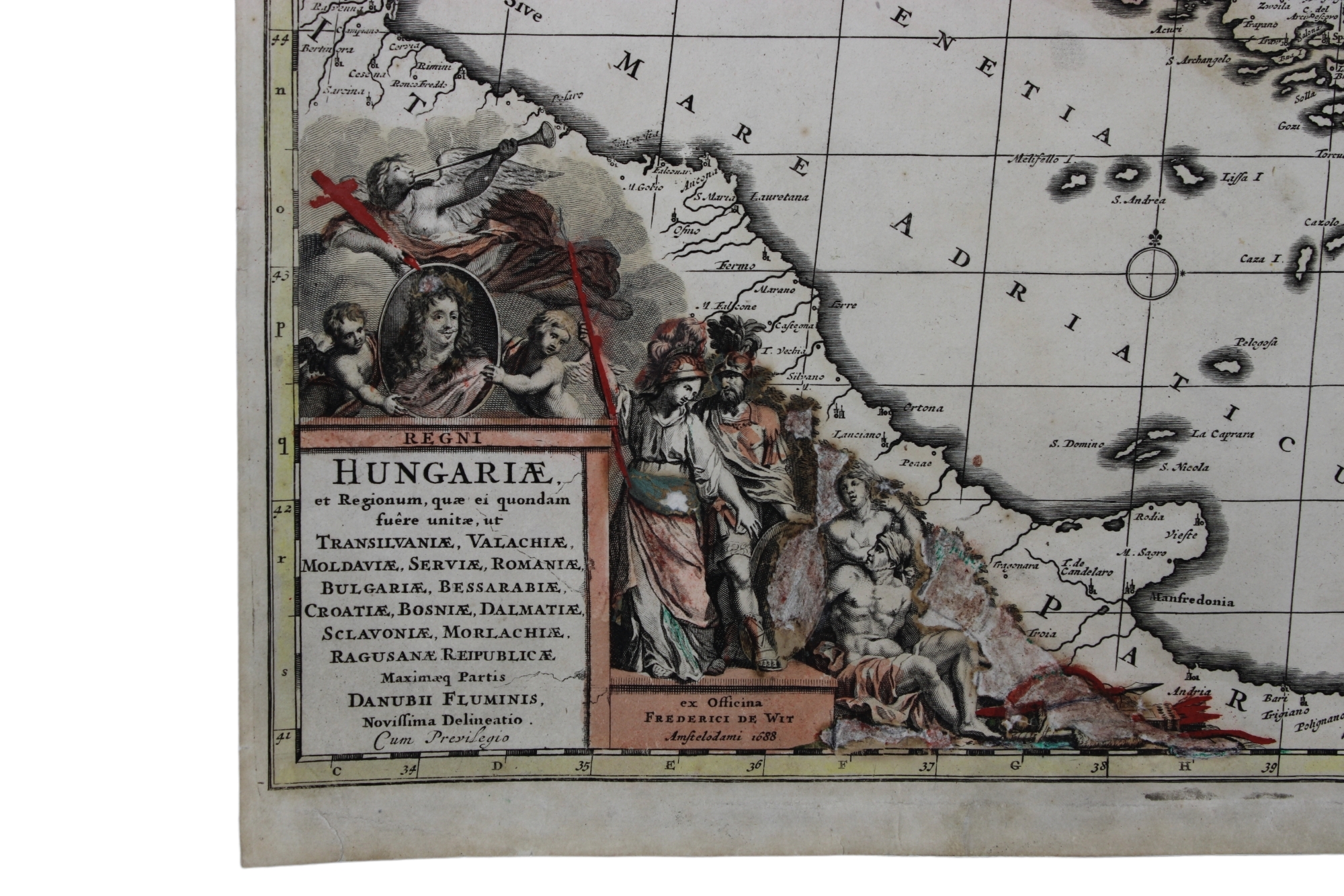 CARTINA GEOGRAFICA DE WITT Frederick ( 1630-1706 ) (Ungheria)Regni Ungariae et Regionum quae ei quondam fuere unitae…Moldaviae,Serviae, partis Danubi Fluminis novissima delineata 1688.Titolo entro cartiglio ornato da figure allegoriche. La carta è stata stampata ad Amsterdam nel 1688. Incisione rame coloritura originale d’epoca