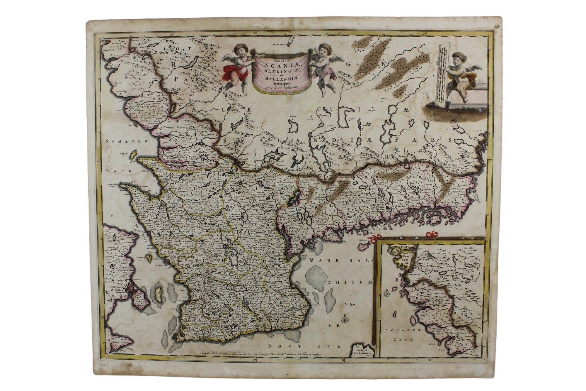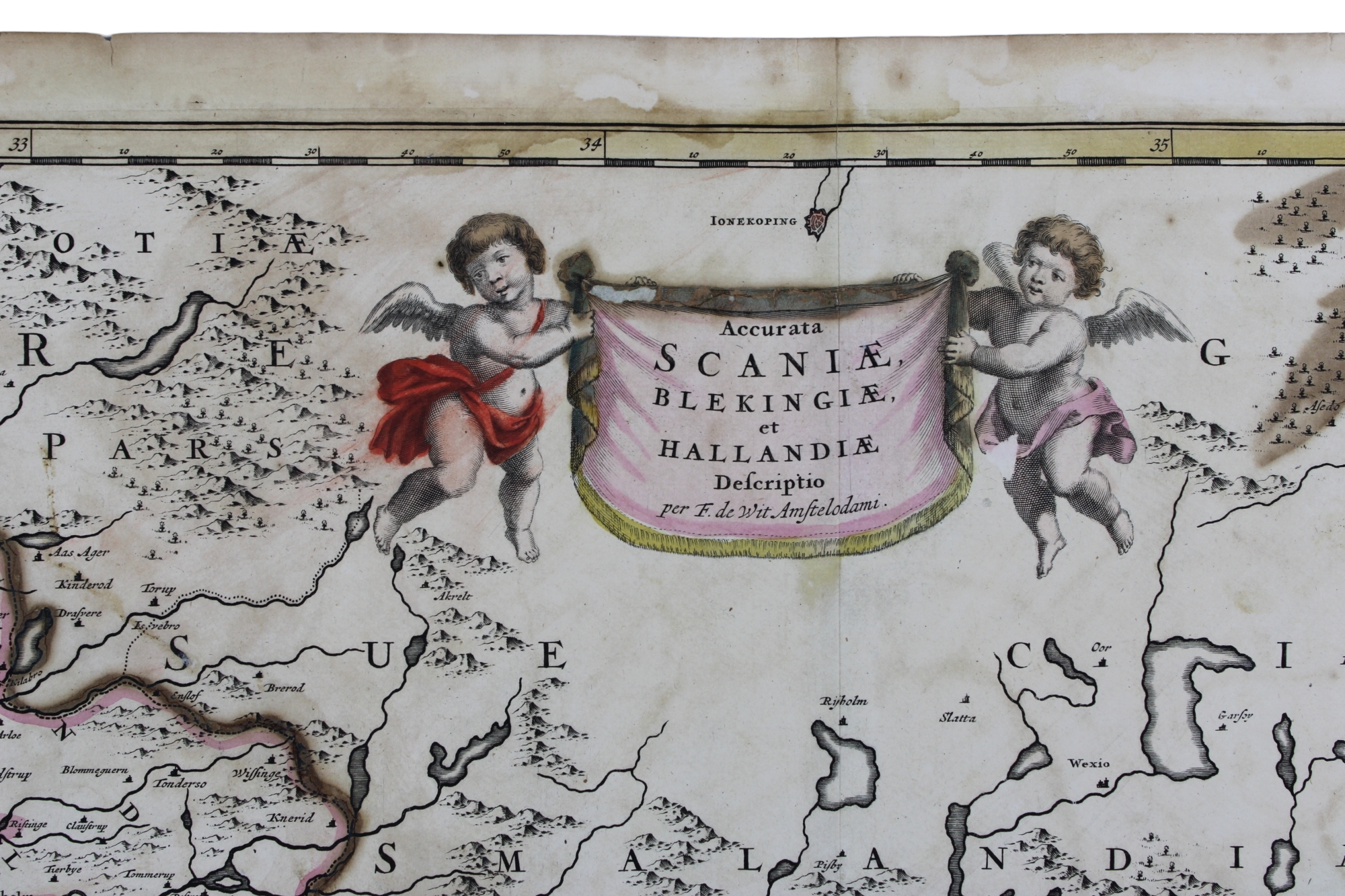 CARTINA GEOGRAFICA DE WITT Frederick (1630-1706) ( Svezia Olanda …) Accurata Scaniae Blekingiae et Hollandiae descriptio. Titolo in alto al centro entro cartiglio sorretto da puttini alati. Incisione rame coloritura originale d’epoca