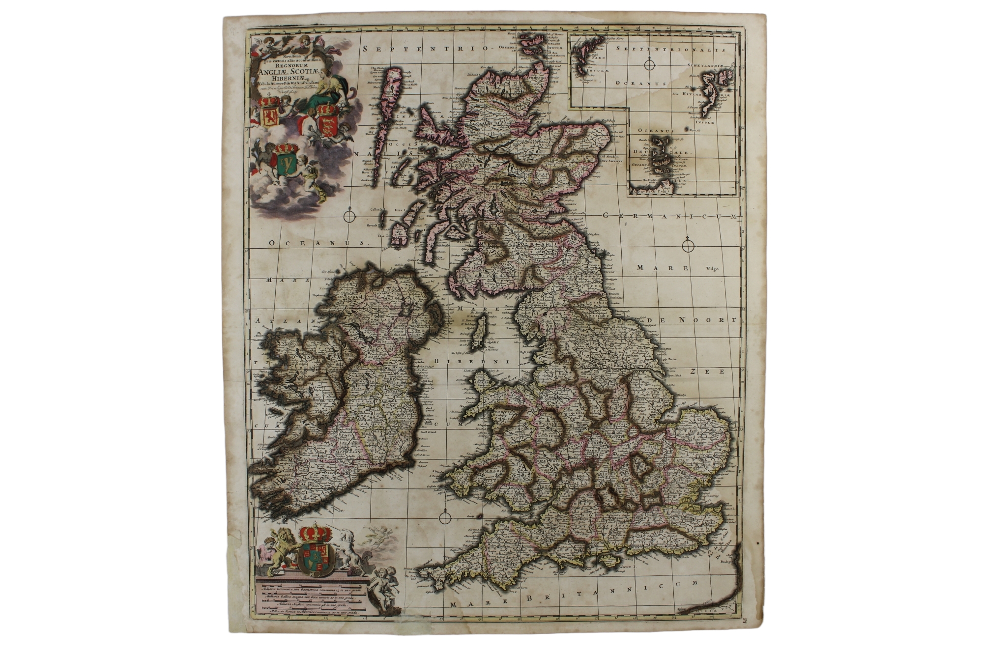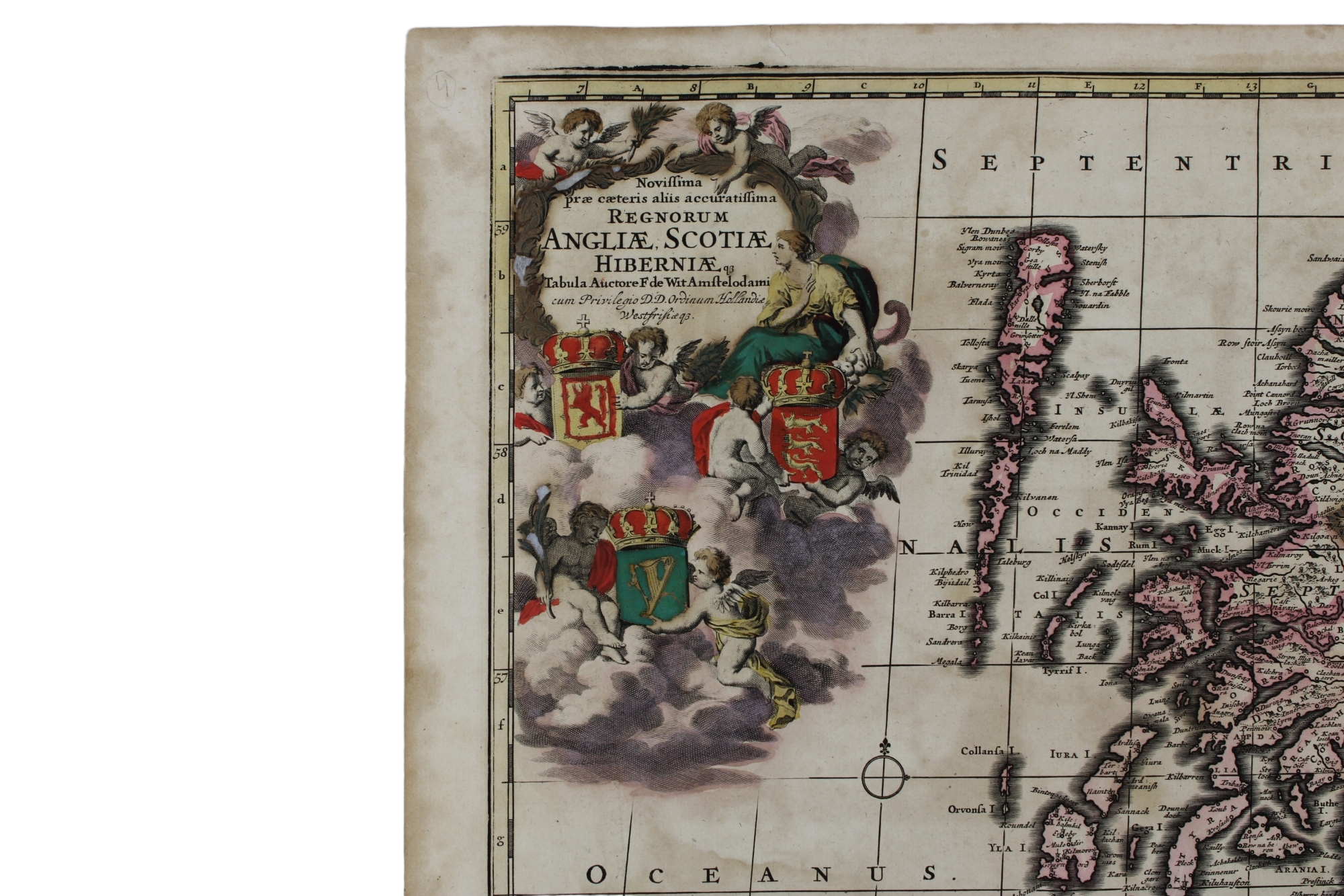 CARTINA GEOGRAFICA DE WITT (1616-1698) (Inghilterra Scozia Irlanda) Novissima prae ceteris aliis accuratissima RwgnorumAngliaeScotiaeHiberniae. Titolo in altro a destra riccamente decorato da puttini che sorreggono lo stemma dei tre Regni. Incisione rame coloritura originale d’epoca