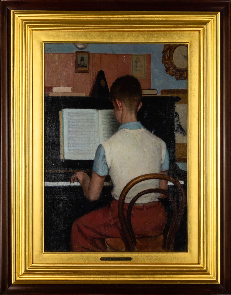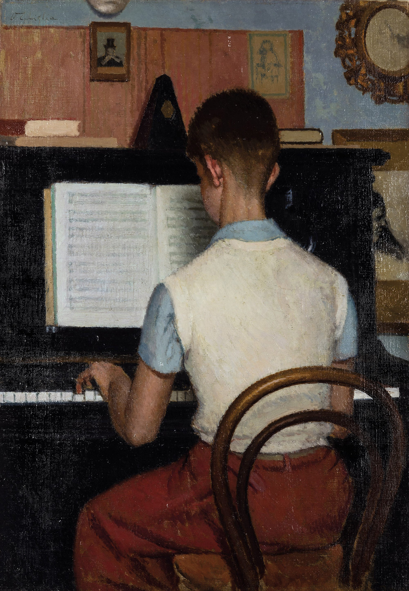 Il dipinto ritrae il figlio Benedetto intento a esercitarsi per la licenza di quinto anno al pianoforte, sostenuta nel 1935 al Conservatorio Luigi Cherubini di Firenze., Realizzata in due sedute successive, l'opera ha avuto una gestazione difficoltosa: Benedetto riferiva come durante la seconda seduta il padre, spazientito, si dichiarasse incapace di riannodare le fila del discorso e completare il lavoro. La ragione dell'impasse fu infine individuata: la pagina dello spartito era cambiata, e il numero dei pentagrammi sul foglio musicale non corrispondeva a quello del giorno precedente. L'aneddoto, oltre che una testimonianza delle notevoli capacità di osservazione del pittore, conferma una volta di più la necessità di organizzare ogni opera come una partitura mentale esattissima, sorretta da equilibri formali sottili e ineludibili. (Testo tratto da: Catalogo generale dei dipinti a cura di L. Ghiglia e S. Zampieri, Silvana Editoriale, Cinisello Balsamo, 2022, p. 405)