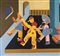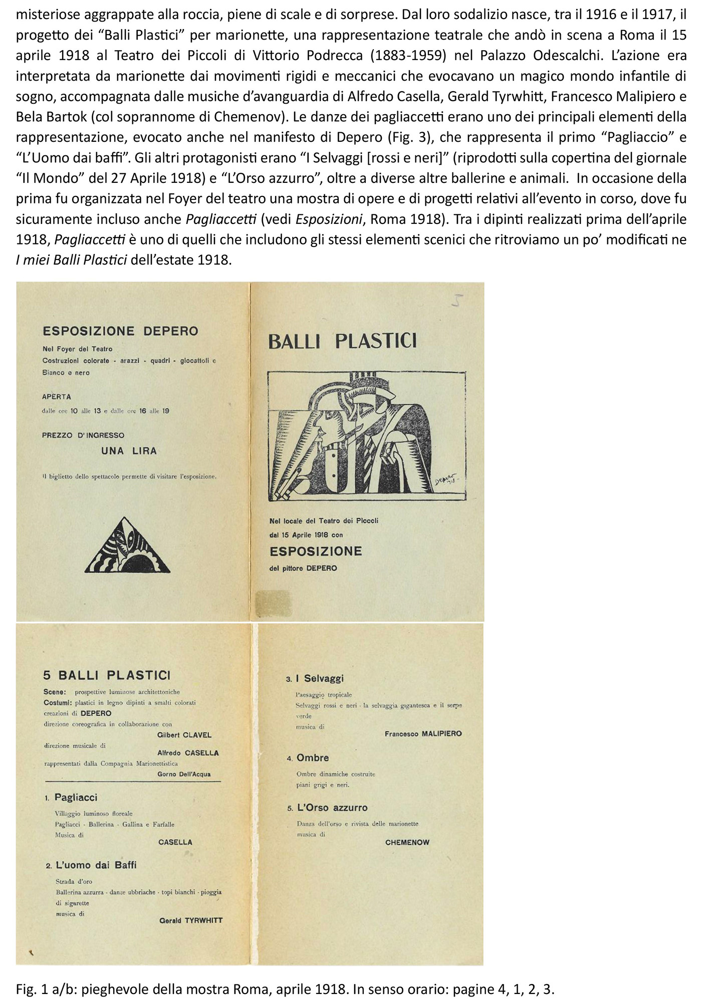Opera registrata presso l'Archivio Unico per il Catalogo delle Opere Futuriste di Fortunato Depero, Rovereto con il n. FD-0640-DIP e accompagnato da certificato di autenticità, Collezione privata, Milano, Nel 1917 Depero è a Capri, ospite del poeta svizzero Gilbert Clavel. Grazie al clima di Capri, ma soprattutto ai suoi tramonti – durante i quali si possono osservare tutte le possibili gradazioni dal giallo al viola – e alla luce diffusa del cielo e riflessa dal mare, Depero scopre tonalità nuove, prima sconosciute. È così che prende forma un nuovo, e per certi versi inedito, approccio cromatico alla realtà, che si traduce in una tavolozza più decisa e allargata nello spettro cromatico. Nel corso del soggiorno Depero e Clavel concepiscono i "Balli plastici", nei quali i ballerini sono sostituiti da marionette di legno che ballano su musiche d'avanguardia, e che andarono in scena nella primavera del 1918 al Teatro dei Piccoli di Roma. Il riferimento più immediato, specie per il personaggio centrale, sembra essere il dipinto-cartello pubblicitario che pubblicizzava lo spettacolo e che Depero ha realizzato in poche copie. In realtà, però, l'ambiente caprese in guisa di scenografia, ci fa pensare che questo dipinto anticipi e preannunci lo spettacolo proprio in quanto momento di pre-visione del suo progetto scenografico., Dal testo di Maurizio Scudiero nella relativa archiviazione
