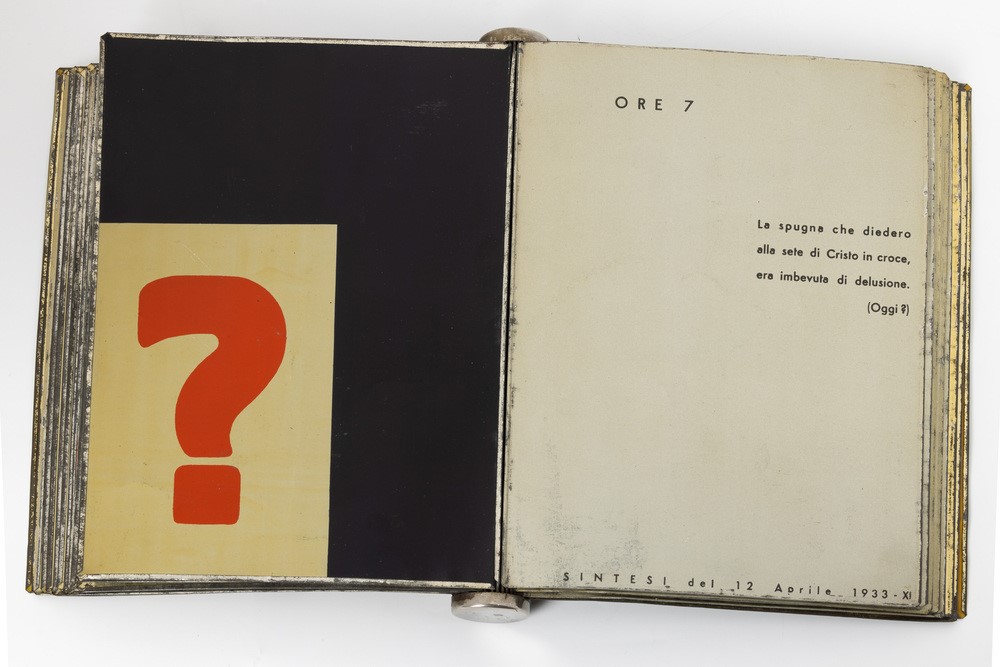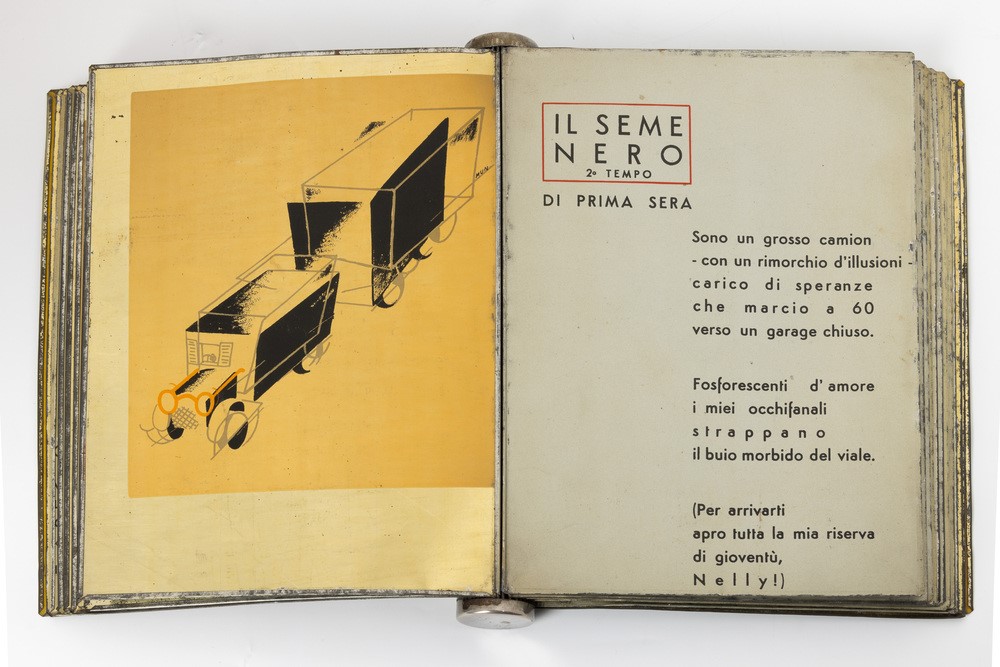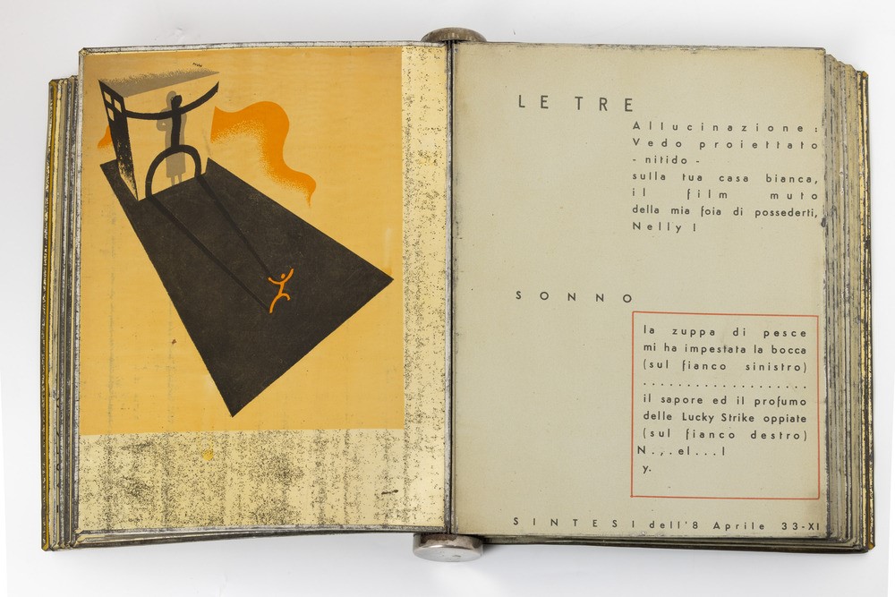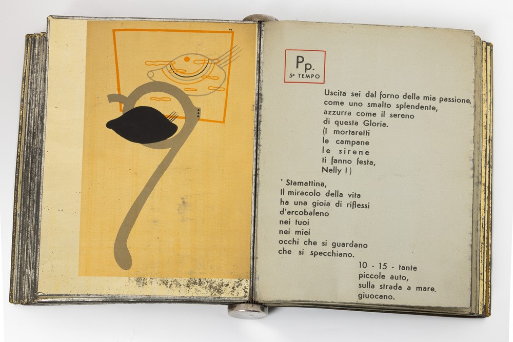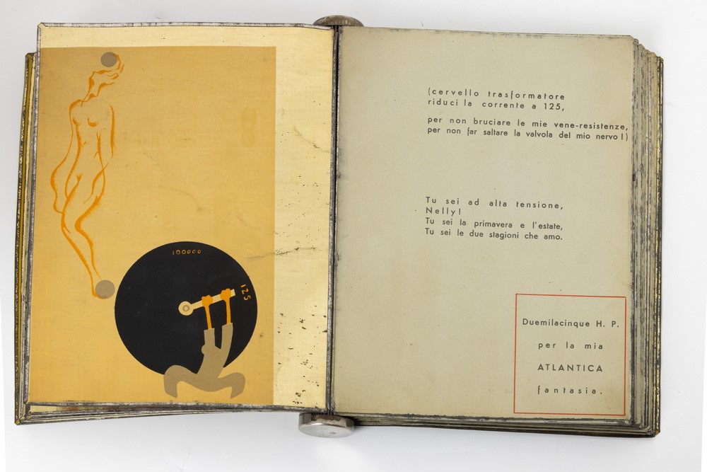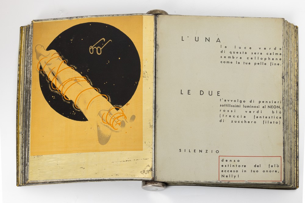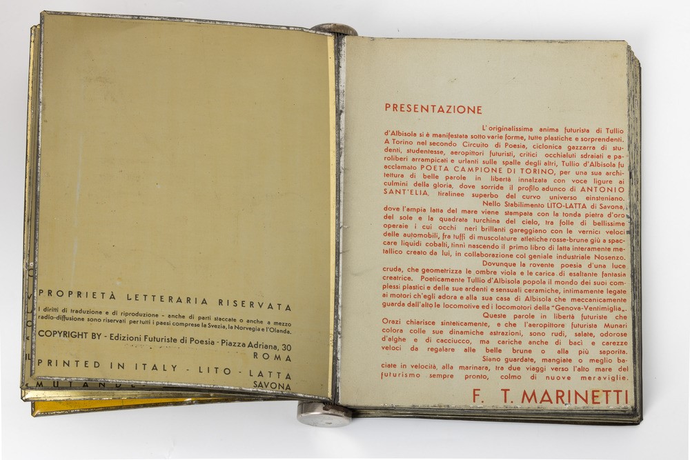 legatura costituita da un cilindro metallico con fogli stampati su latta litografata, copertina disegnata da Bruno Munari, Edizioni Futuriste di “Poesia”, Roma, Tiratura di 101 esemplari, lito-latta