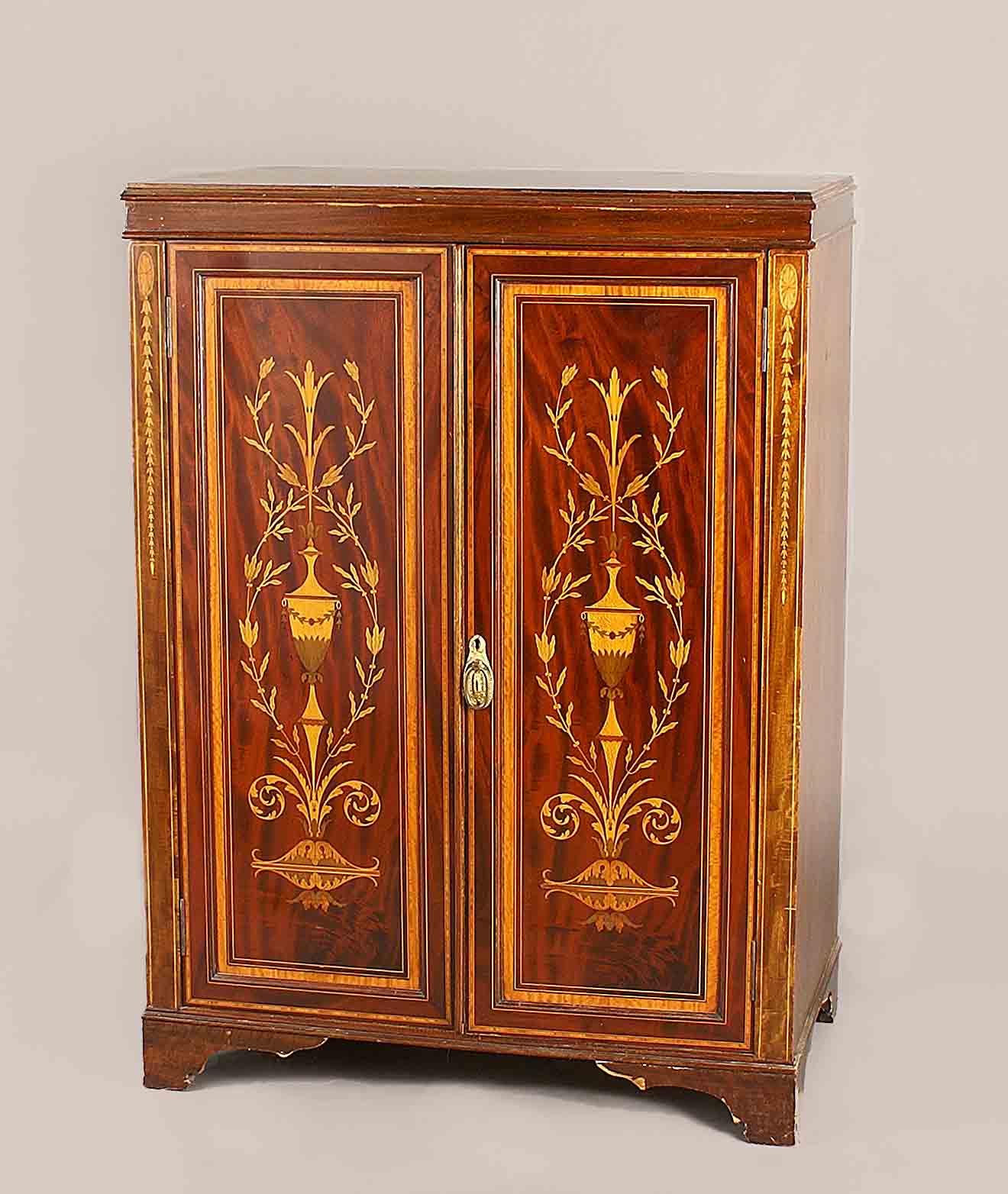 Credenza in mogano filettato in satinwood, piano rettangolare con due sportelli intarsiati a motivi neoclassici, piedi a mensola, Inghilterra, fine del XIX secolo, cm. 120x87x54.