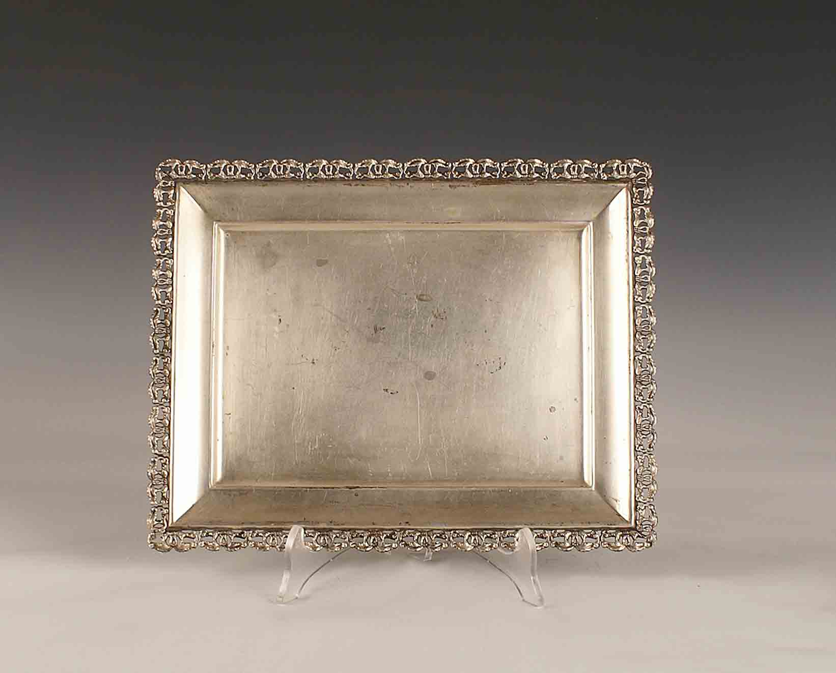 Salver in argento di forma rettangolare con profilo traforato e poggiante su quattro piedini, gr. 575.