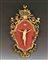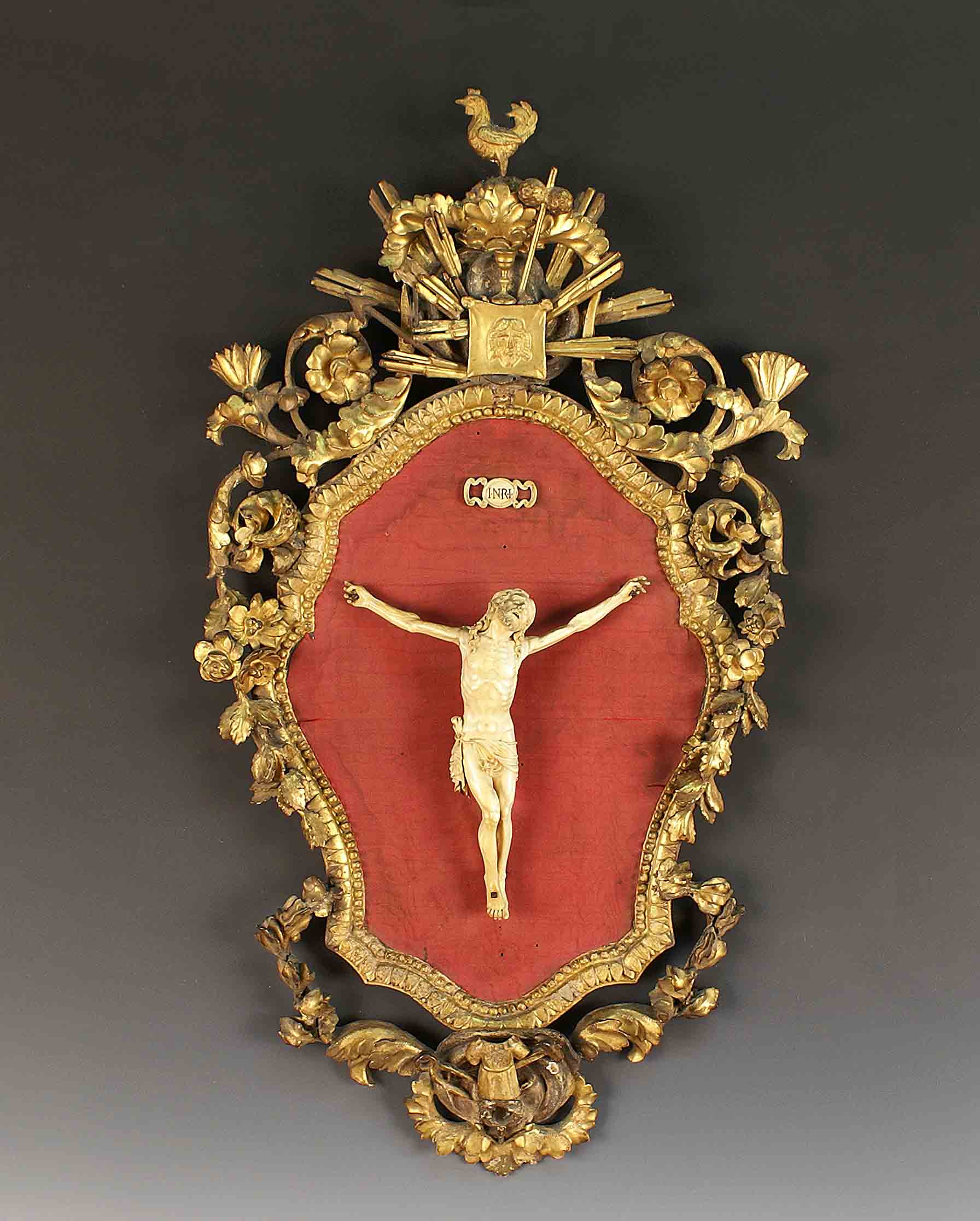 Scultura in avorio raffigurante Cristo crocifisso, entro cornice in legno dorato, sagomata e riccamente intagliata a motivo floreale e vegetale, cimasa sormontata da un gallo, Francia, XIX secolo, cm. 70x36.