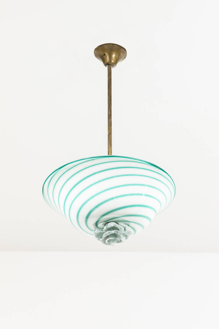 Lampada a sospensione in vetro lattimo e strisce in vetro colorato, tige in ottone.