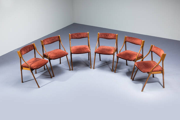 Sei sedie con struttura in legno di noce, sedili e schienali imbottiti rivestiti in velluto.