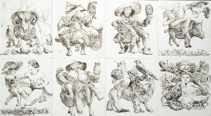 Tutti i disegni sono firmati e intitolati con i nomi dei vizi capitali, tranne l'ultimo in basso a destra intitolato "surfanturia"