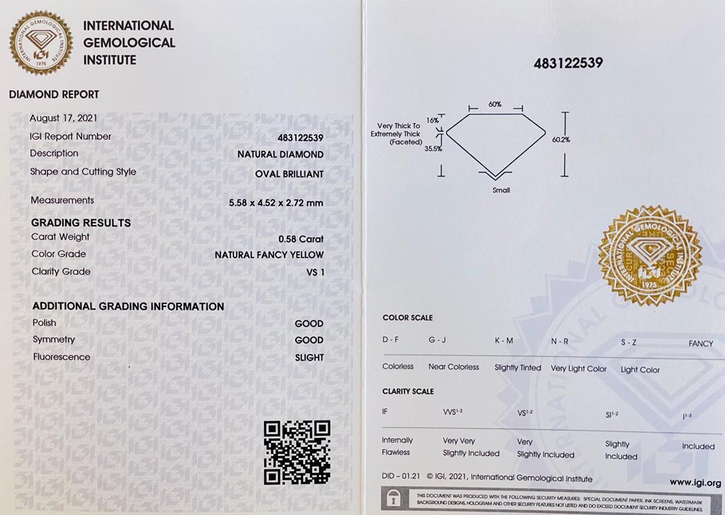 DIAMANTE 0,58 CT FANCY GIALLO - PUREZZA VS1 - TAGLIO OVALE - CERTIFICATO IGI - Rs20801
