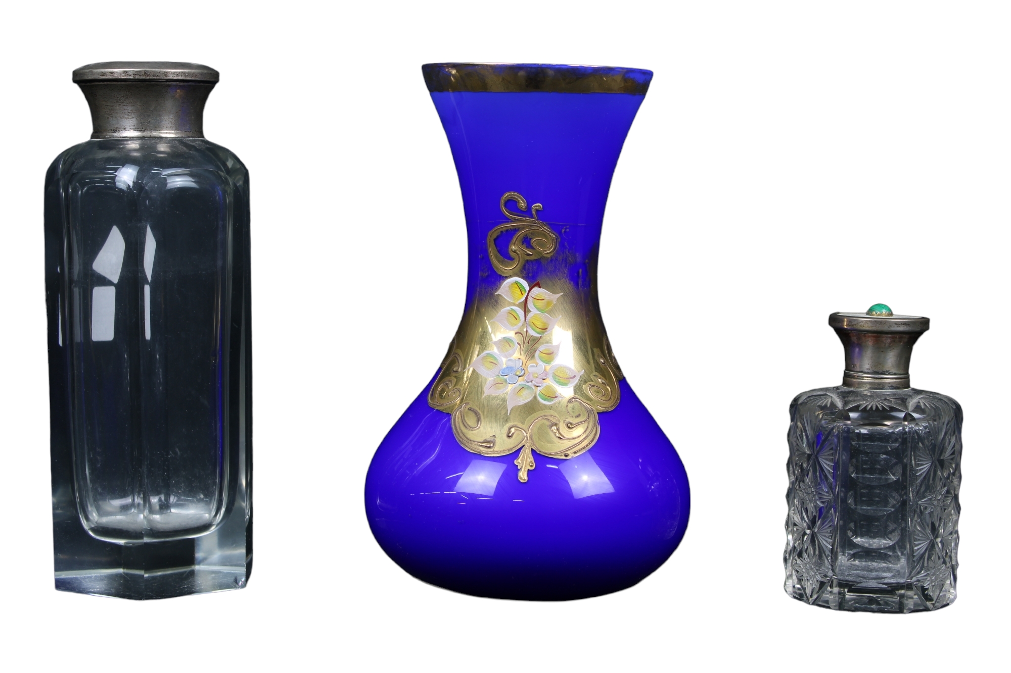 1 VASO in opaline blu e 2 BOTTIGLIE in vetro h cm 26 / h cm 25 / h cm 14
