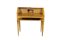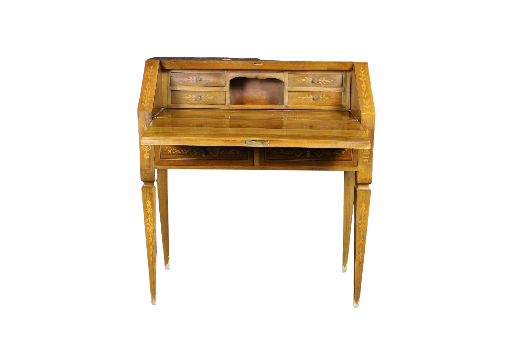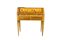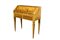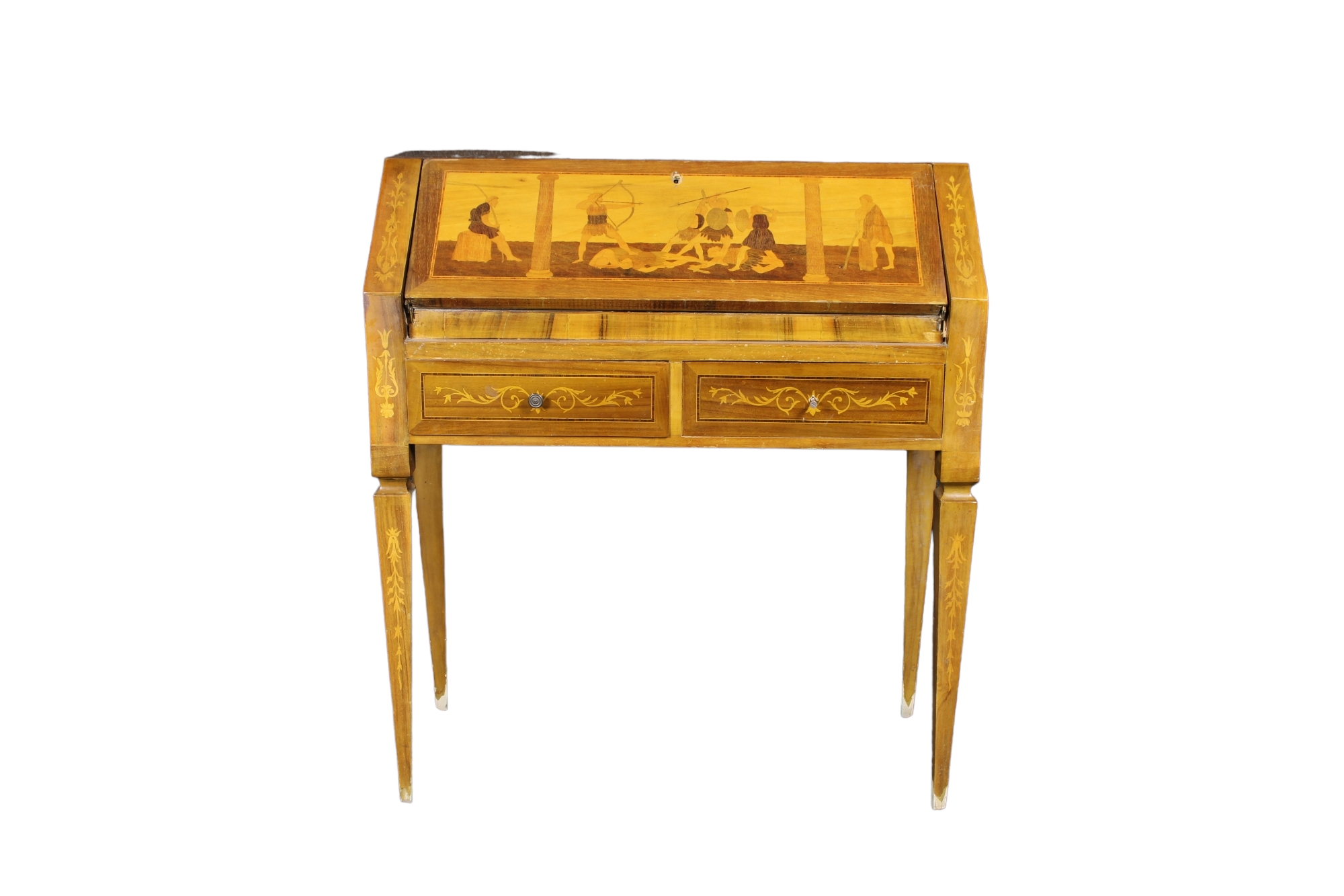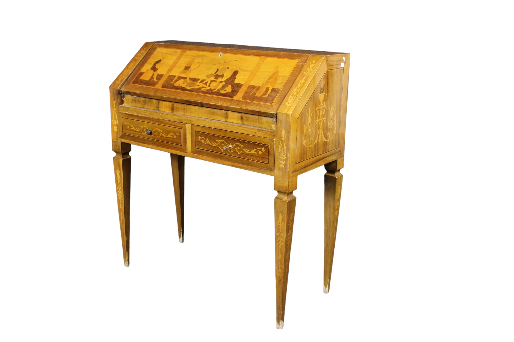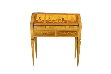in noce, ricca di intarsi raffigurante scene di vita in essenze varie sostenuta da gambe a spillo Italia XX secolo h cm 89 x 81 x 35