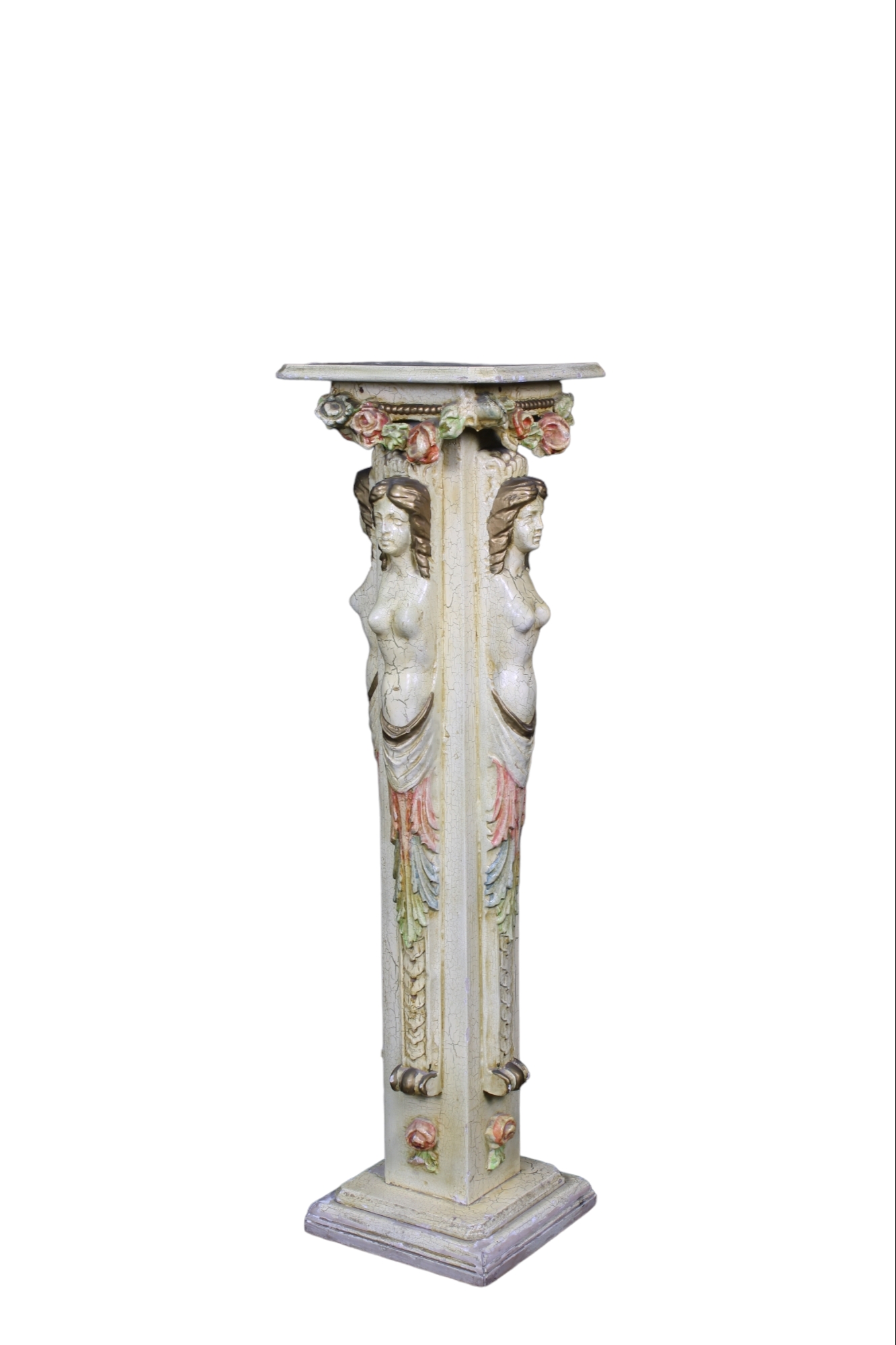in legno laccato e arricchito da cariatidi e festoni fioriti in alto rilievo Italia XX secolo h cm 98 x 27 x 27