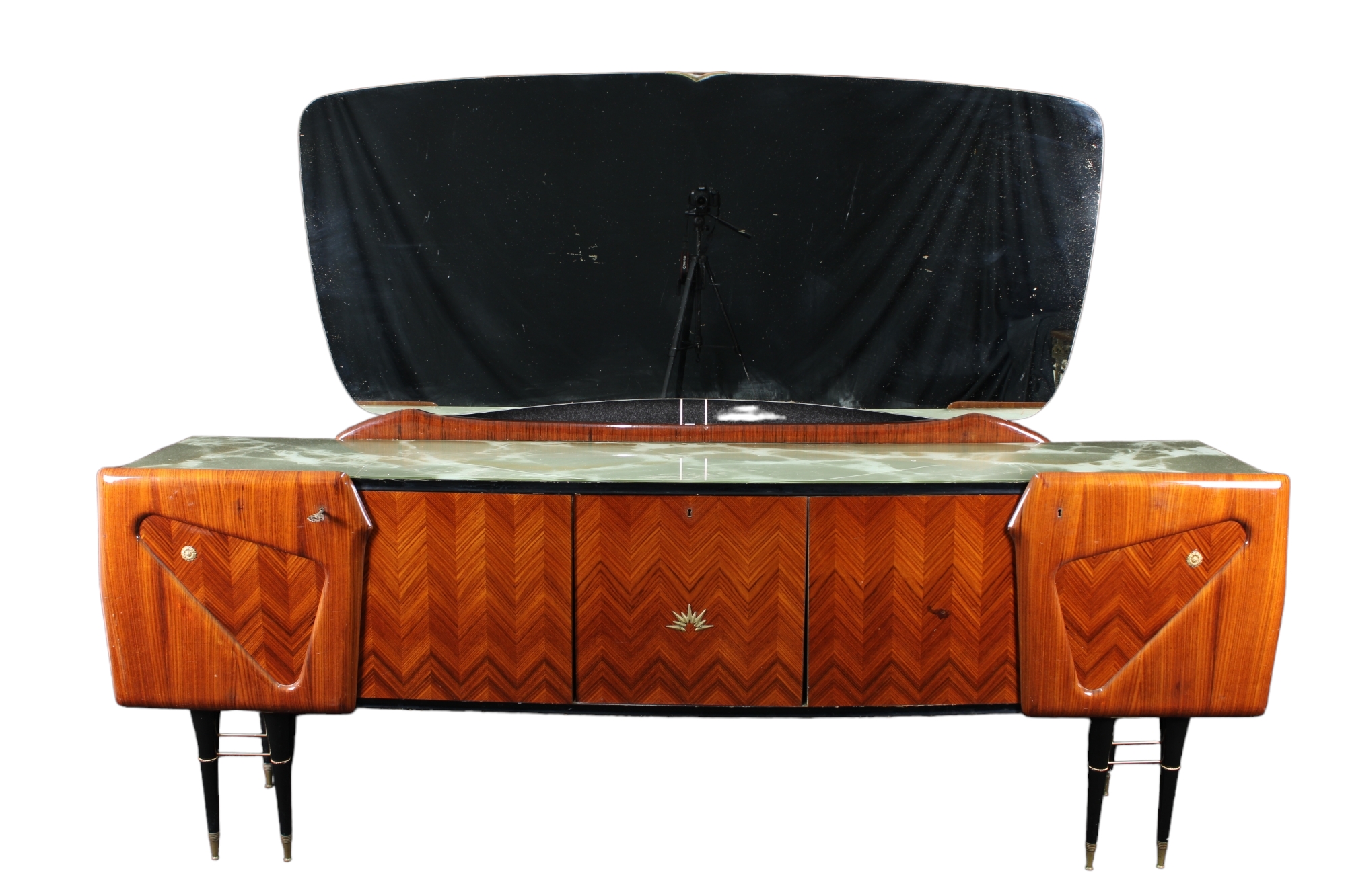 in varie essenze con specchiera, piano in vetrolite Italia anni 60 h cm 173 x 244 x 50